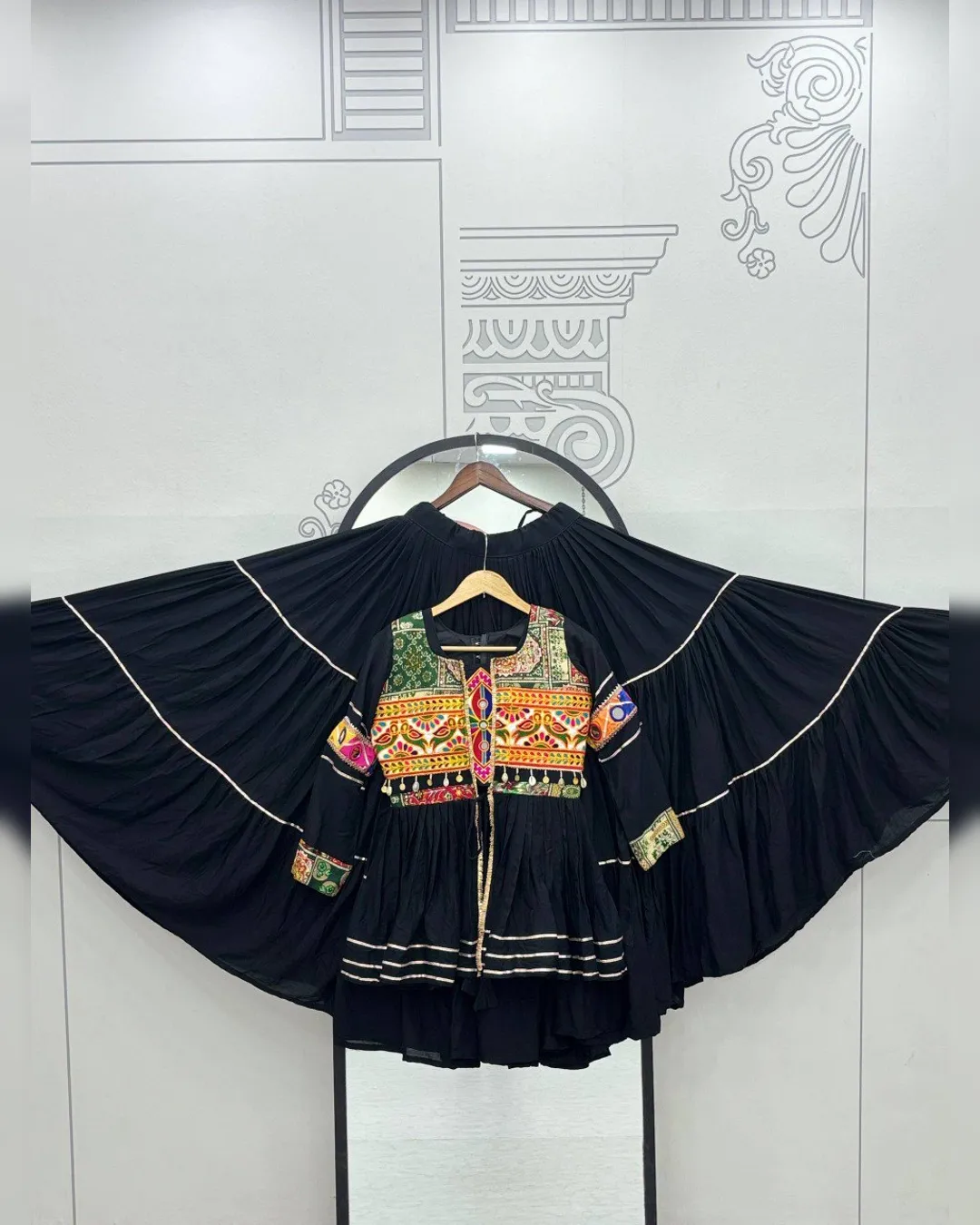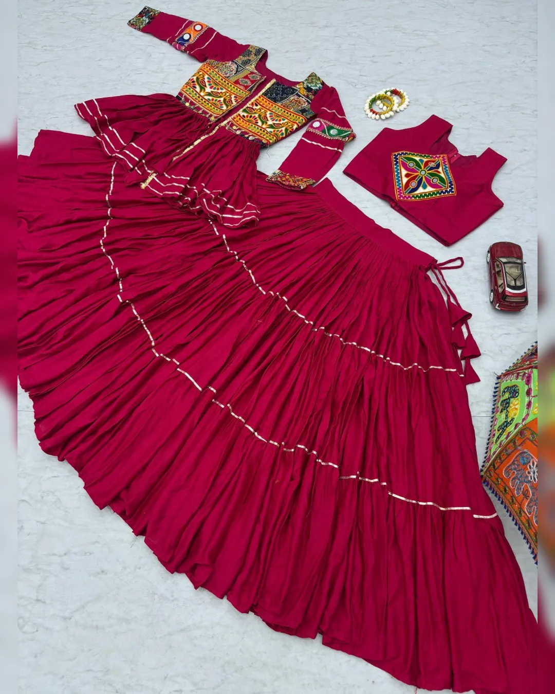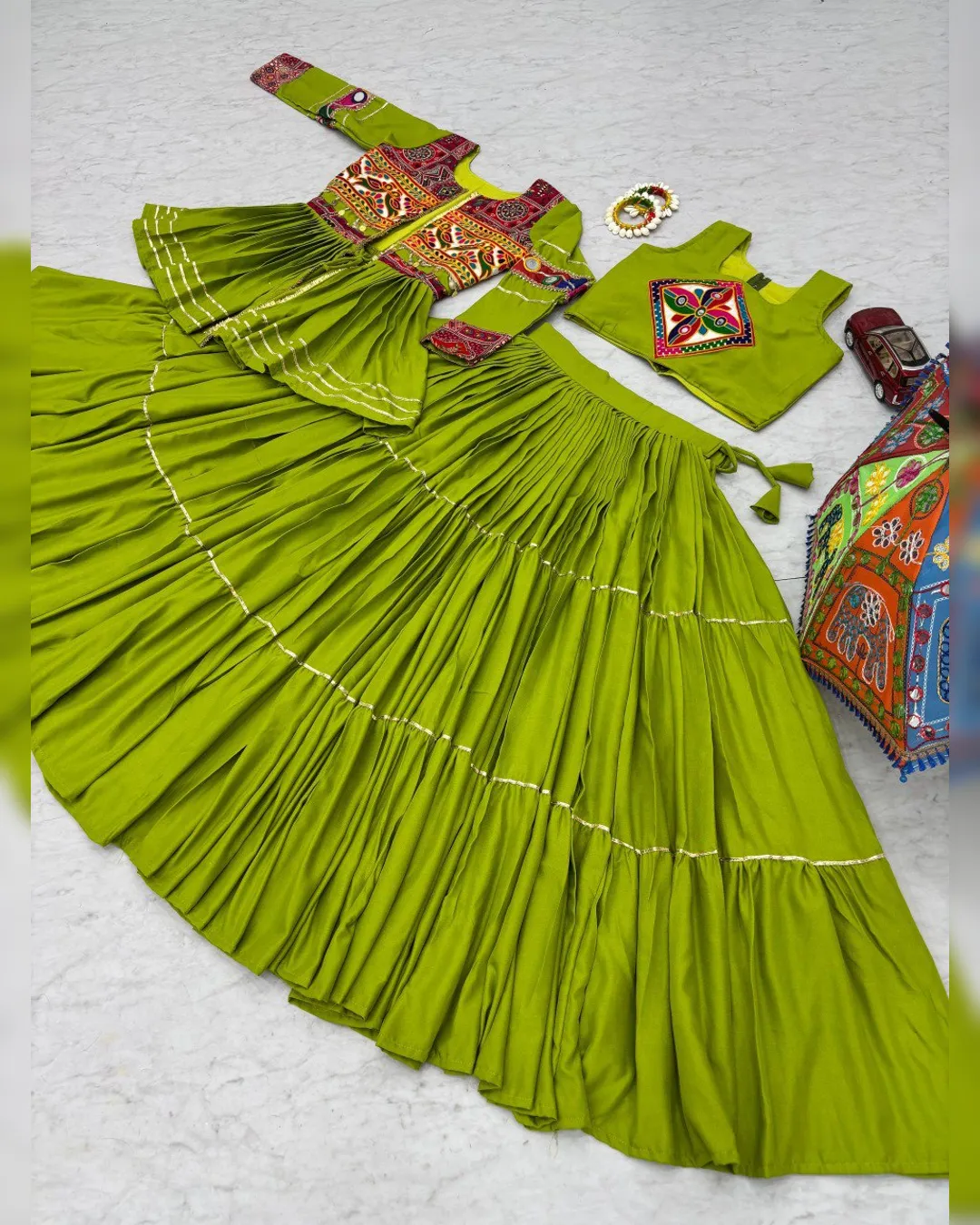 Navratri special pure cotton lehenga choli set with heavy Gamthi and ribbon lace work, fully stitched choli, lehenga with 9m flair, and embroidered koti.