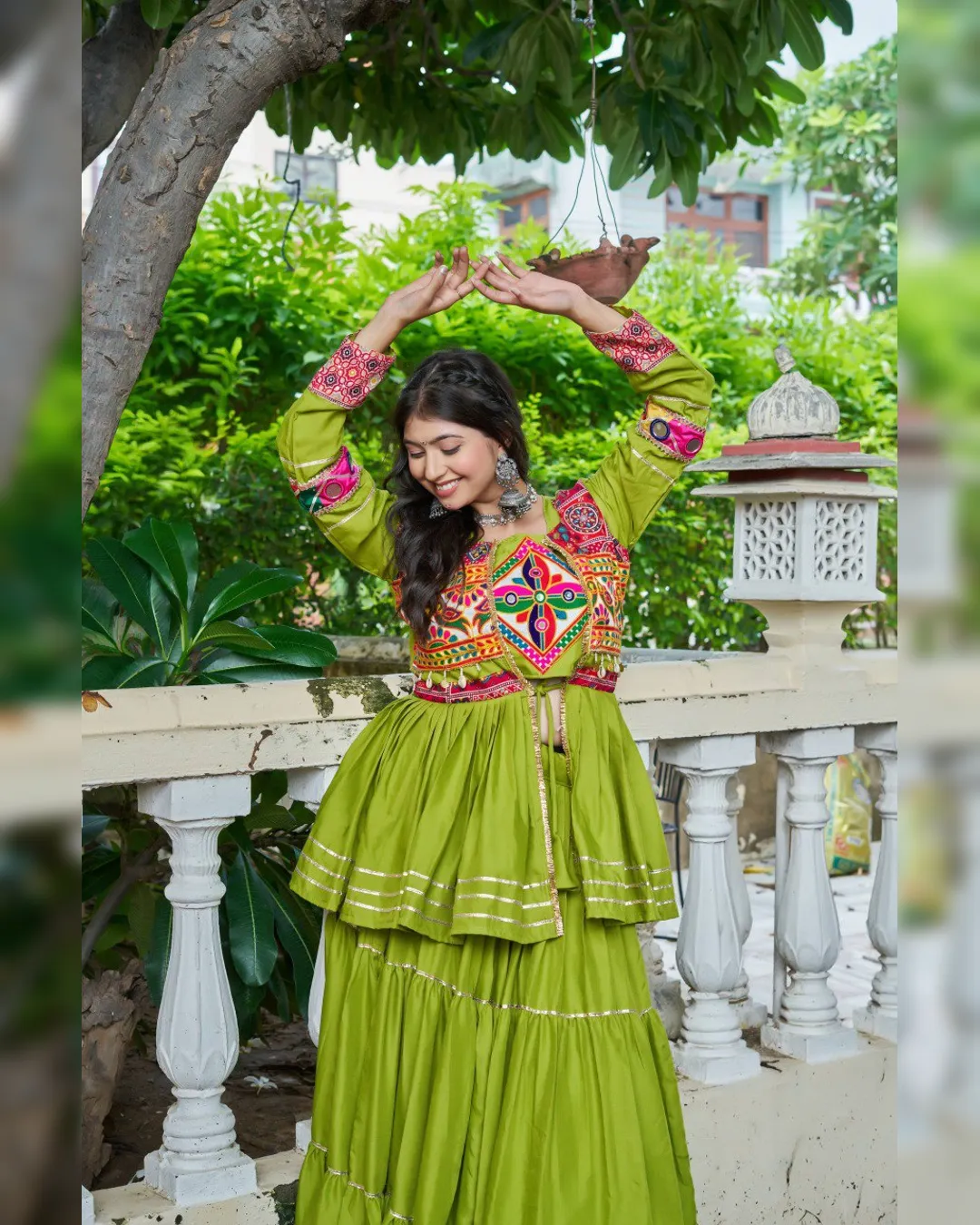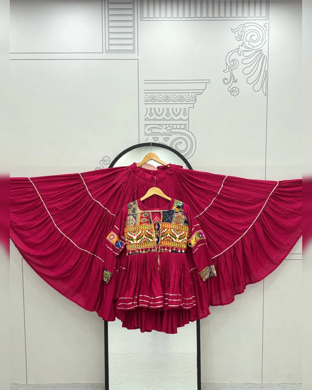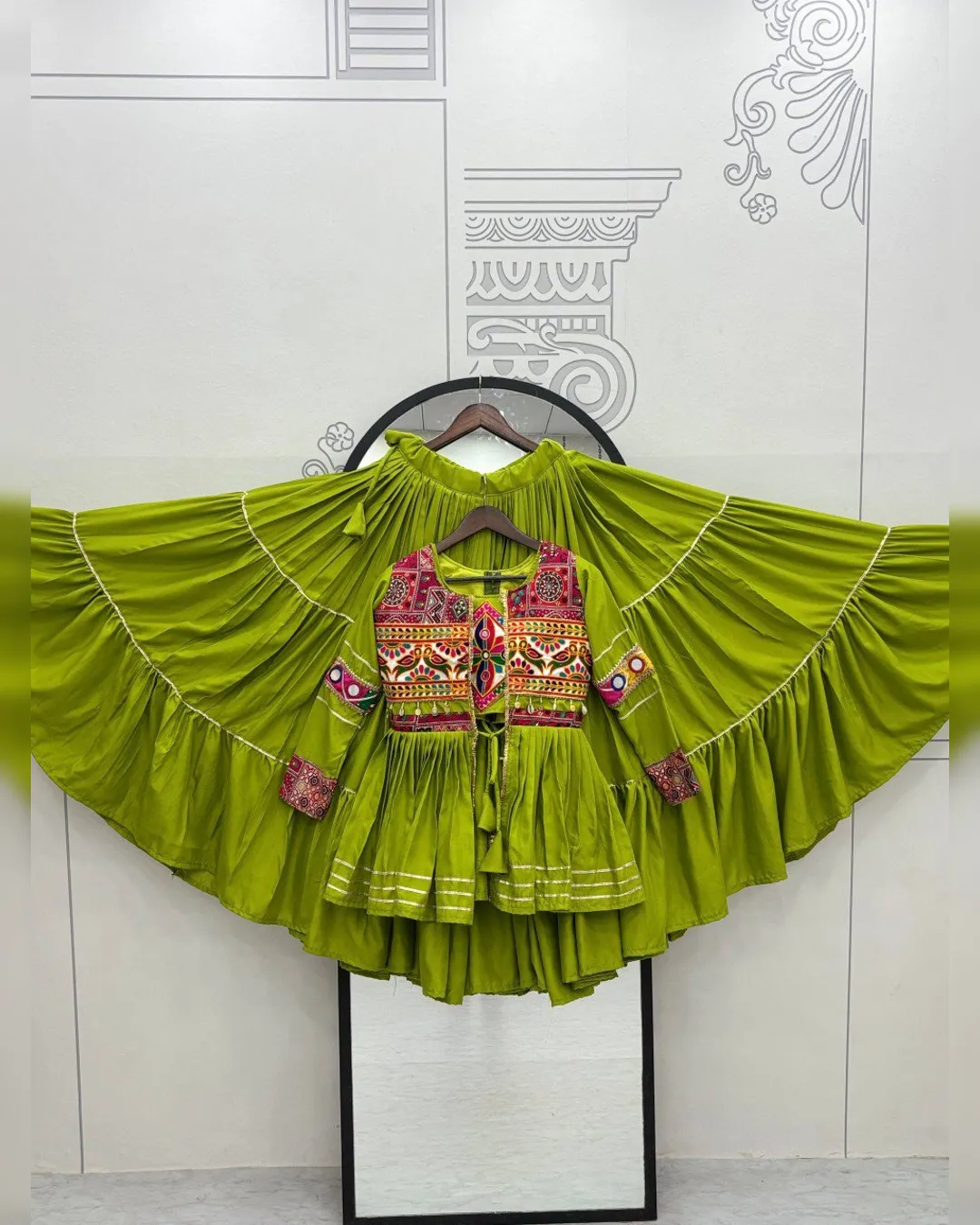 Navratri special pure cotton lehenga choli set with heavy Gamthi and ribbon lace work, fully stitched choli, lehenga with 9m flair, and embroidered koti.