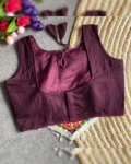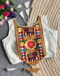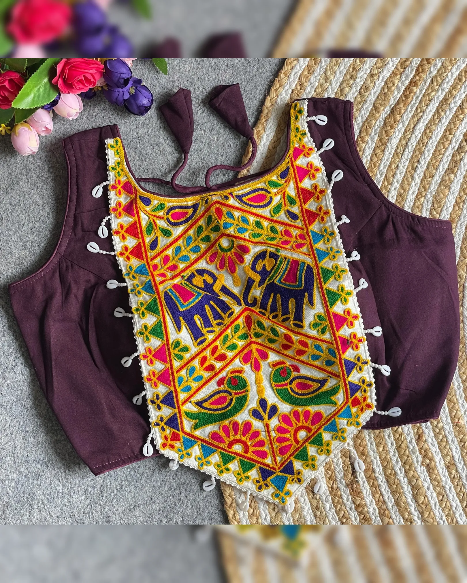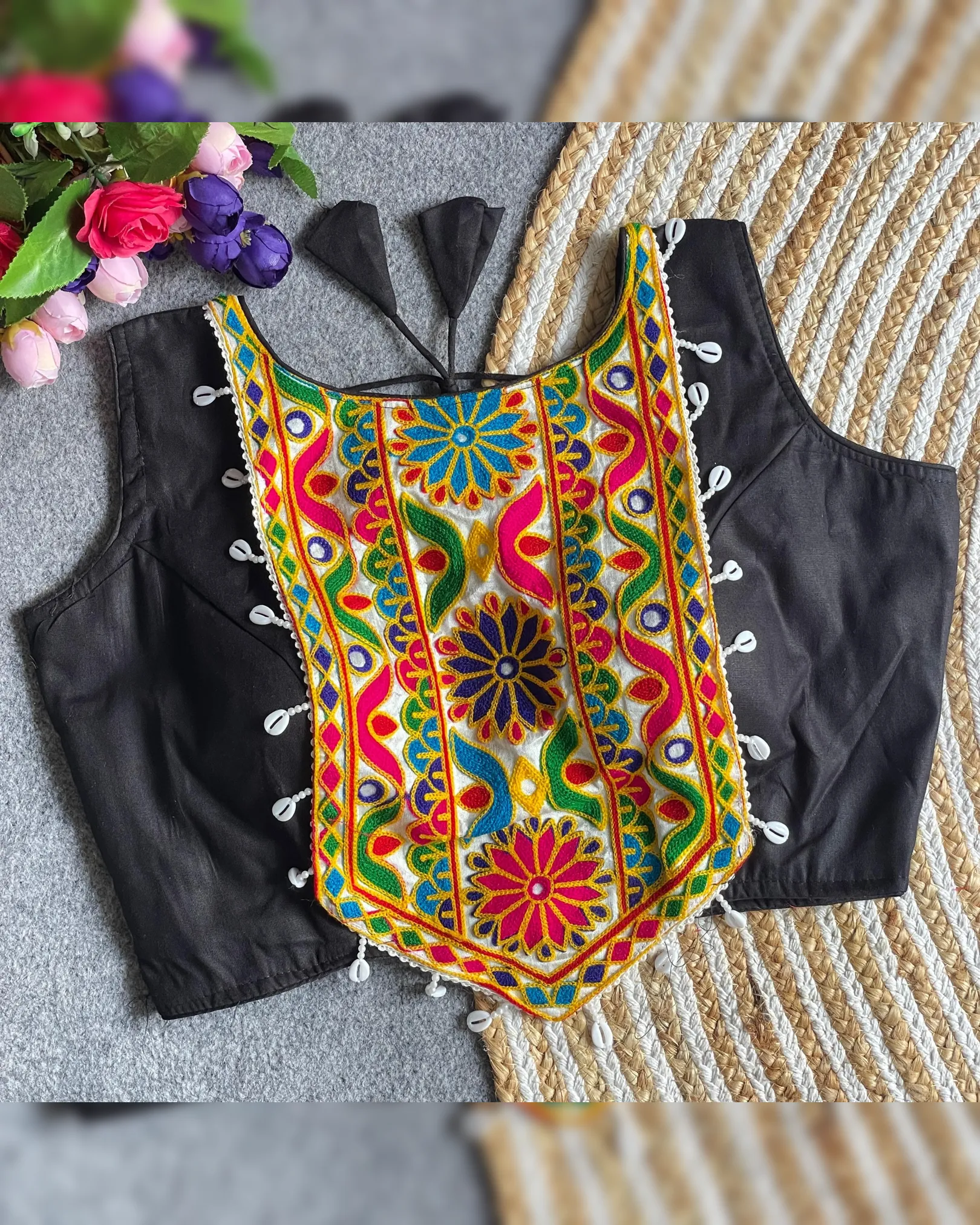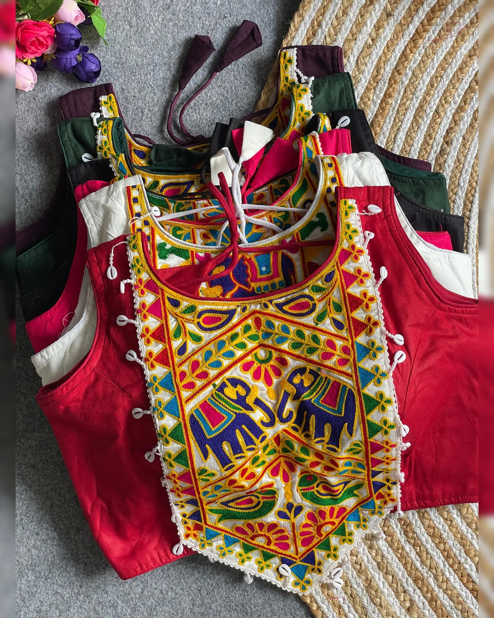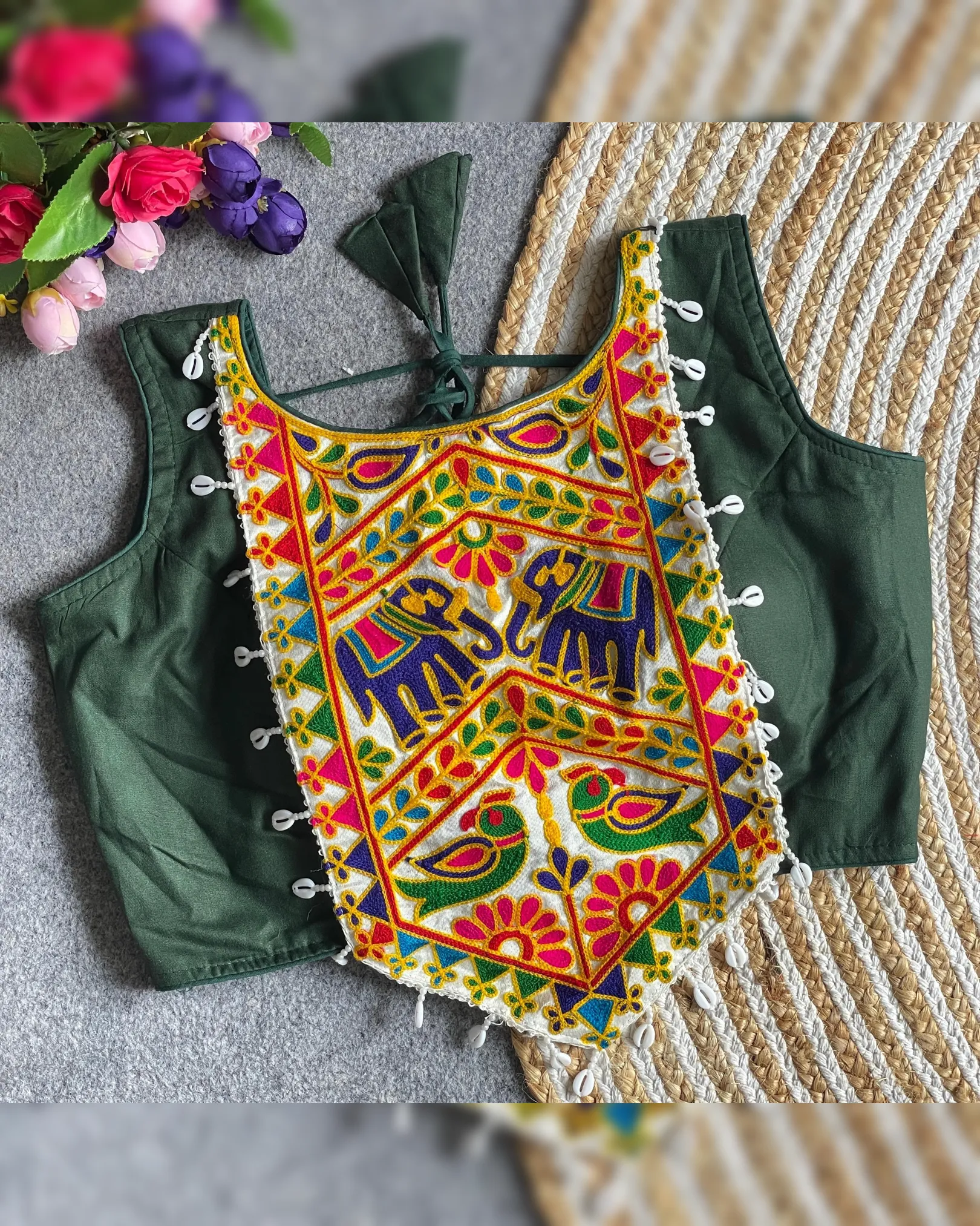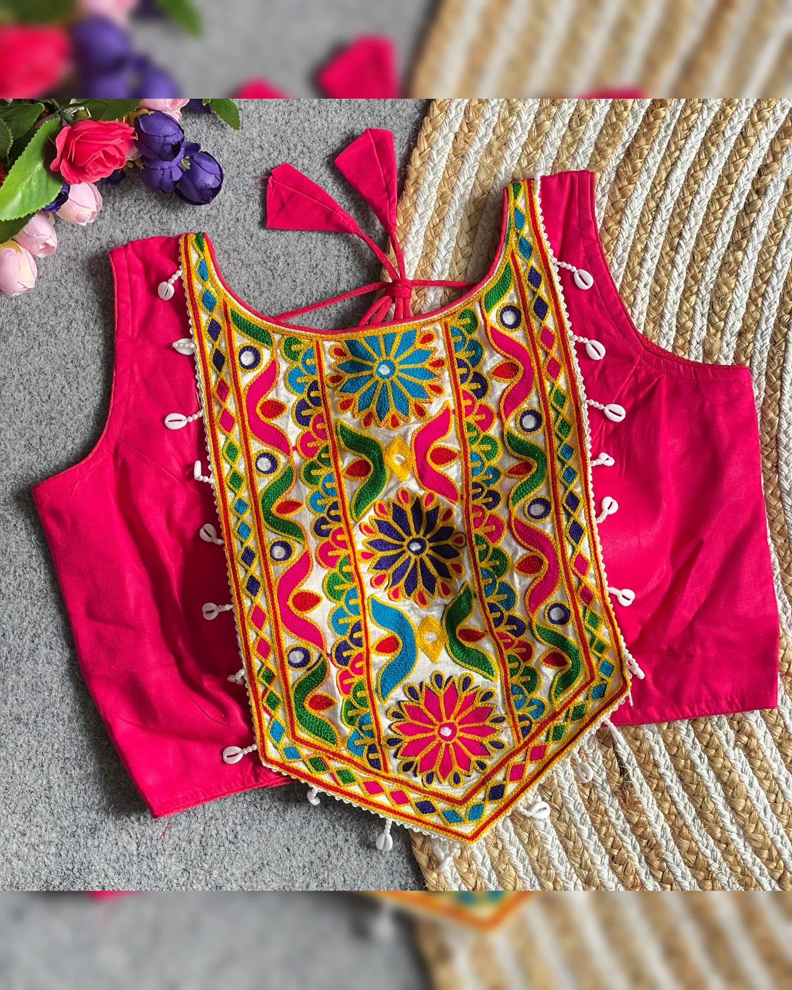 Real shell (kaudi) blouse in magic cotton with heavy embroidery, padded & back-open design – perfect for Navratri looks.