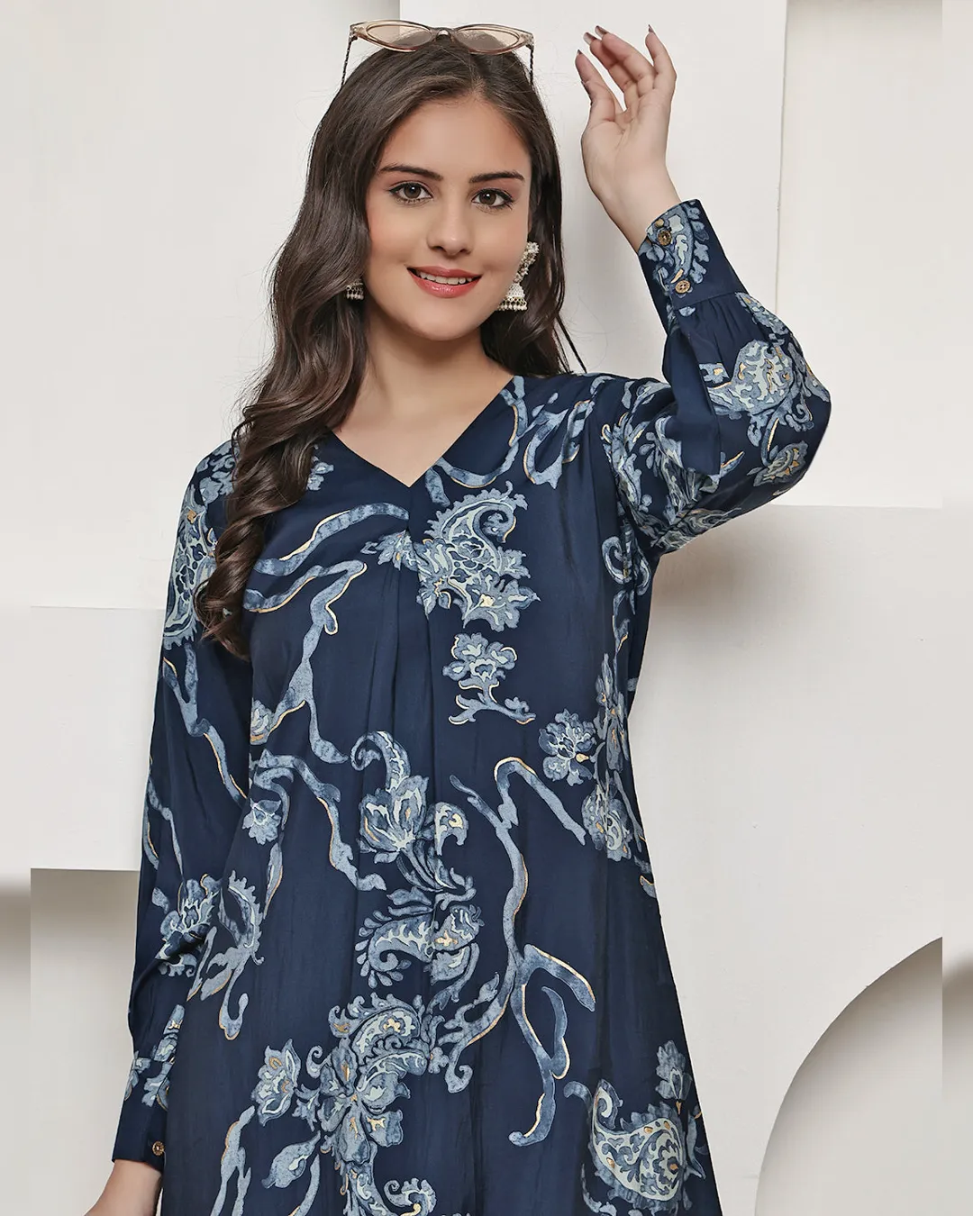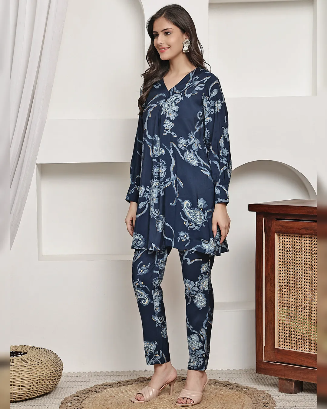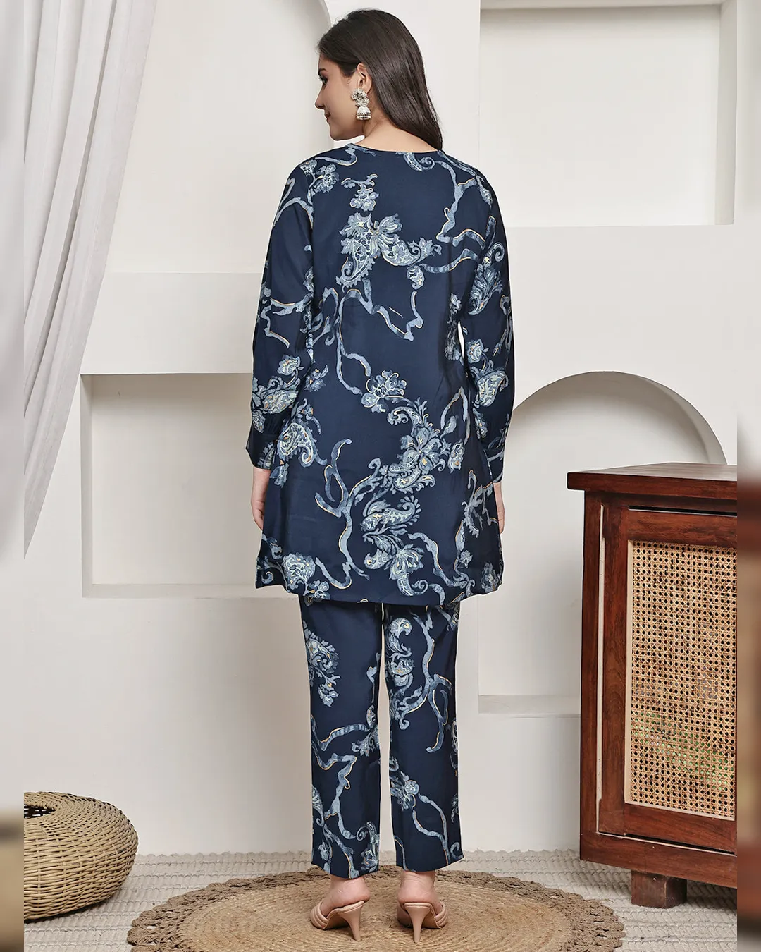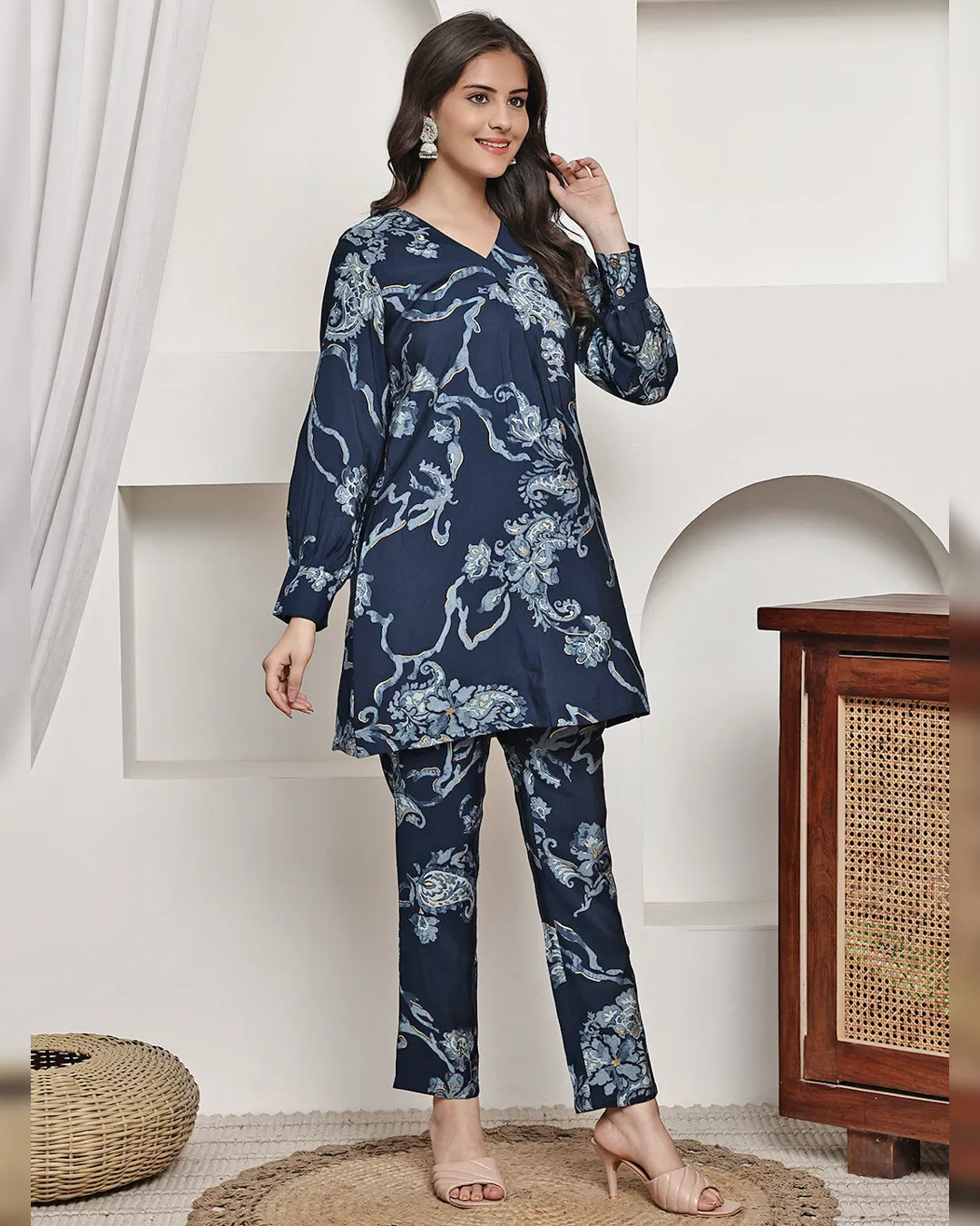 Navy blue floral printed Chanderi silk co-ord set with v-neck tunic and elasticated trousers—comfort meets style for casual occasions.