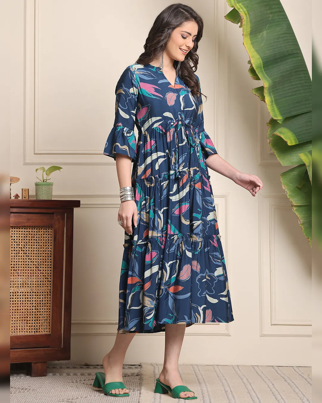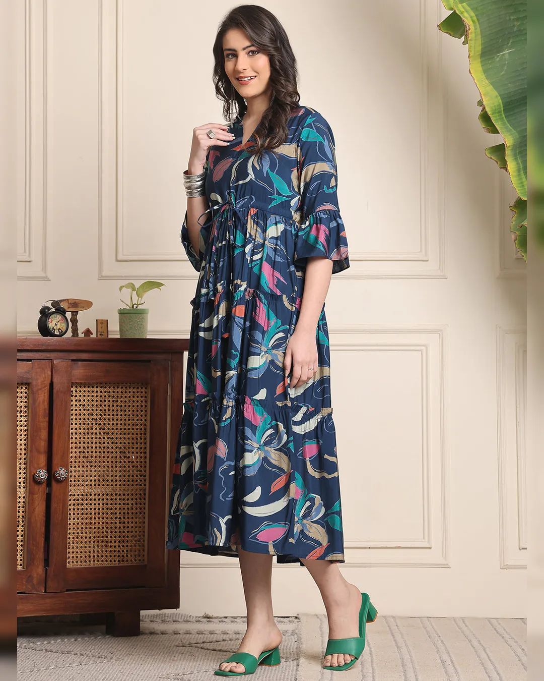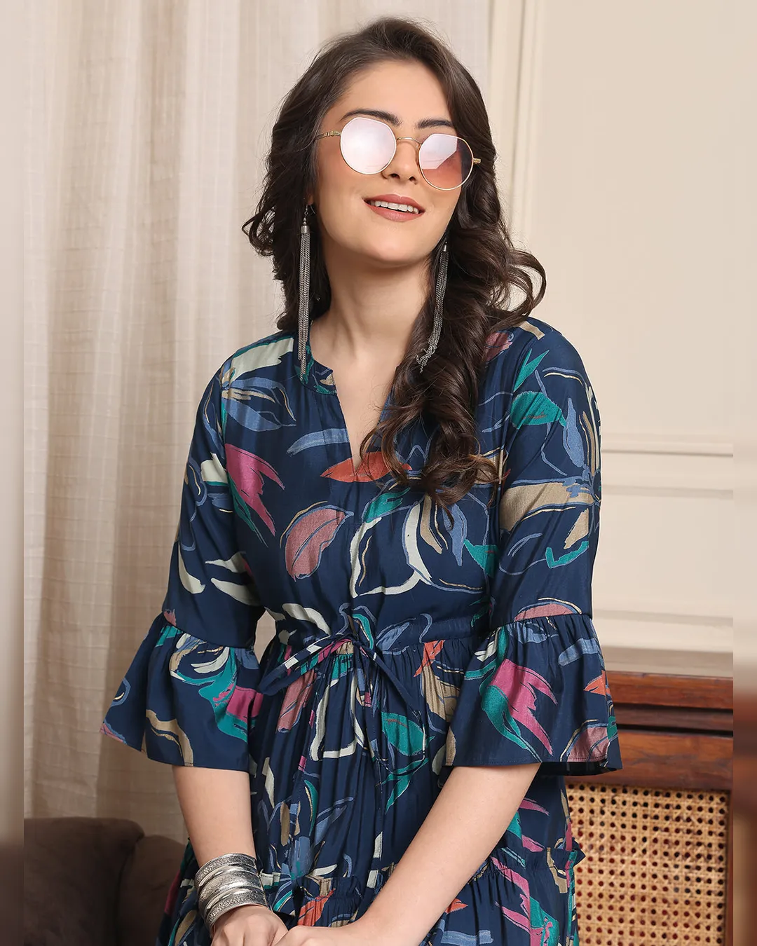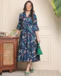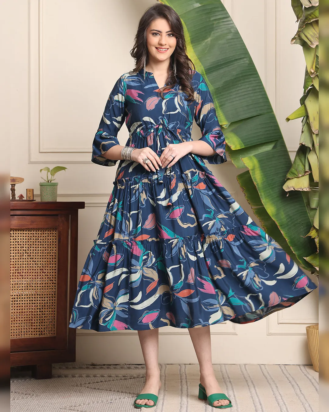 Elevate your ethnic wardrobe with this navy blue floral printed maxi dress crafted in premium Chanderi silk. The dress features a flattering fit and flare silhouette, a sophisticated mandarin collar, and elegant three-quarter sleeves. Its midi-length flared hem adds a touch of grace, making it perfect for festive gatherings, casual celebrations, or day-to-day ethnic wear.