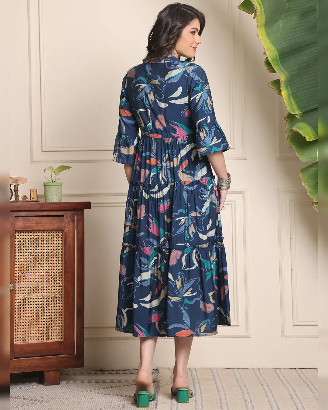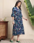 Navy blue floral printed Chanderi silk maxi dress with mandarin collar and 3/4 sleeves—graceful and elegant for any casual ethnic look.