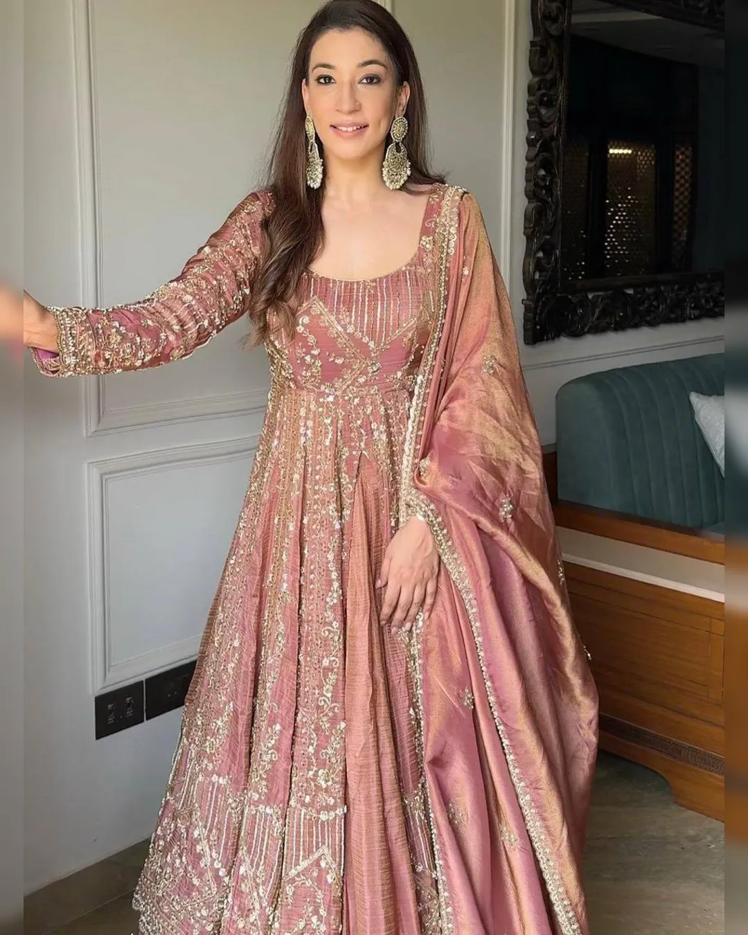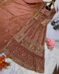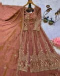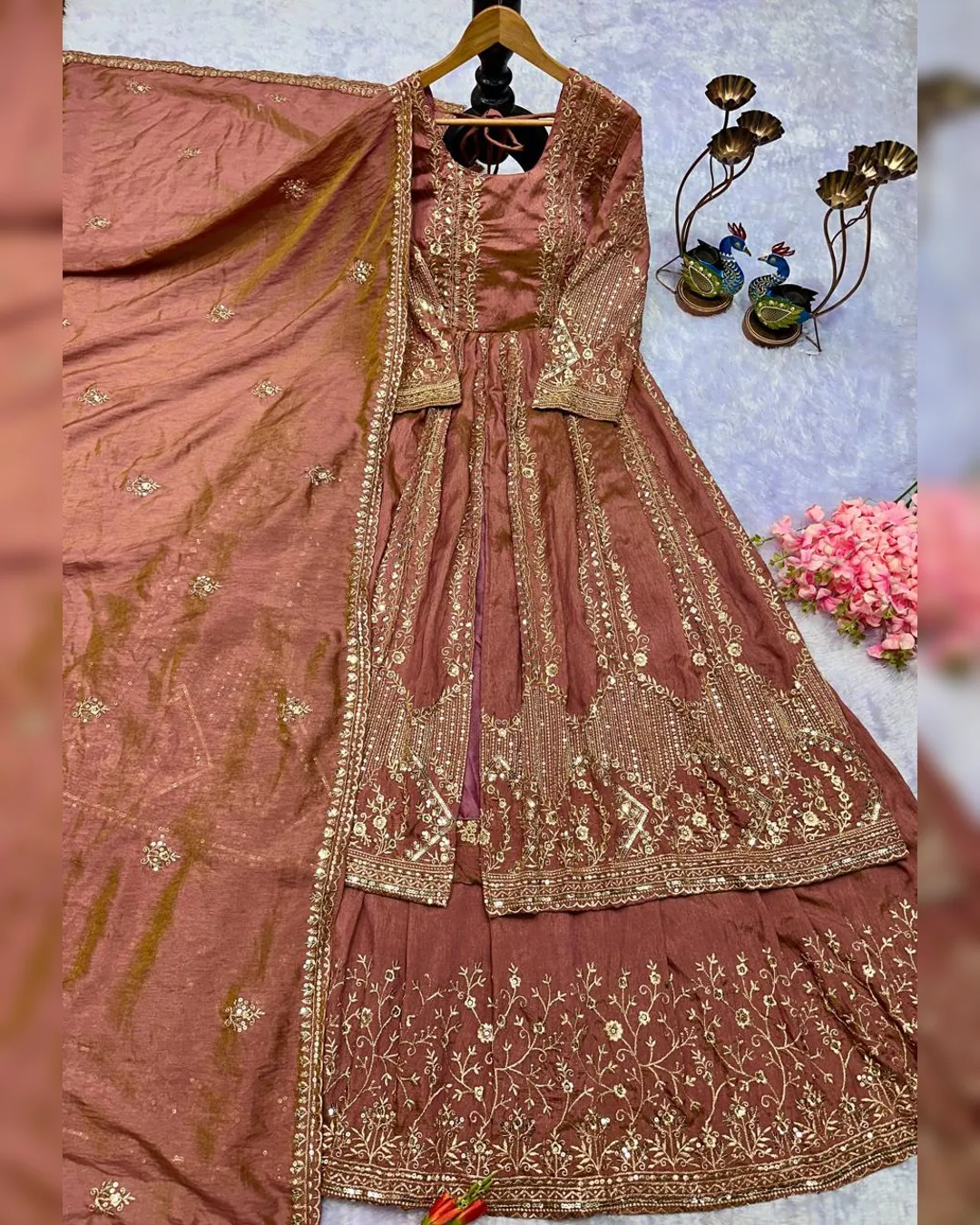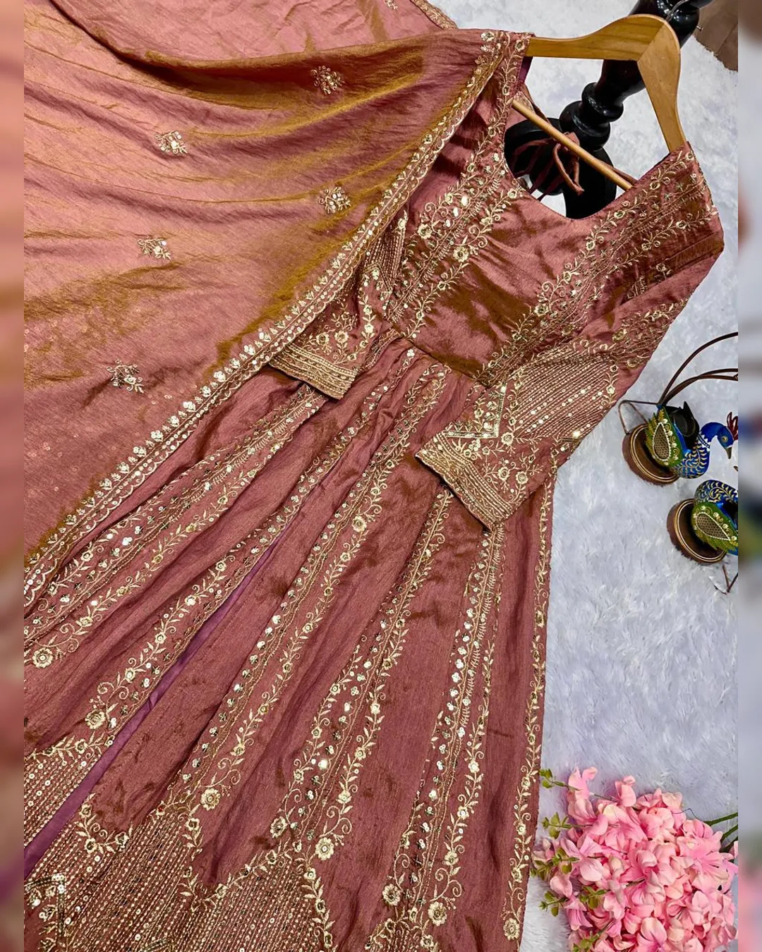 Launching a stunning designer party wear ensemble that beautifully blends gown elegance with lehenga charm! Crafted in premium heavy crunchy silk, this unique set features exquisite embroidery work throughout – making it a show-stopping choice for festive functions, receptions, and weddings.