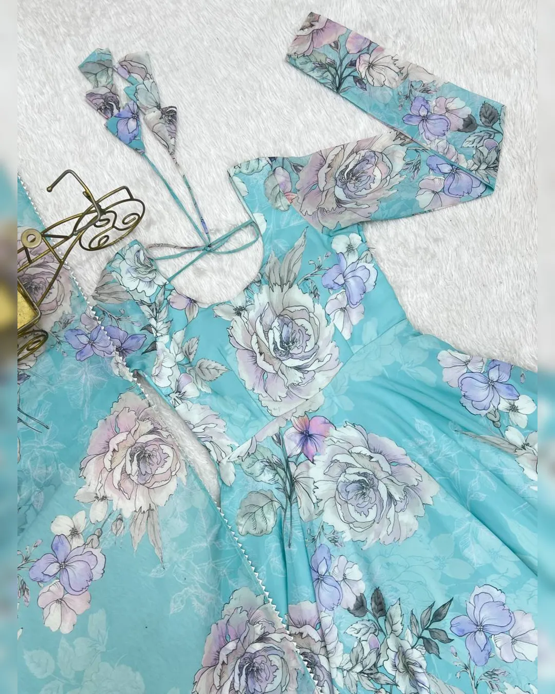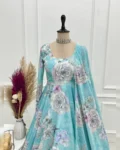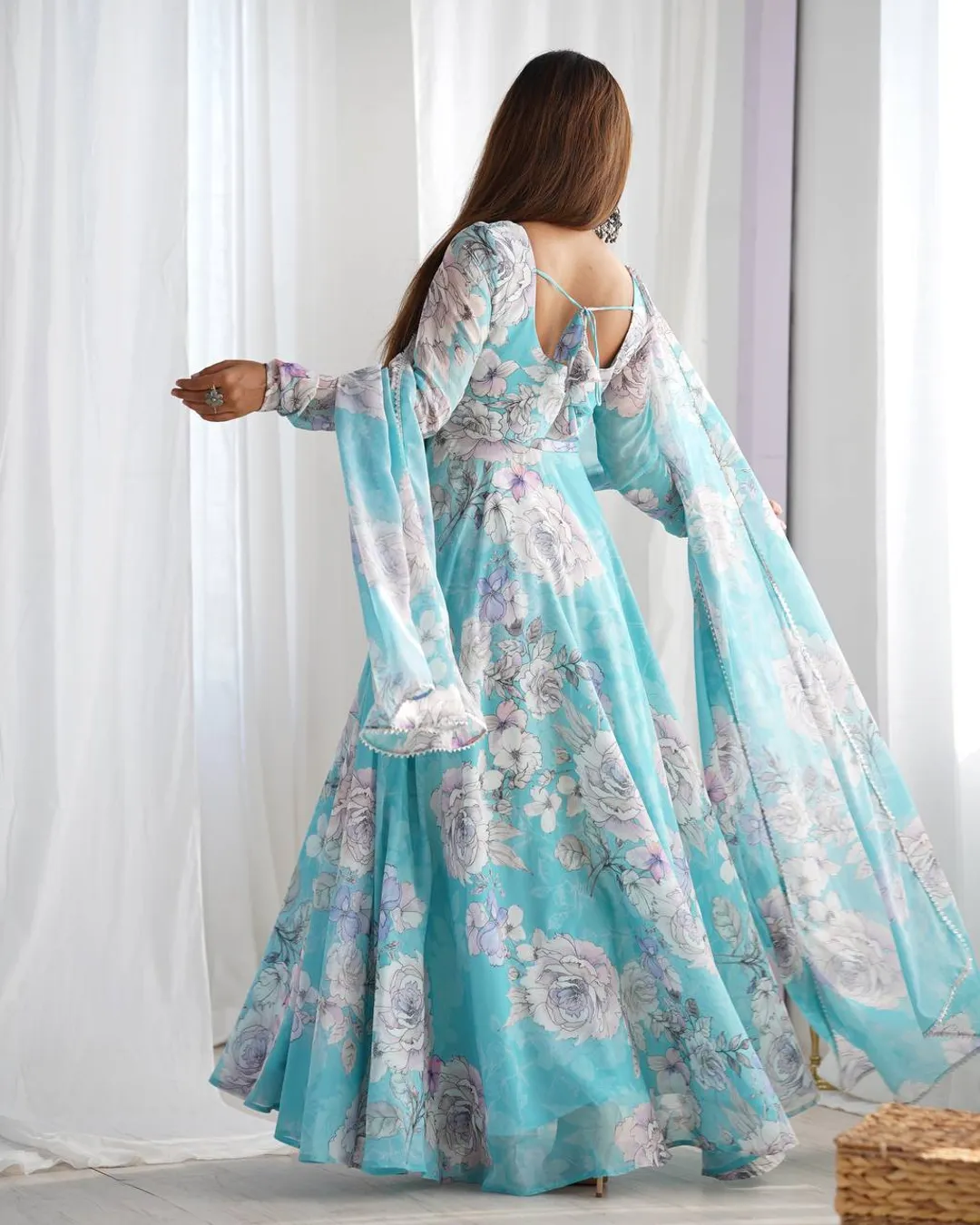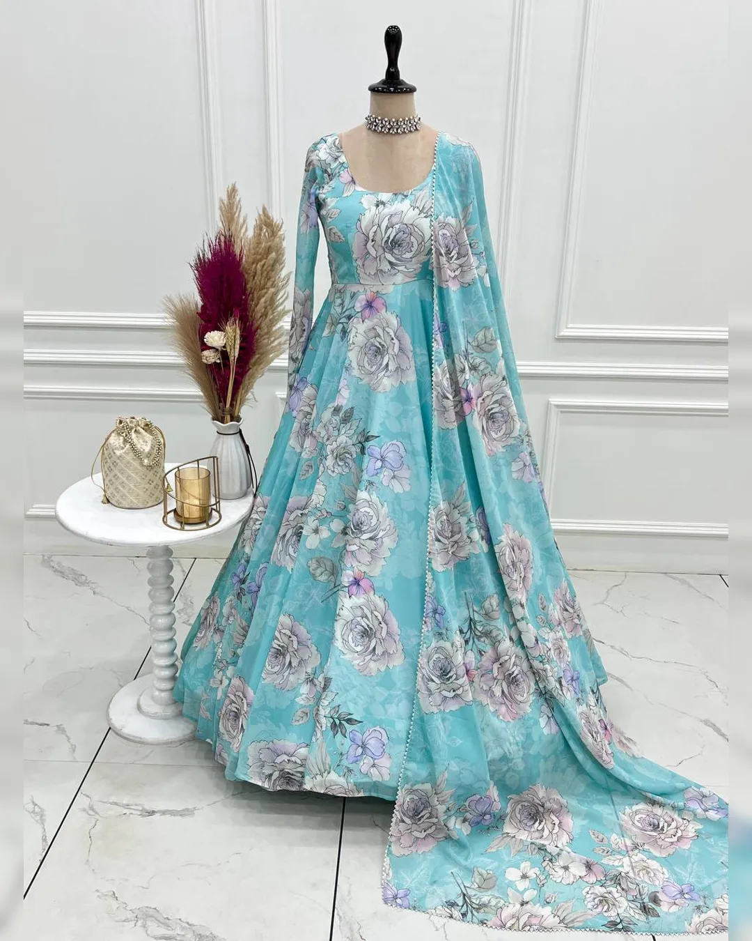 Make a graceful style statement with this newly launched floral print Anarkali gown set, crafted in heavy pure fox georgette for a luxurious and flowy drape. Designed with a 7-meter plus grand flare, this gown creates a stunning twirl effect, perfect for festive and wedding occasions.