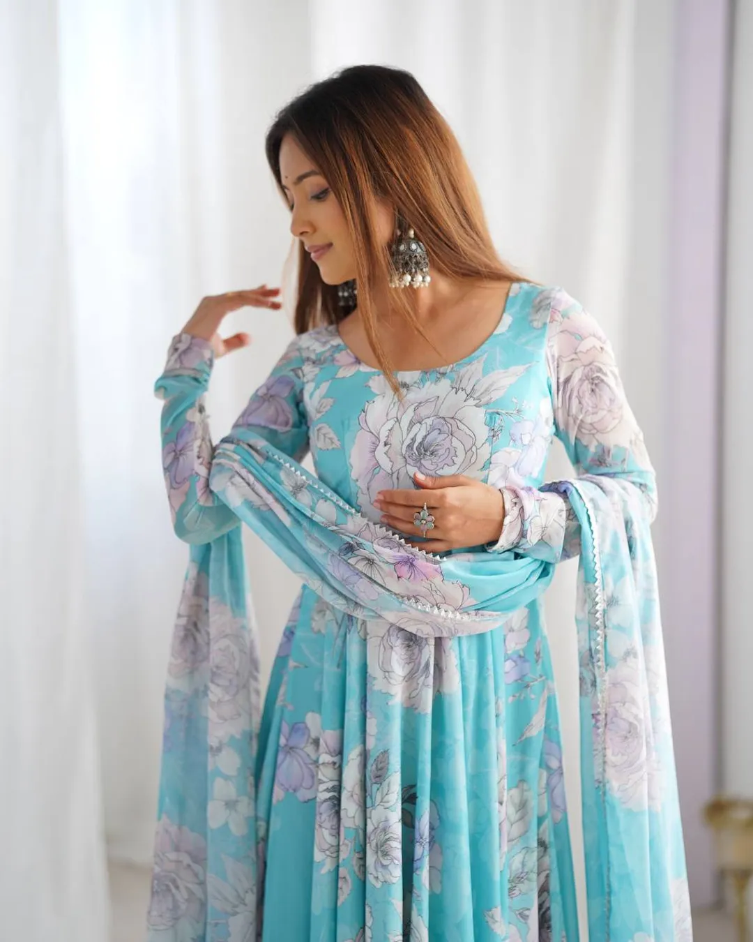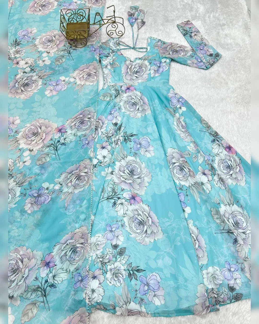 Floral print heavy fox georgette Anarkali gown with 7-meter flare, micro cotton lining, and matching shawl-style dupatta – fully stitched and ready to wear.