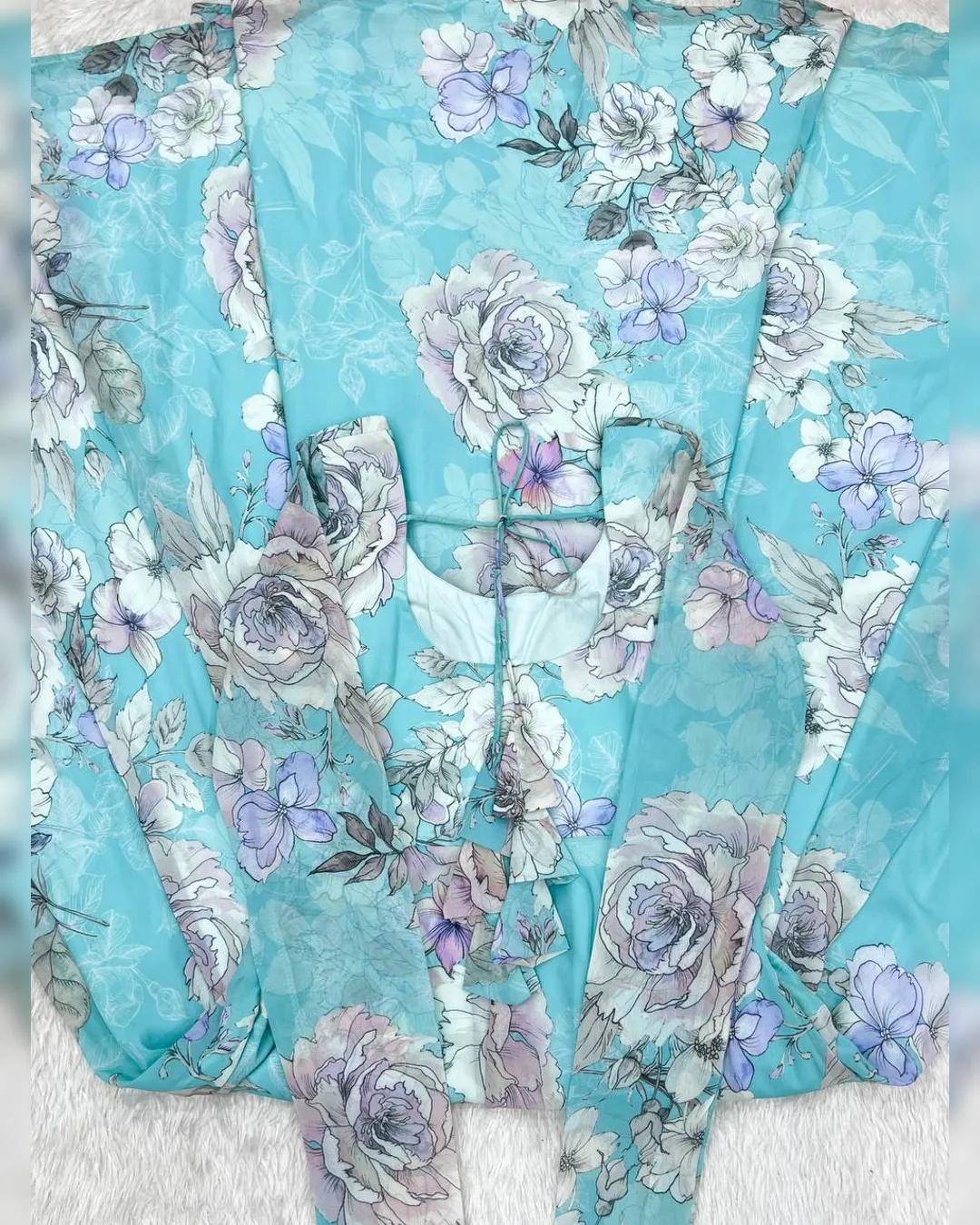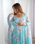 The gown comes fully stitched and ready to wear, featuring a soft micro cotton full inner lining for all-day comfort. Paired with a shawl-style dupatta in matching fox georgette, highlighted with floral printed border and fancy triangle lace work, this set delivers an elegant designer look.