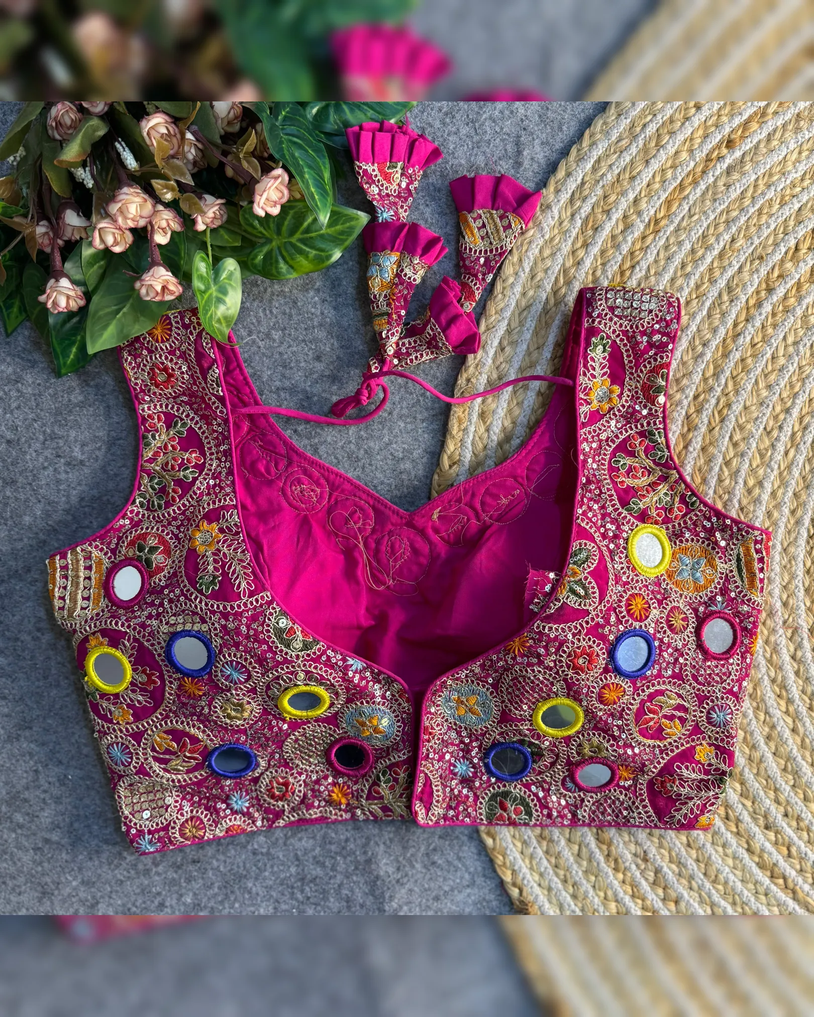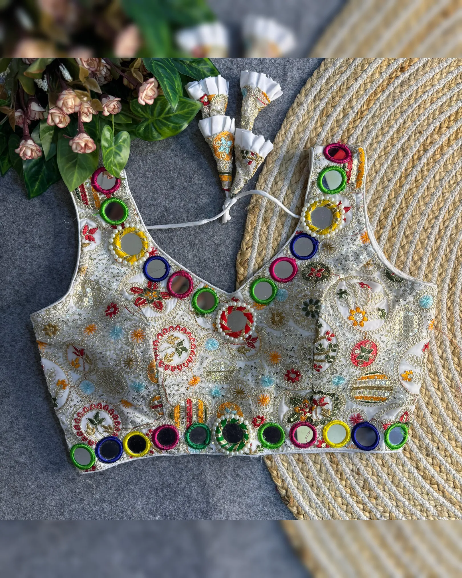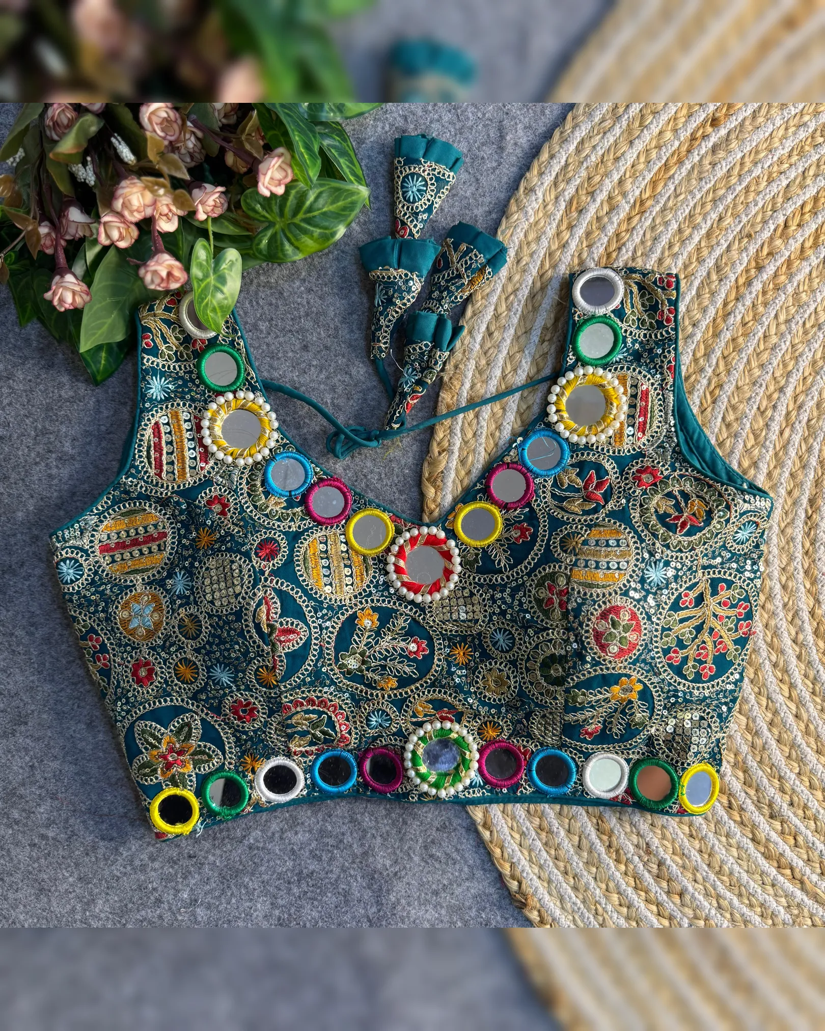 Get Navratri-Ready with our newly launched Bollywood-style blouse that brings glamour and tradition together. Crafted in Heavy Georgette, this blouse features real multi mirror work combined with detailed codding embroidery for a dazzling festive look.