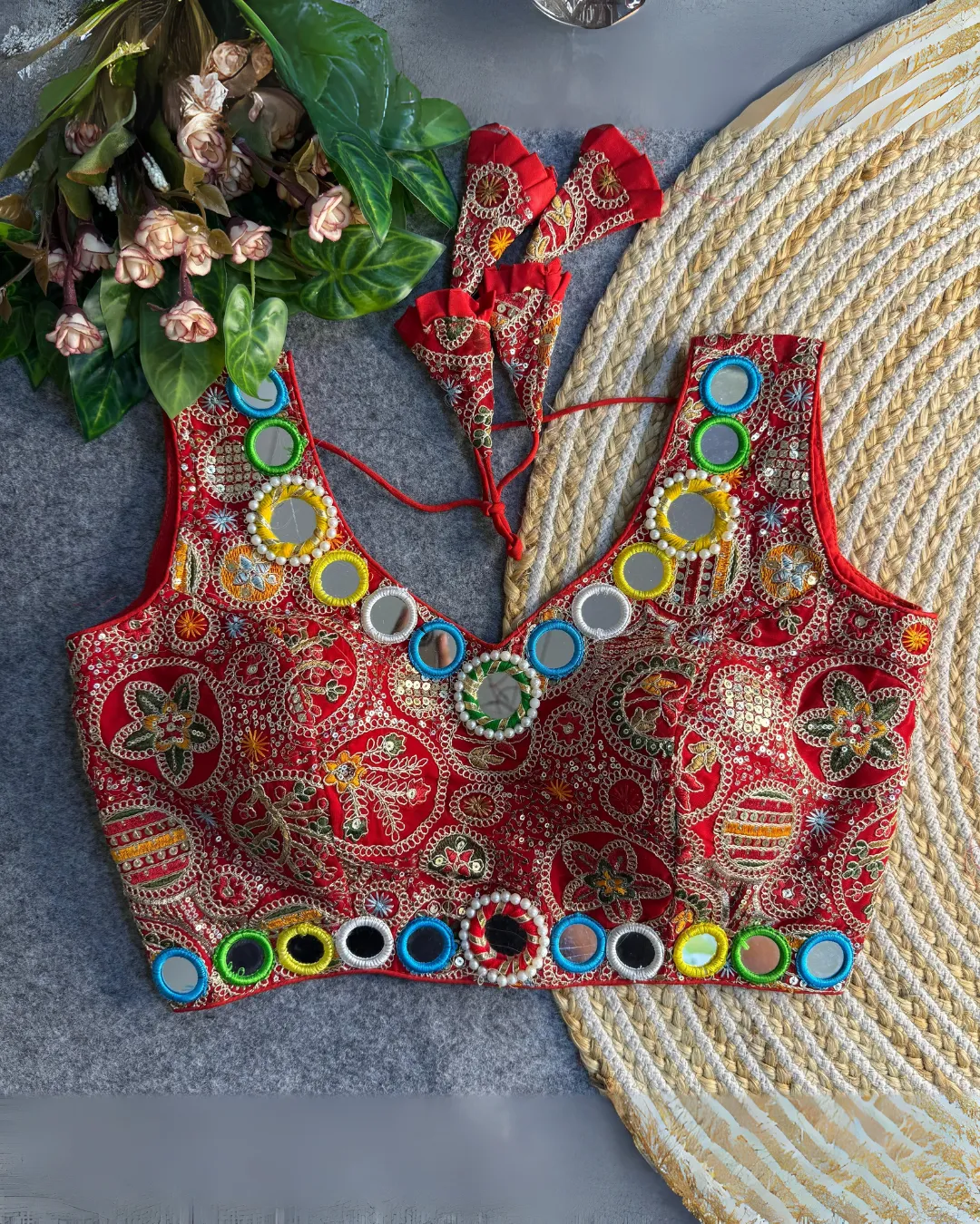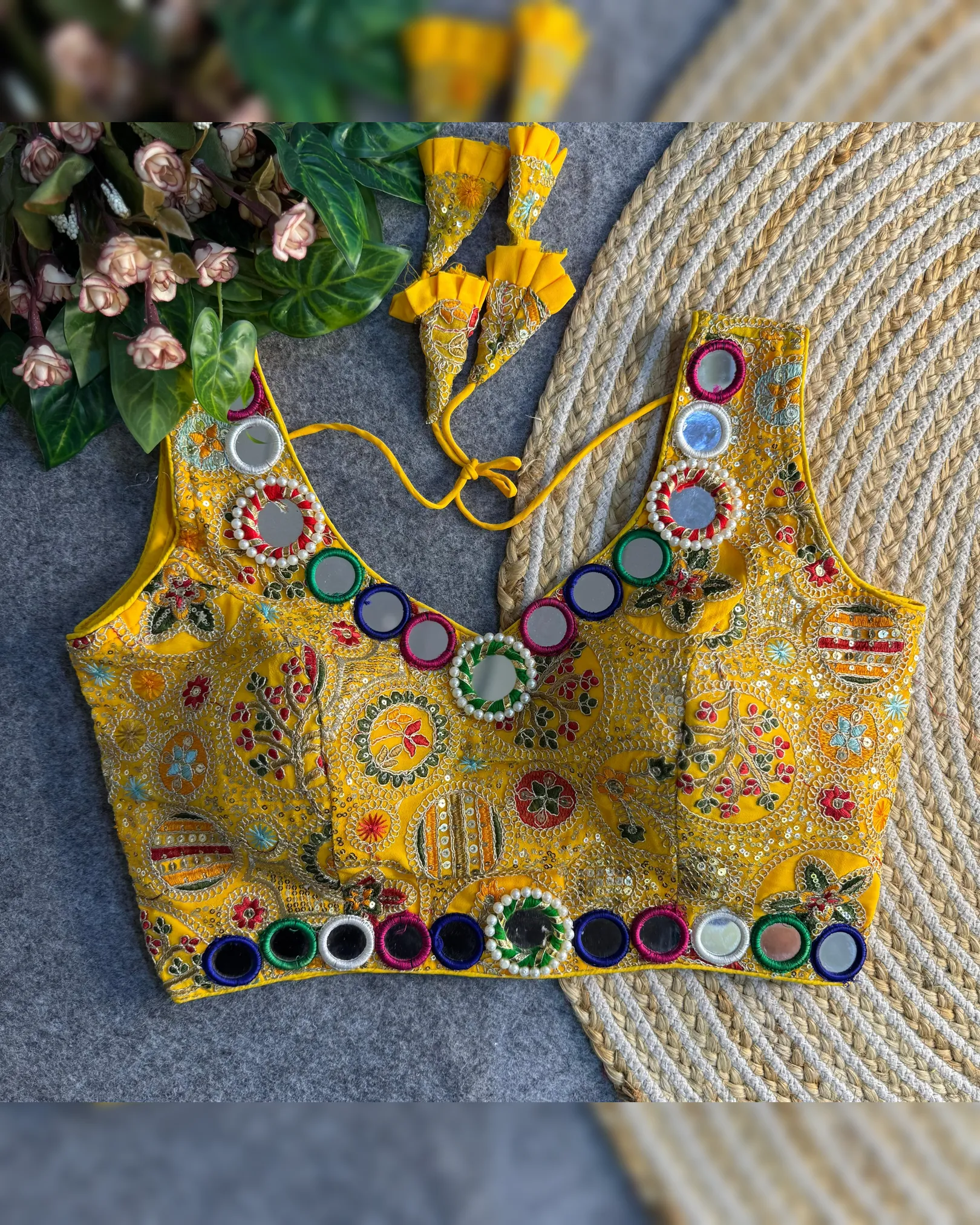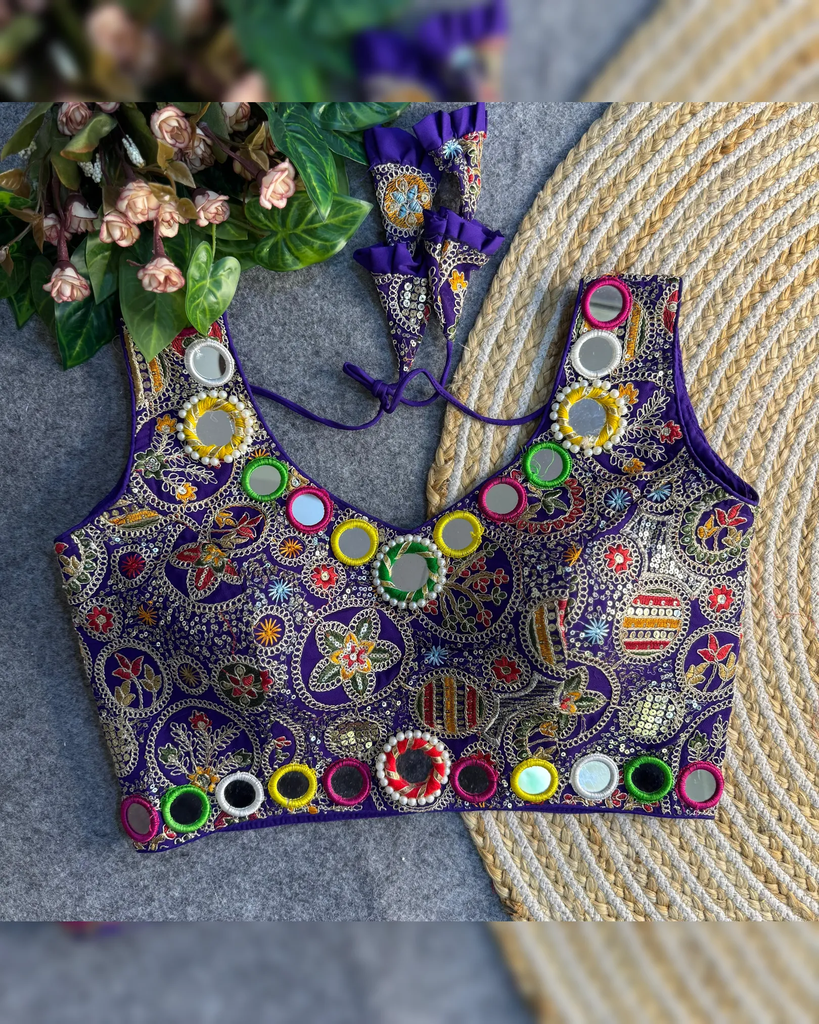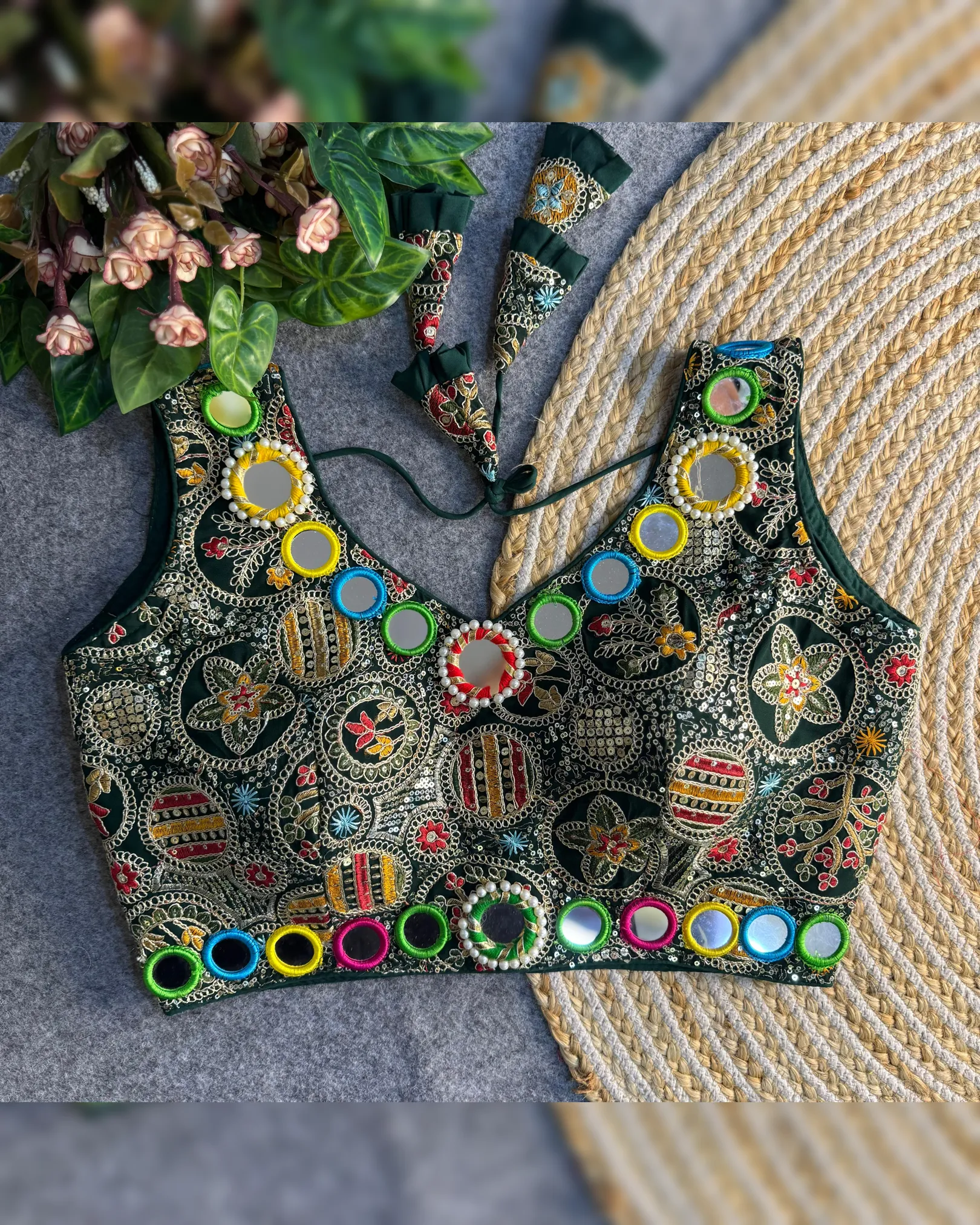 Get Navratri-Ready with our newly launched Bollywood-style blouse that brings glamour and tradition together. Crafted in Heavy Georgette, this blouse features real multi mirror work combined with detailed codding embroidery for a dazzling festive look.