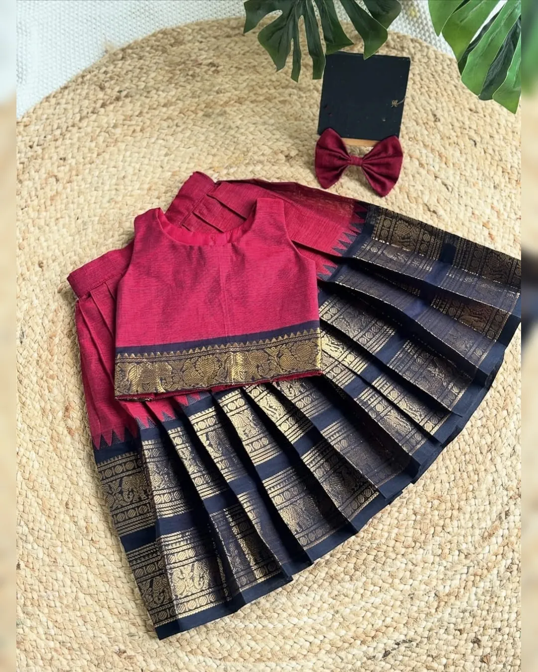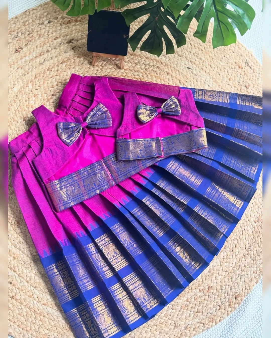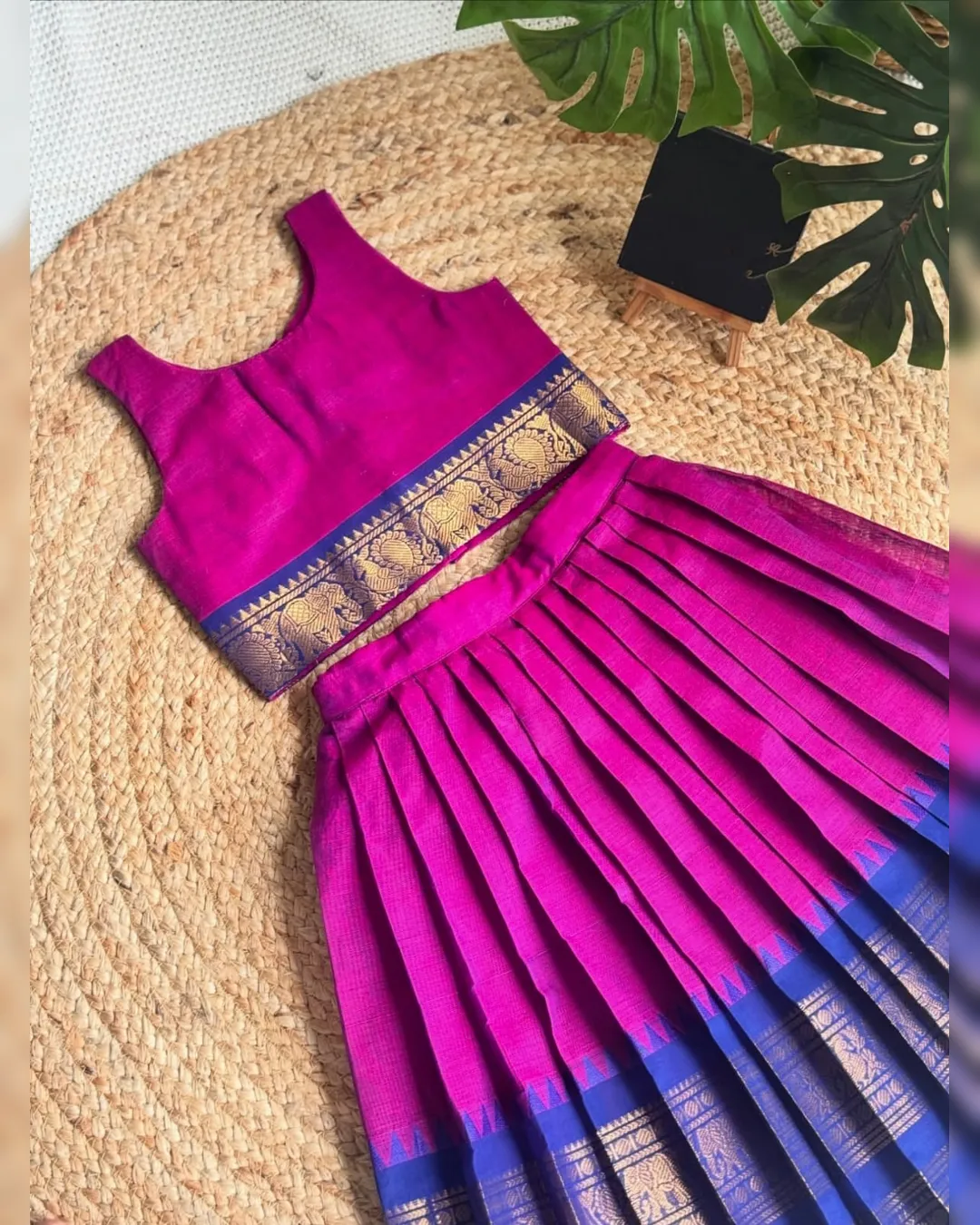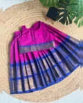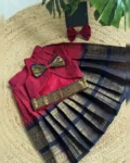 Fully stitched kids lehenga choli in pure silk with zari weaving work, canvas finish, and full flair—available for ages 1 to 15 years.