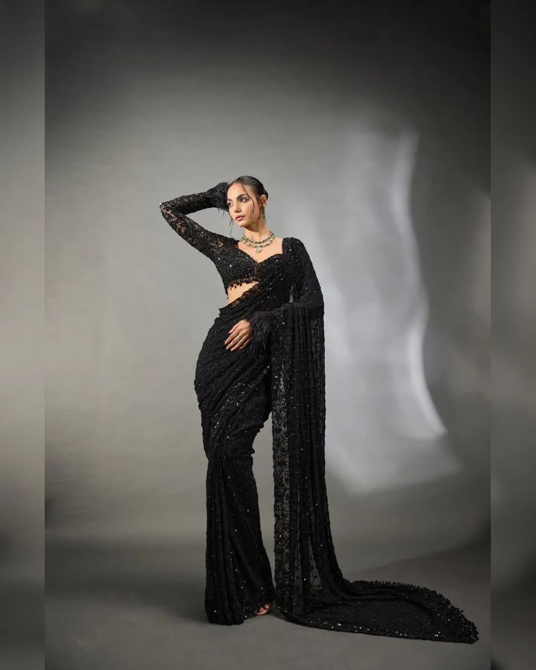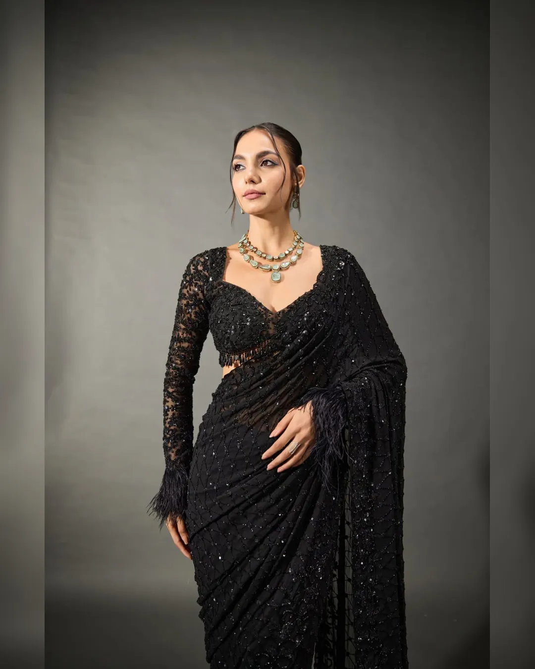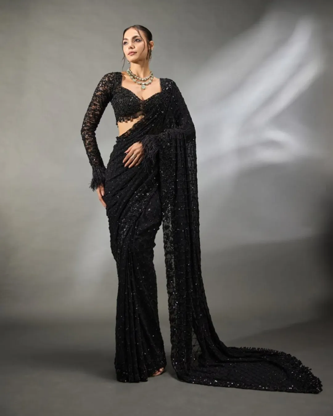 Bollywood style heavy faux georgette saree with 5mm sequins, multi-embroidery C-pallu, and fully embroidered blouse with latkan detailing.