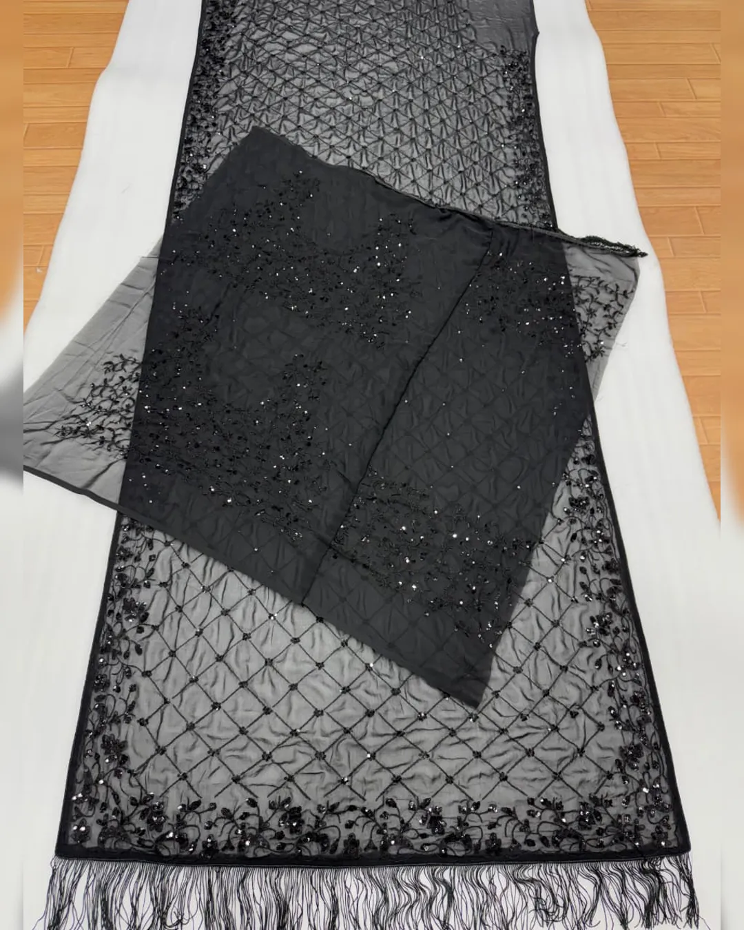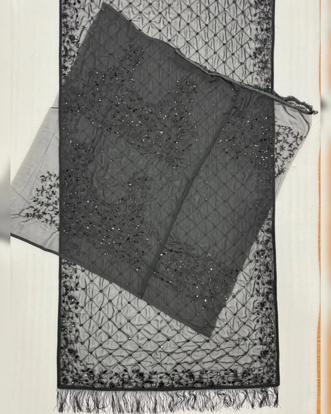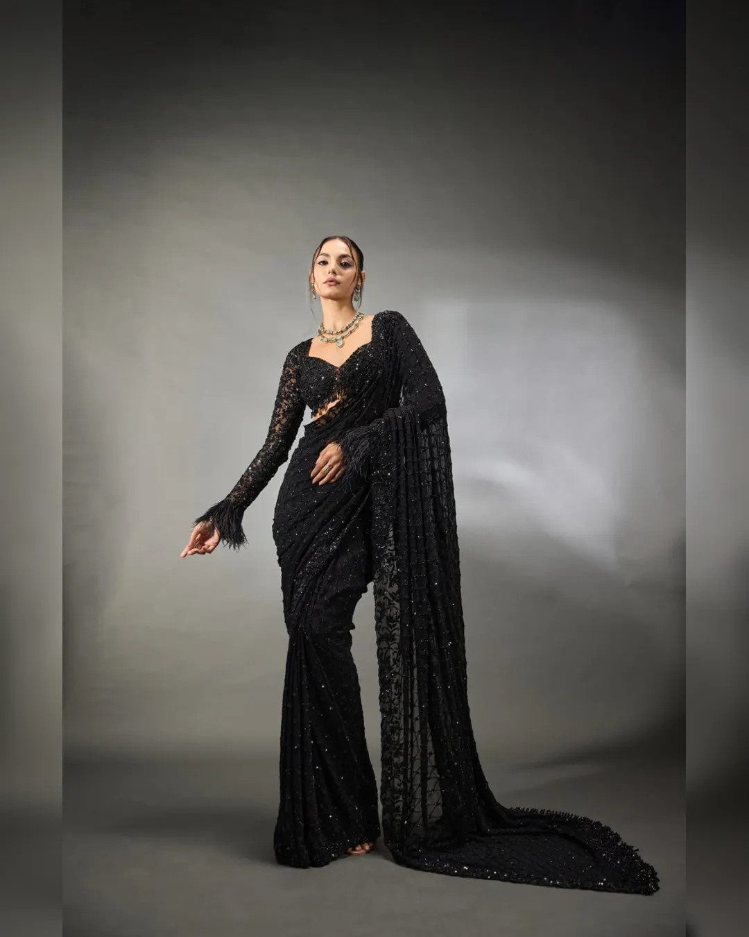 Bollywood style heavy faux georgette saree with 5mm sequins, multi-embroidery C-pallu, and fully embroidered blouse with latkan detailing.