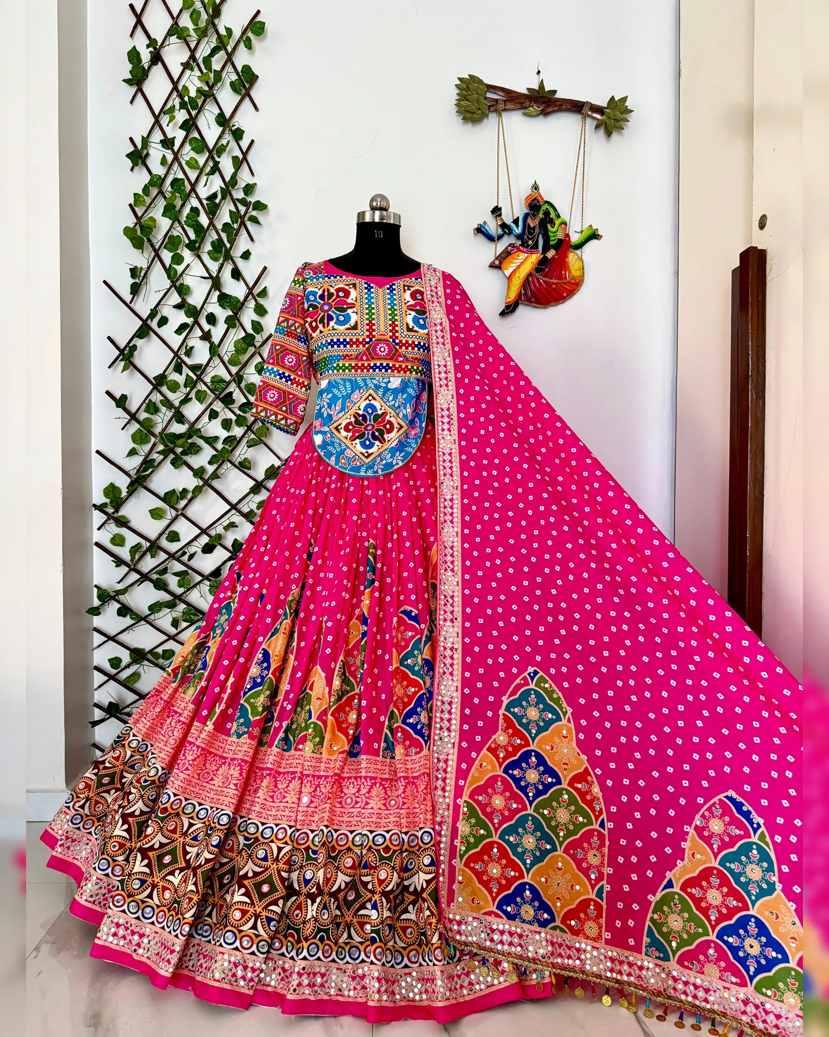Trending Navratri Chaniya Choli in heavy muslin cotton with digital prints, real mirror work, and delicate handwork lace. Fully stitched lehenga, unstitched choli with custom fit, and matching dupatta.