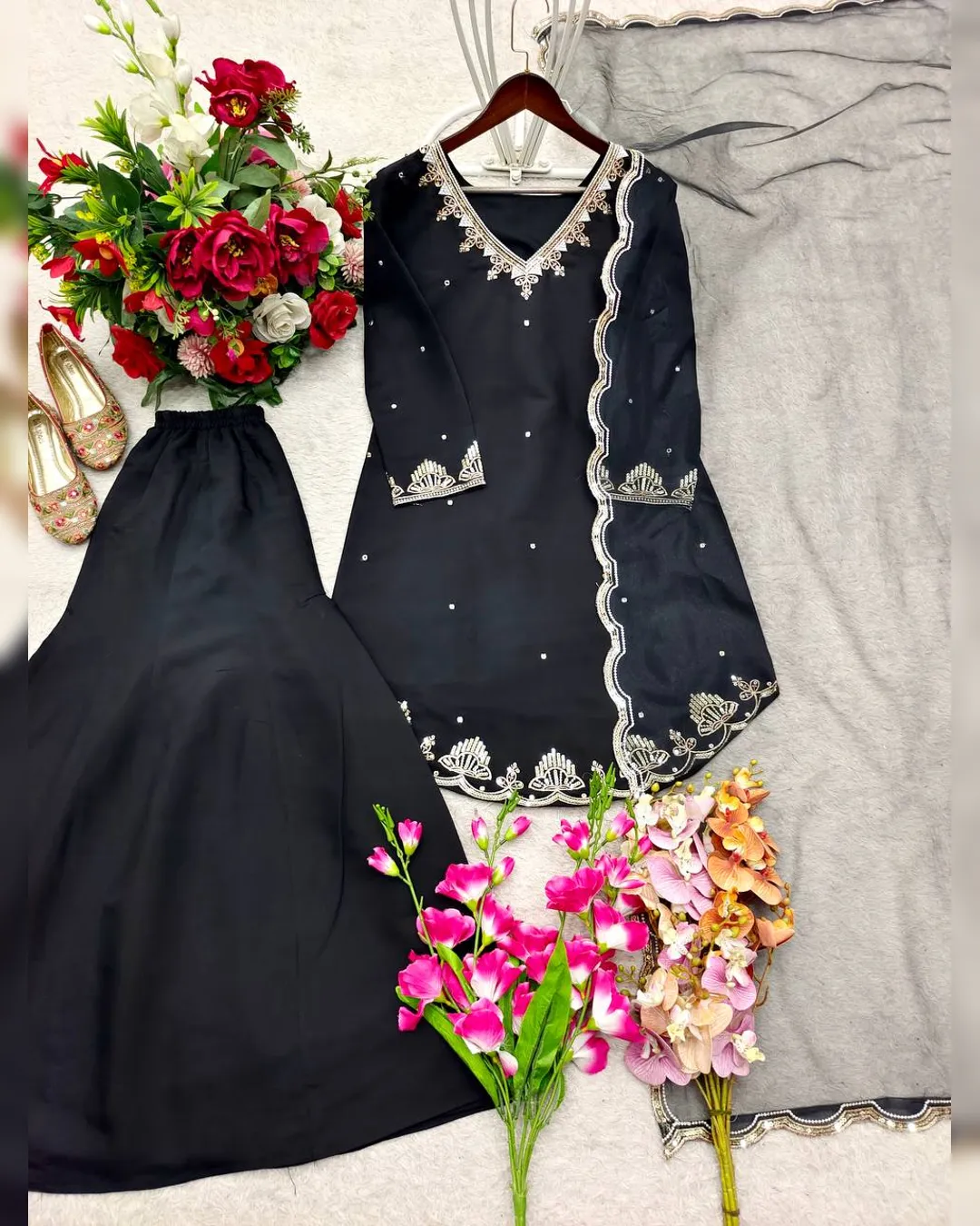 Step into elegance with our newly launched trending Roman Silk Top-Plazzo-Dupatta set, designed for women who love luxury ethnic fashion. Crafted from pure Roman silk, this outfit features beautiful 5mm sequence embroidery work that adds a rich festive glow.