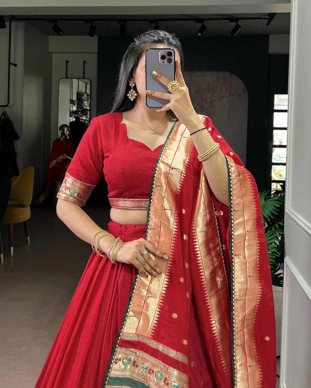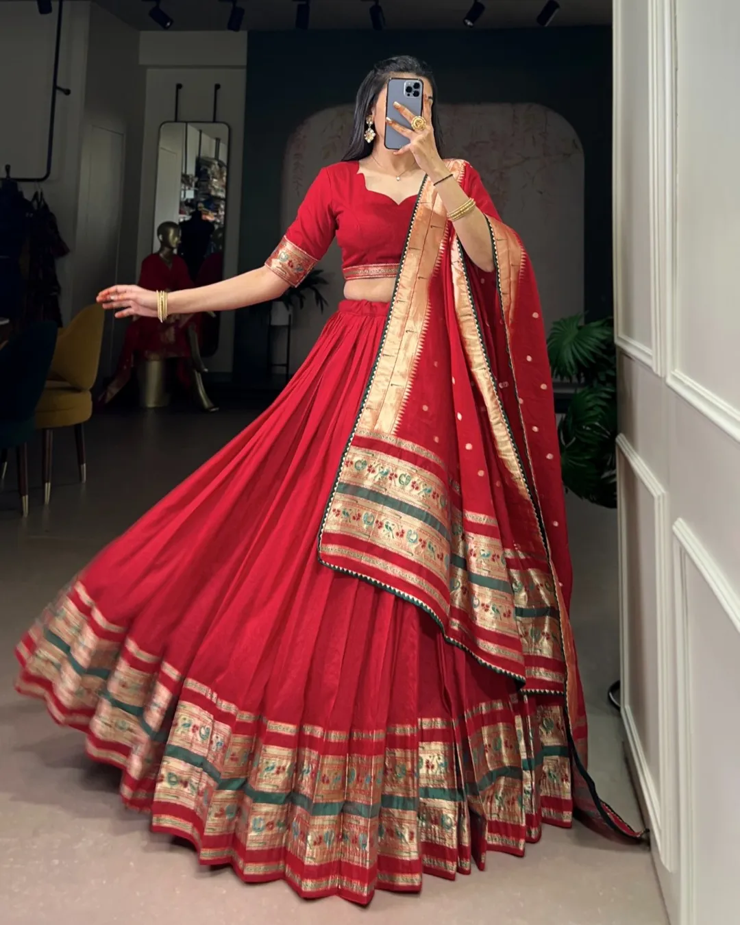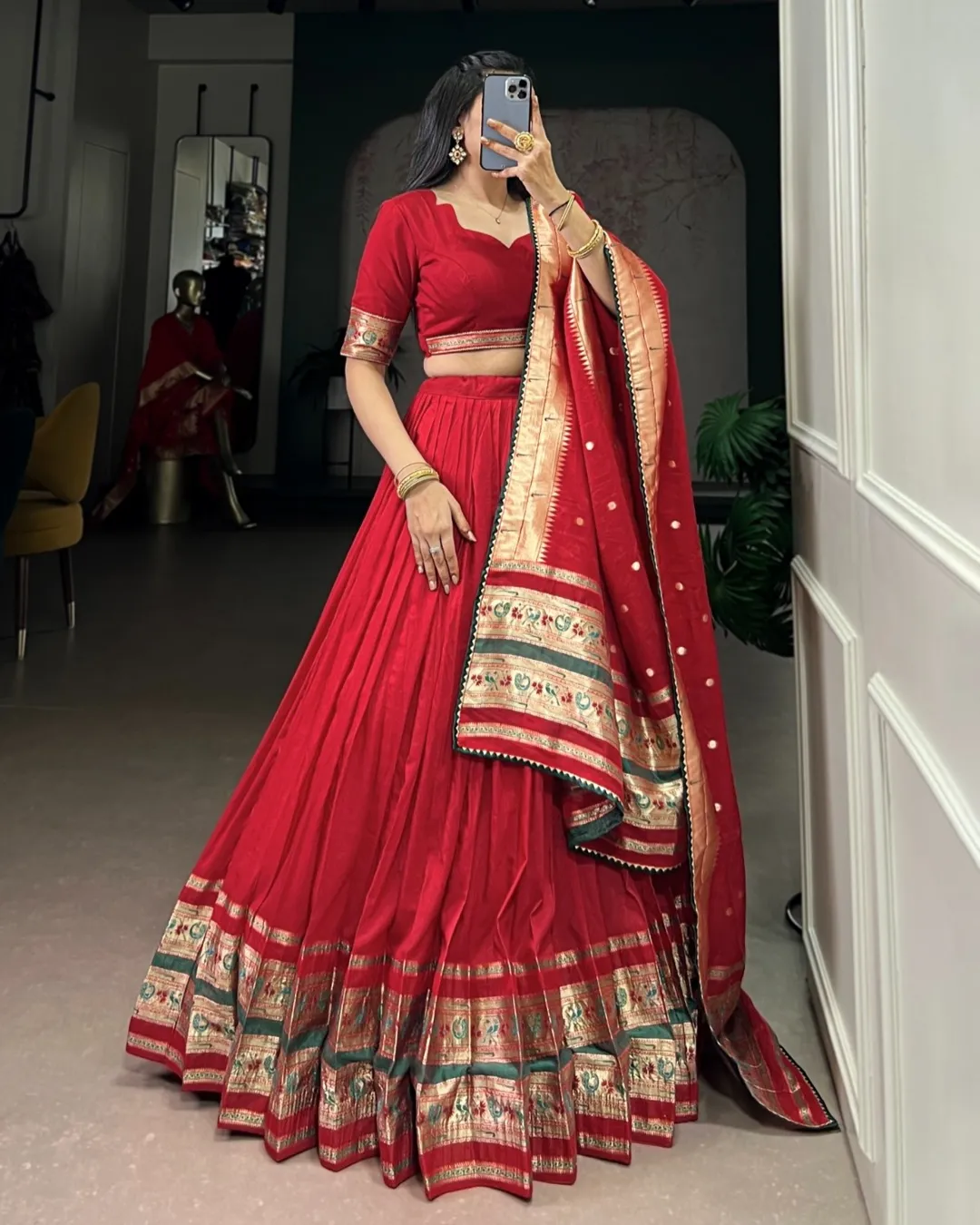Elegant Paithani lehenga set crafted in pure Chanderi fabric with zari weaving and gotta patti detailing, paired with matching blouse and dupatta.