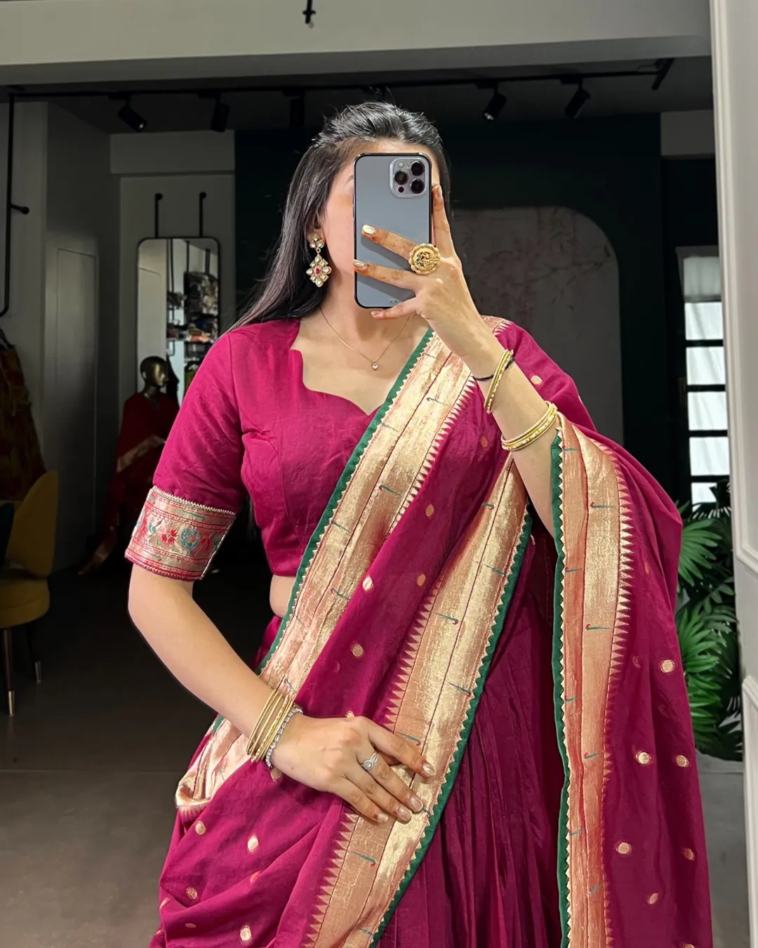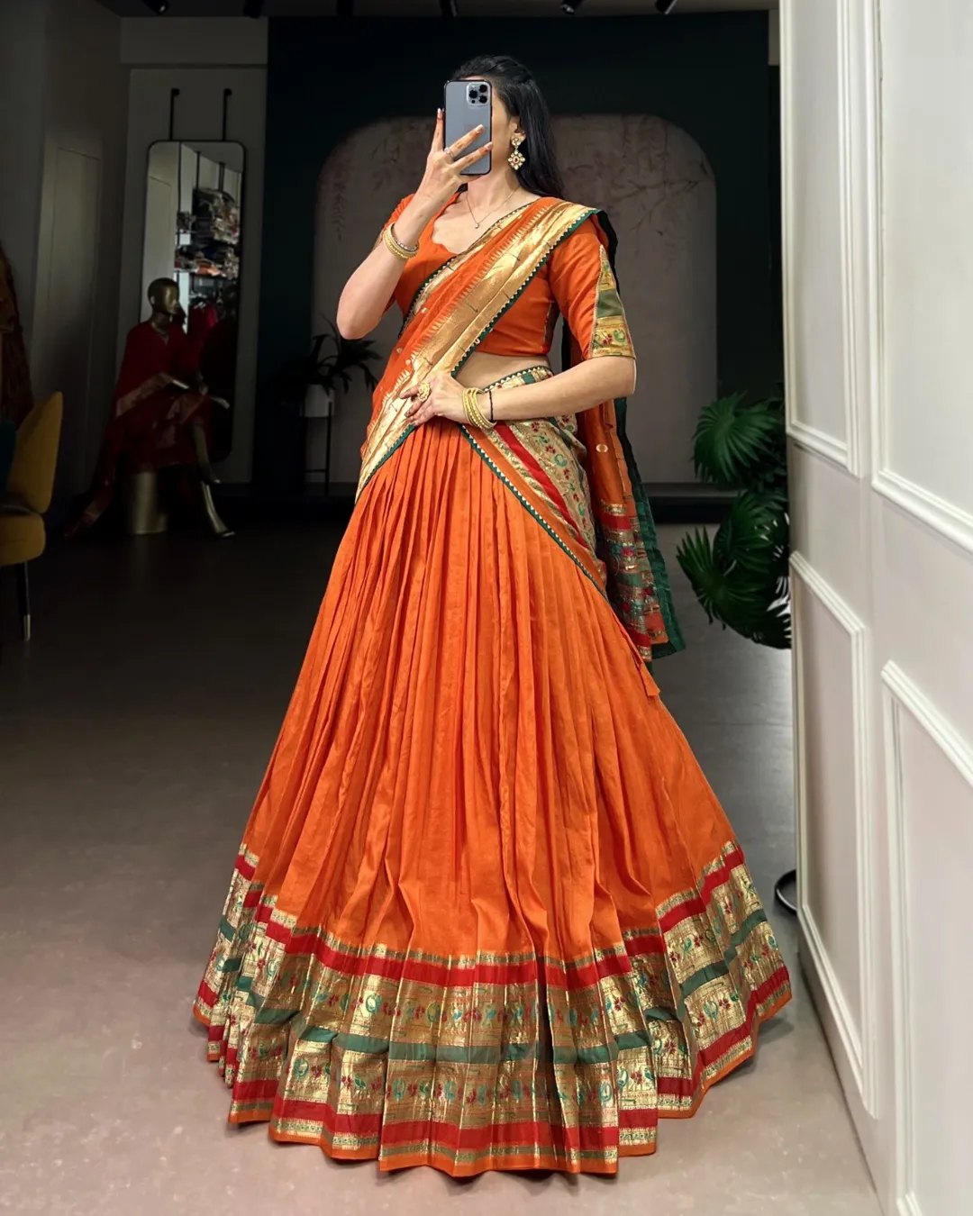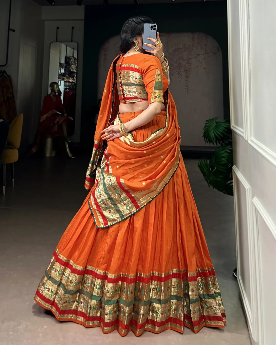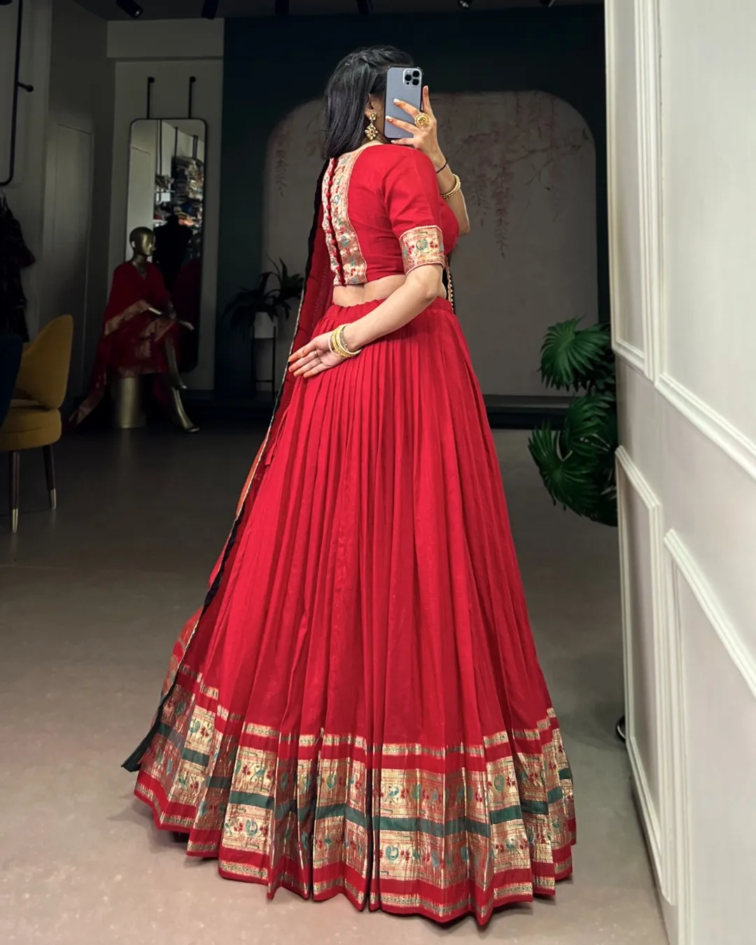 Elegant Paithani lehenga set crafted in pure Chanderi fabric with zari weaving and gotta patti detailing, paired with matching blouse and dupatta.