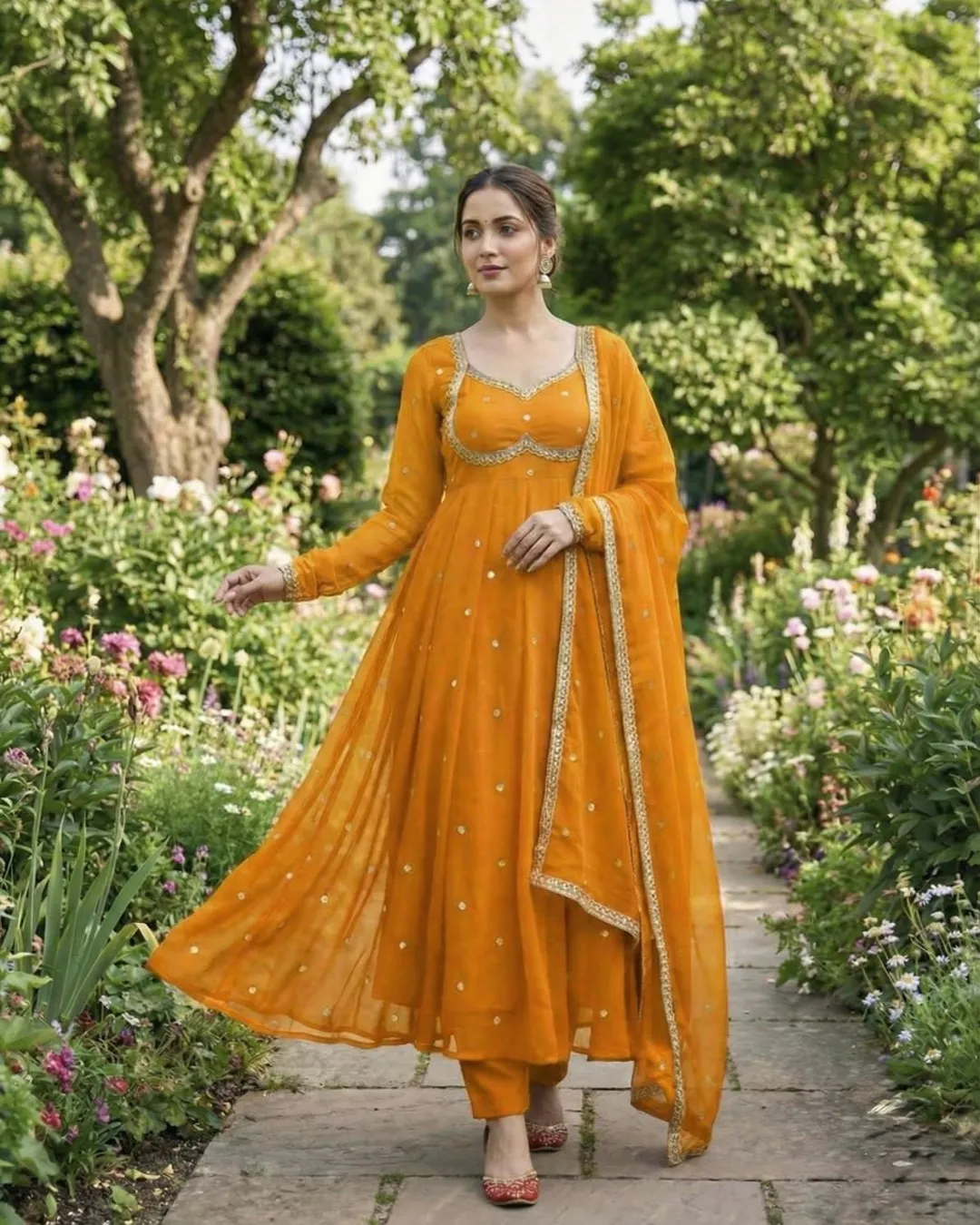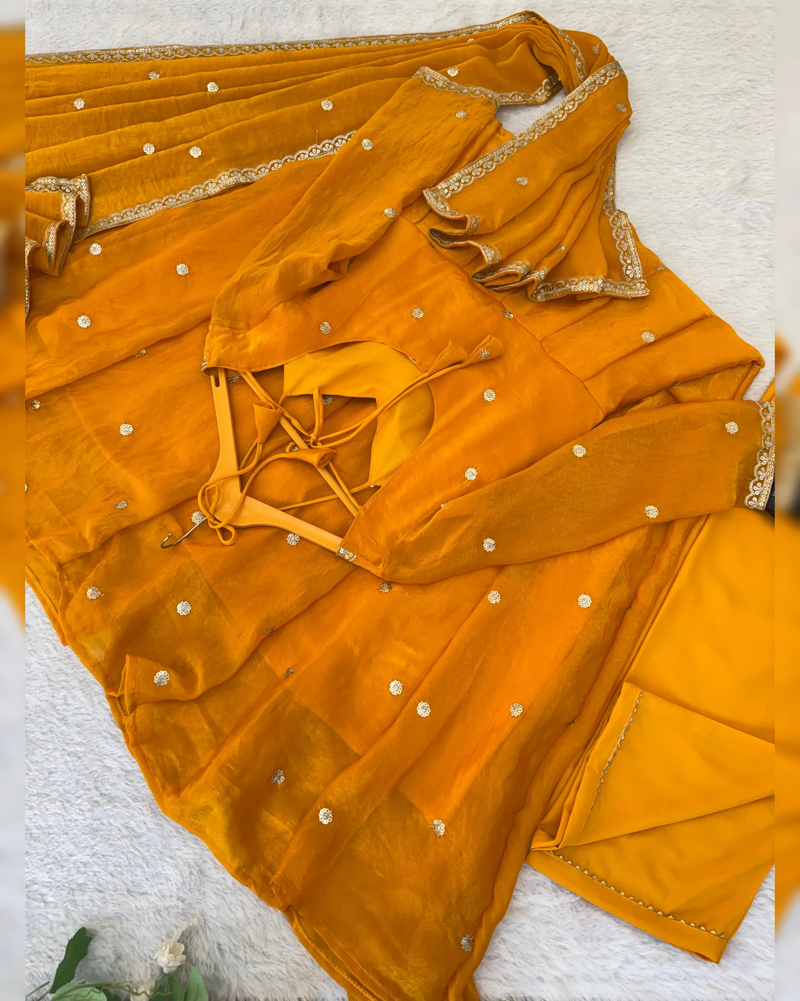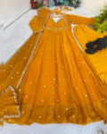 The gown flows beautifully with a 4-meter, 12-kali flair, while the heavy butter cotton inner ensures all-day comfort. The dupatta is adorned with four-side sequence embroidered lace borders and all-over butti sequence work, creating a complete designer ensemble perfect for weddings, parties, festive evenings, and special celebrations.