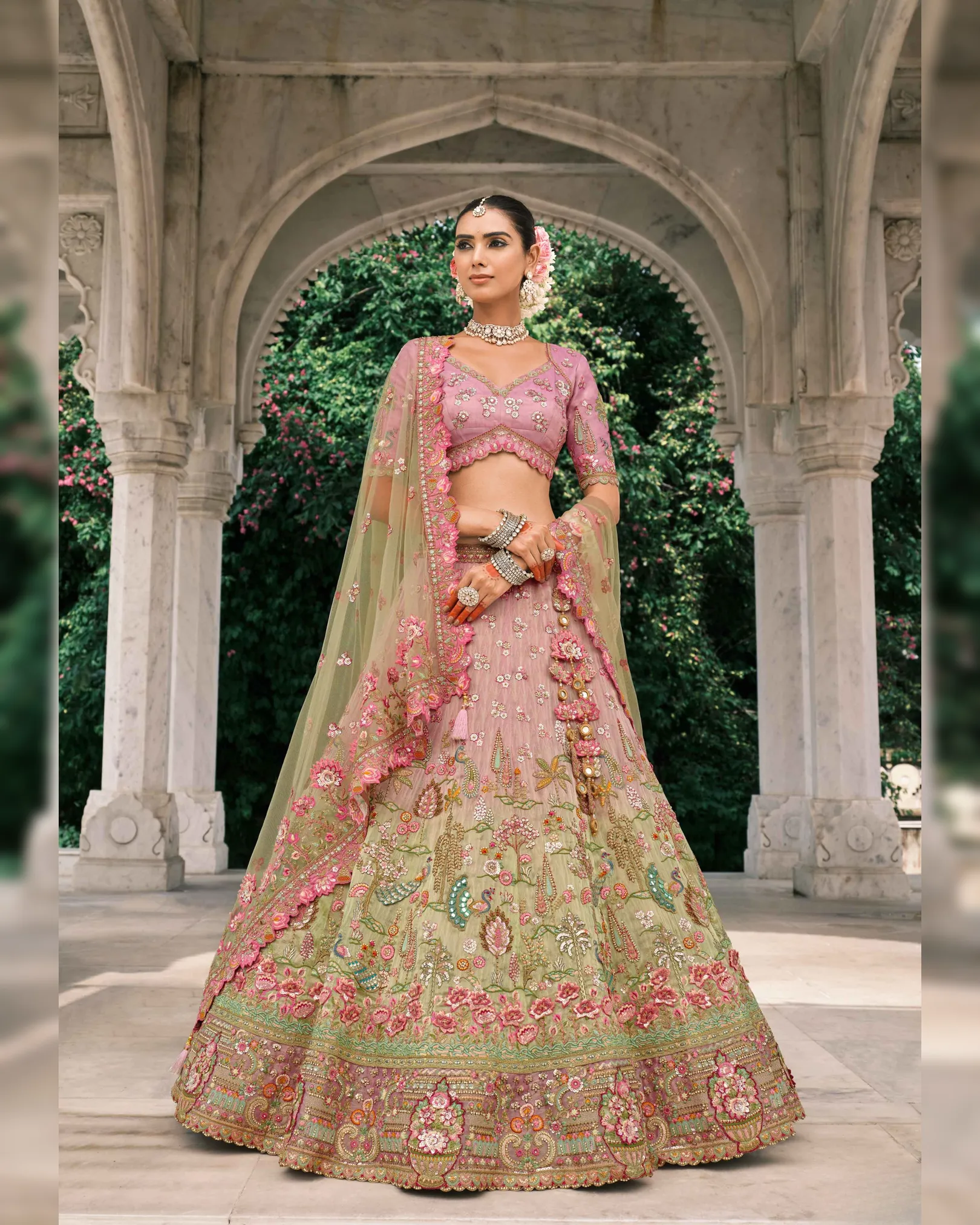 The look is paired with a pink Tissue Zari blouse and completed with a light olive green net dupatta, creating a graceful color harmony that feels both festive and sophisticated. Ideal for weddings, engagements, sangeet nights, and festive gatherings, this lehenga set ensures timeless elegance with every twirl.