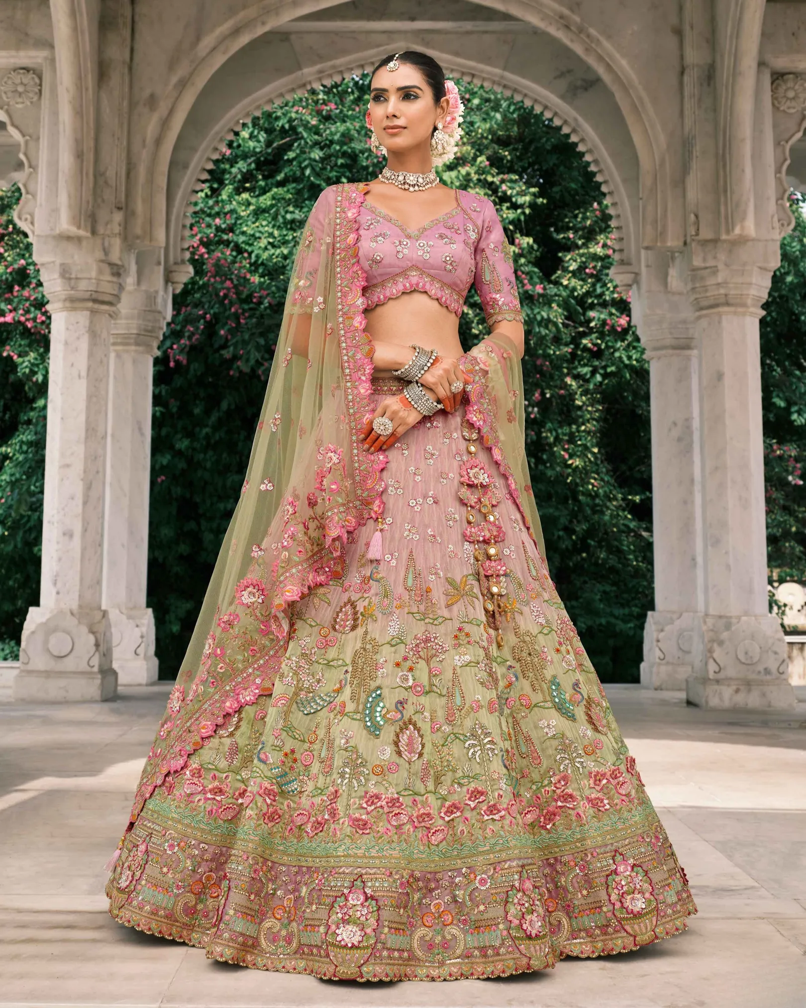 Pink and light olive green shaded tissue zari circular lehenga with hand-embroidered detailing, unstitched blouse, and elegant net dupatta — perfect for weddings and festive occasions.
