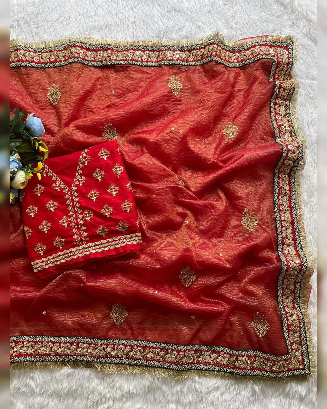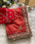 Paired with a Heavy Mono Banglory Silk blouse, also adorned with matching sequence and coding embroidery, this ensemble radiates regal charm and fashion-forward grace. Designed for the modern woman who loves traditional luxury.