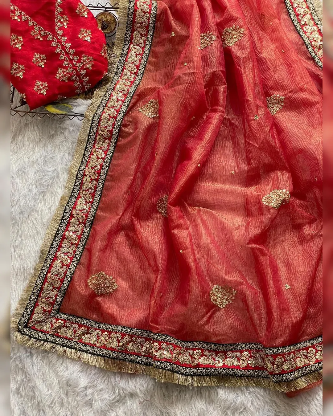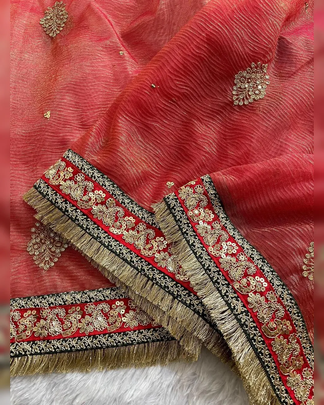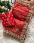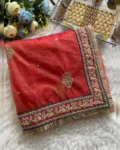 Step into pure elegance with this Heavy Soft Banarasi Crush Saree, featuring luxurious embroidery sequence and coding work throughout. The saree is beautifully enhanced with a ready lace border and intricate detailing, making it a perfect pick for weddings, parties, or festive gatherings.