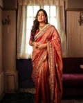 Elegant Banarasi crush saree with heavy embroidery sequence and coding work, paired with a mono banglory blouse for a festive-ready look.