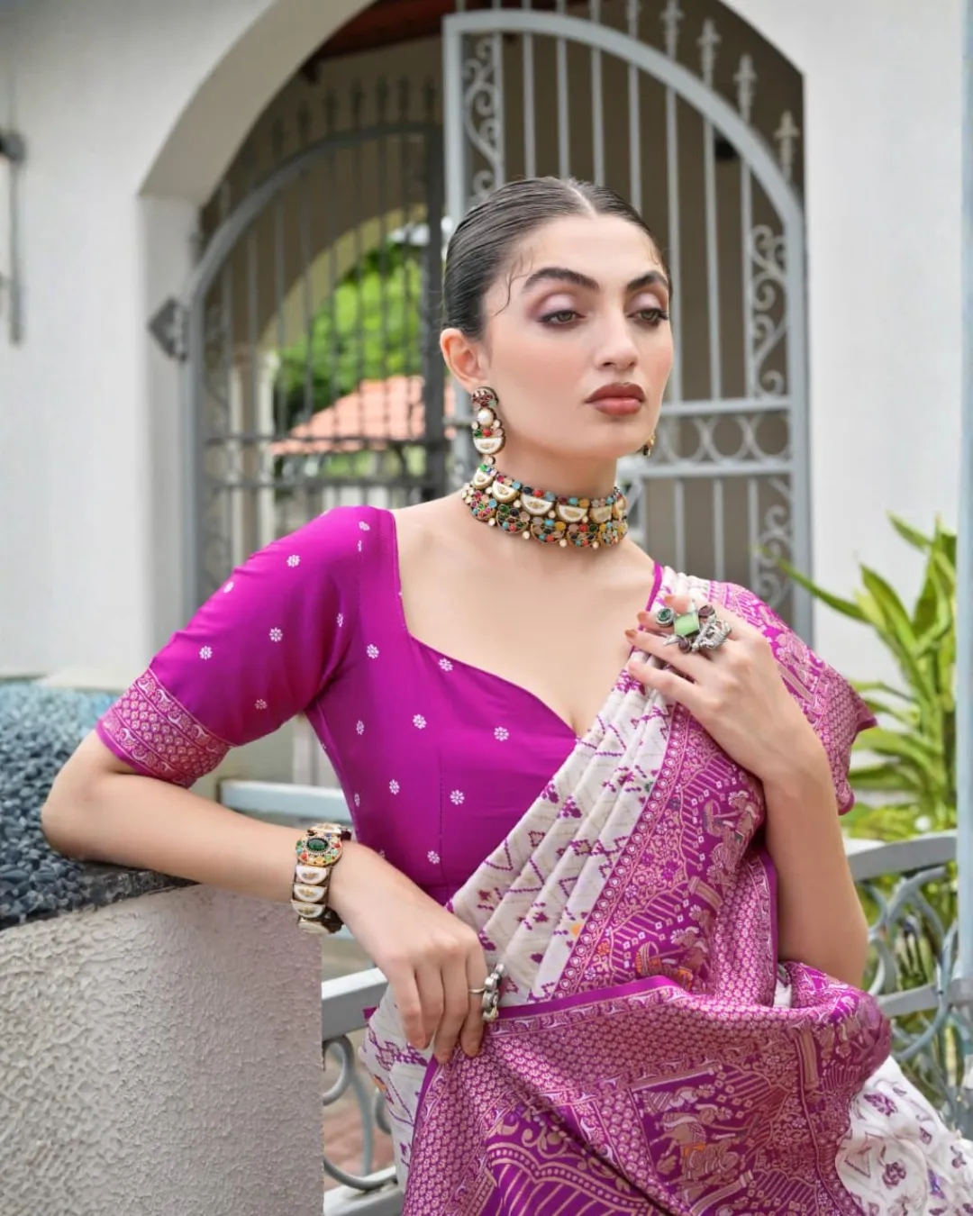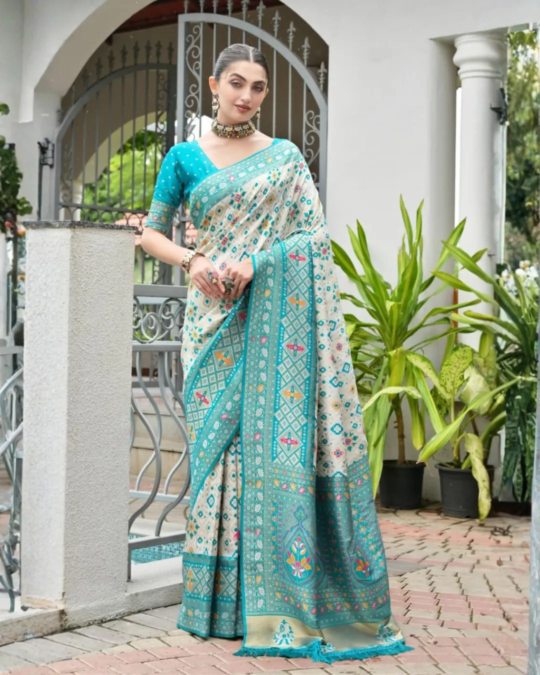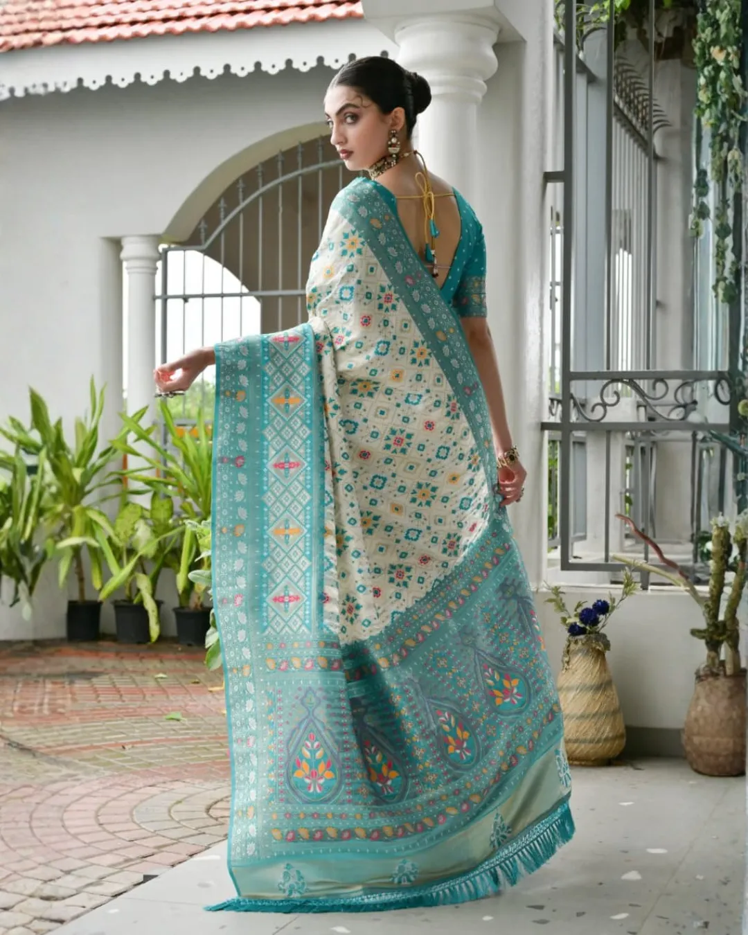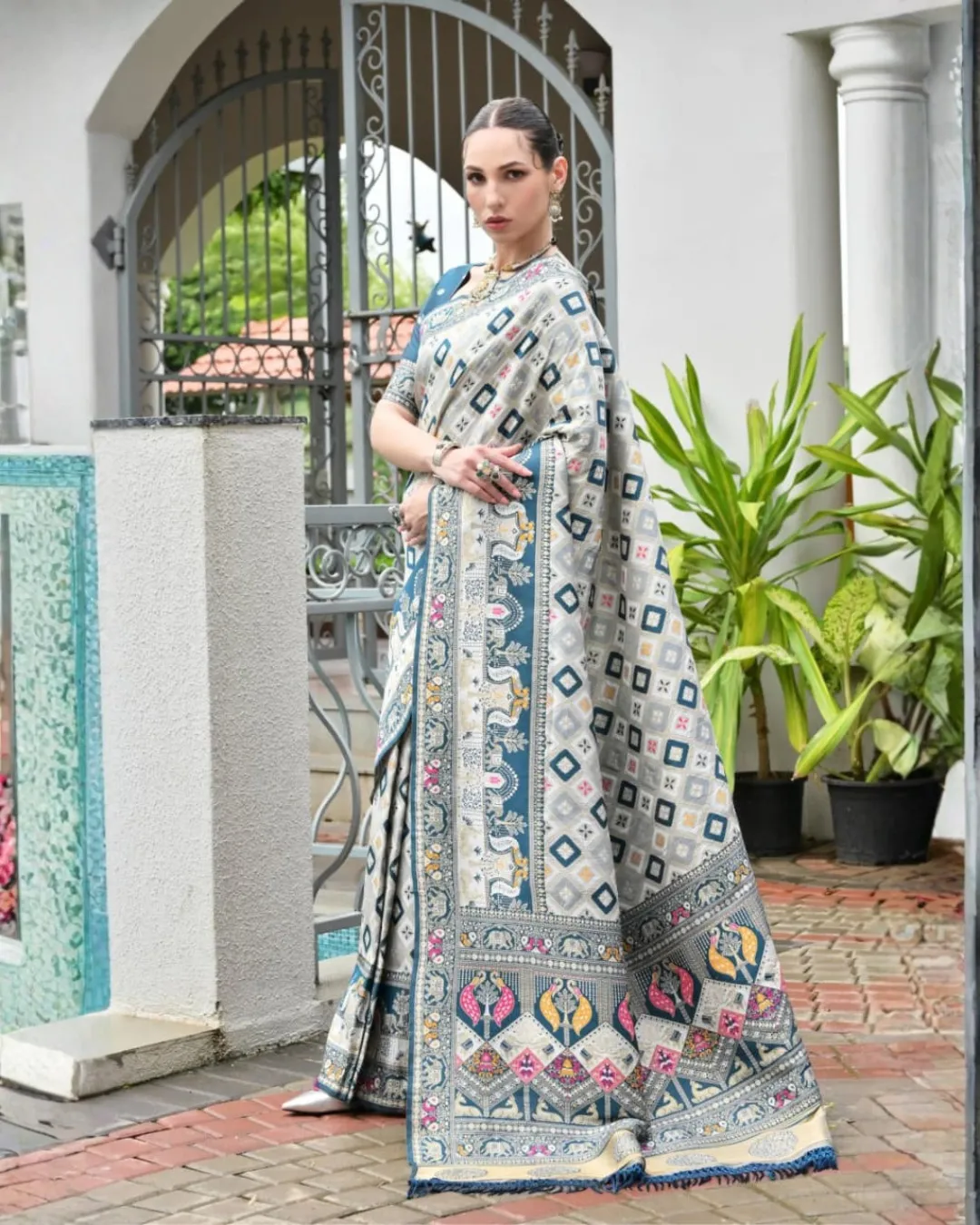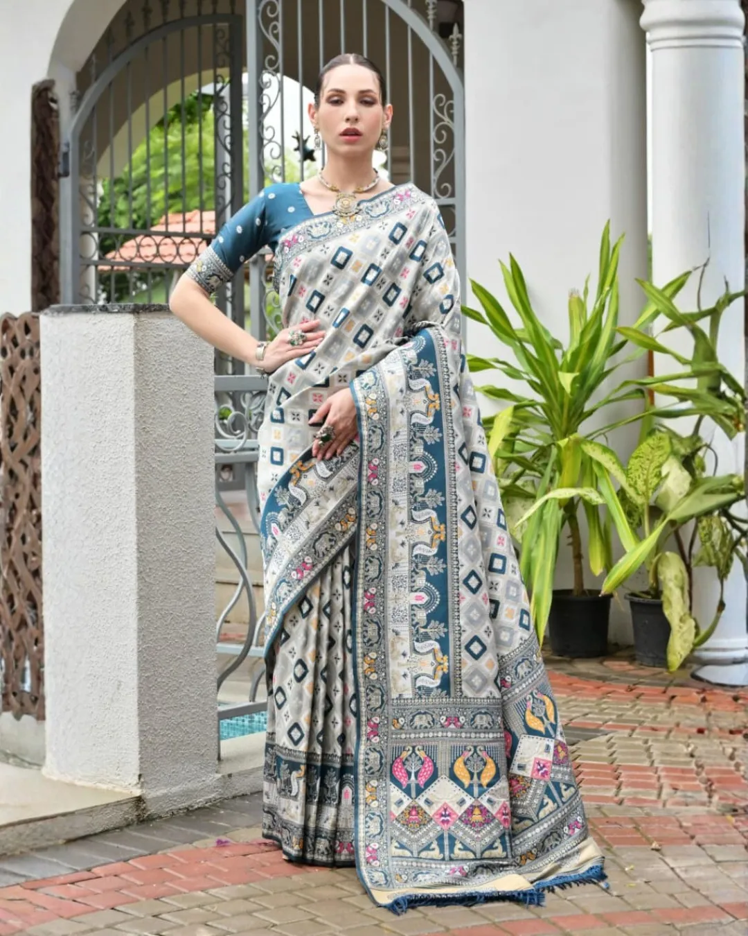 Presenting a new designer catalogue of white and cream Banarasi silk sarees, beautifully crafted with a blend of Ajrakh and Patola weaving styles. This saree showcases classic traditional designs combined with modern elegance, making it a perfect choice for refined ethnic wear.