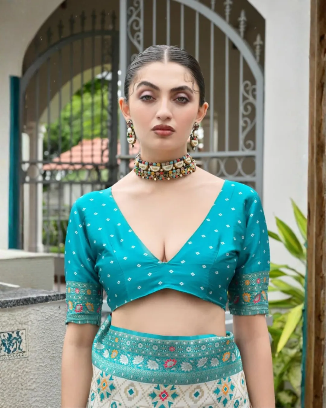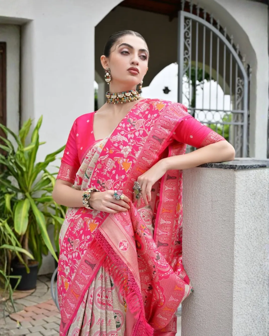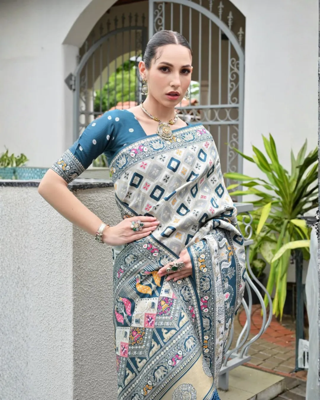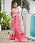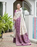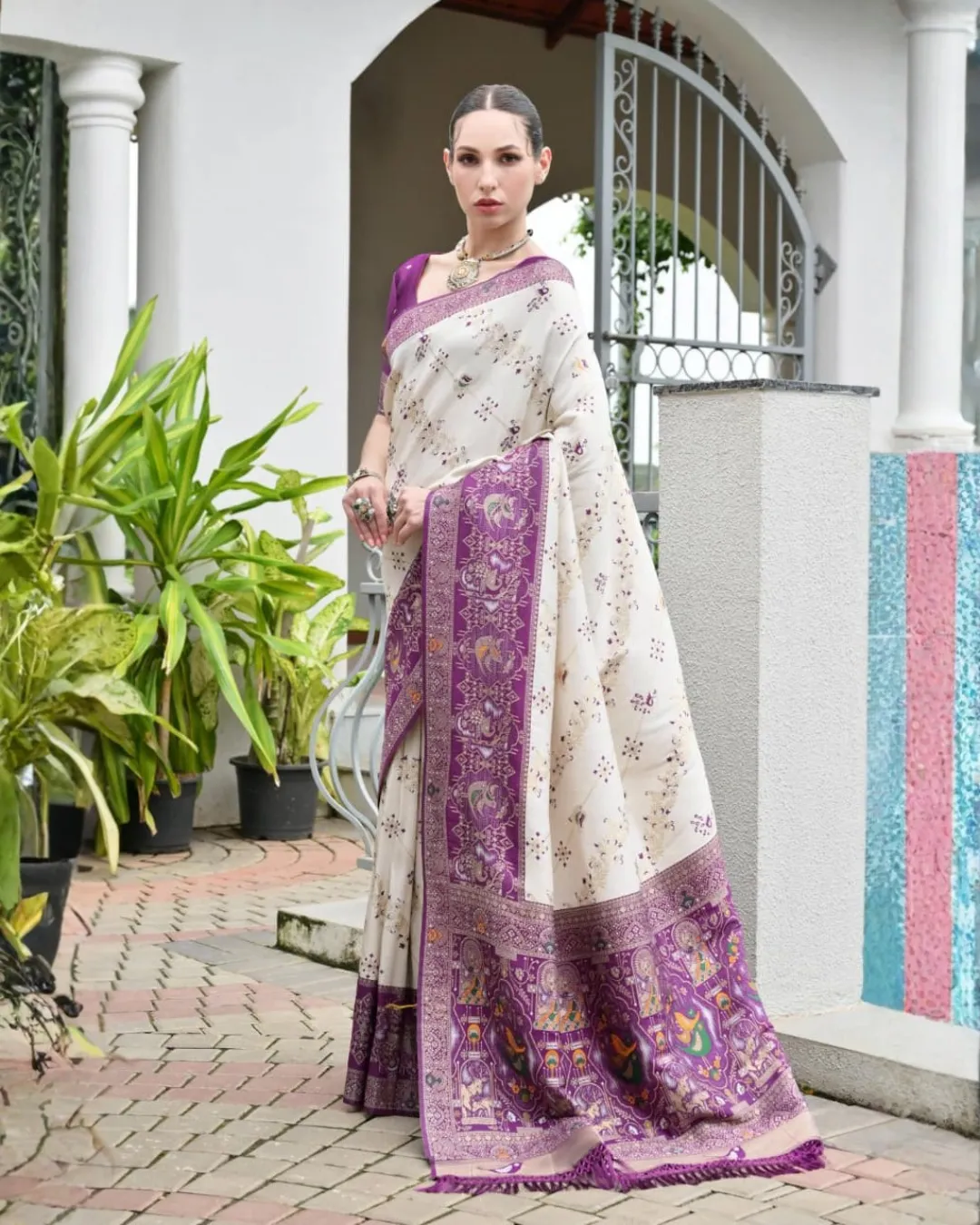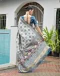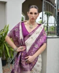 Presenting a new designer catalogue of white and cream Banarasi silk sarees, beautifully crafted with a blend of Ajrakh and Patola weaving styles. This saree showcases classic traditional designs combined with modern elegance, making it a perfect choice for refined ethnic wear.