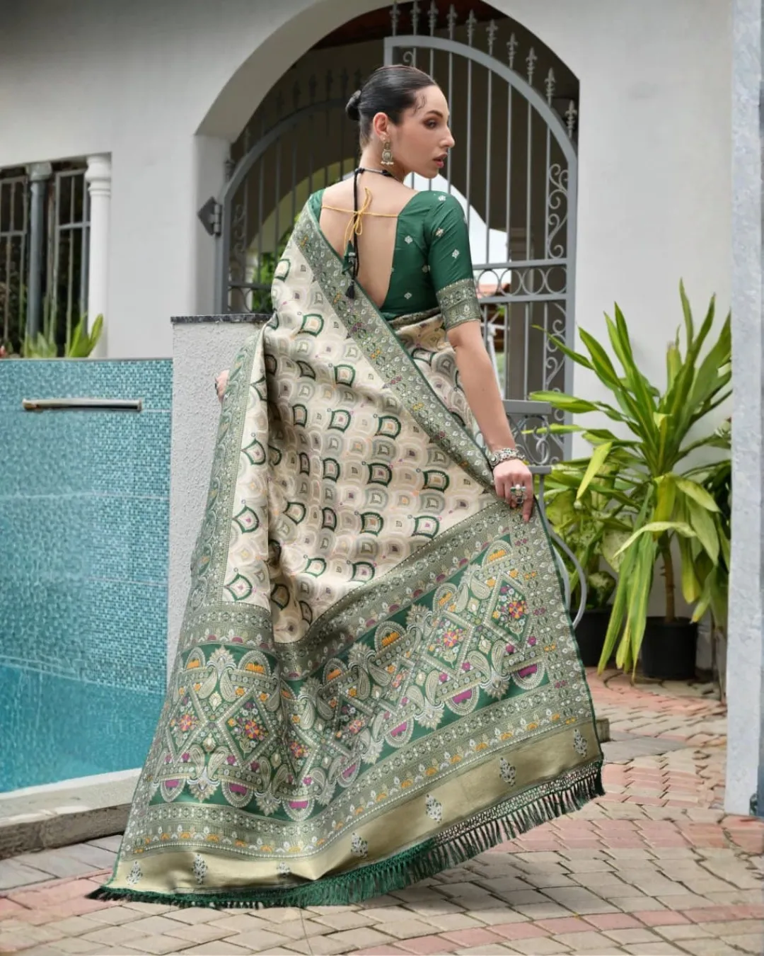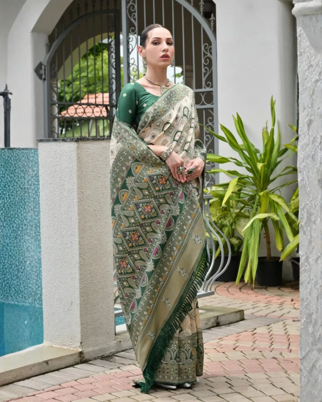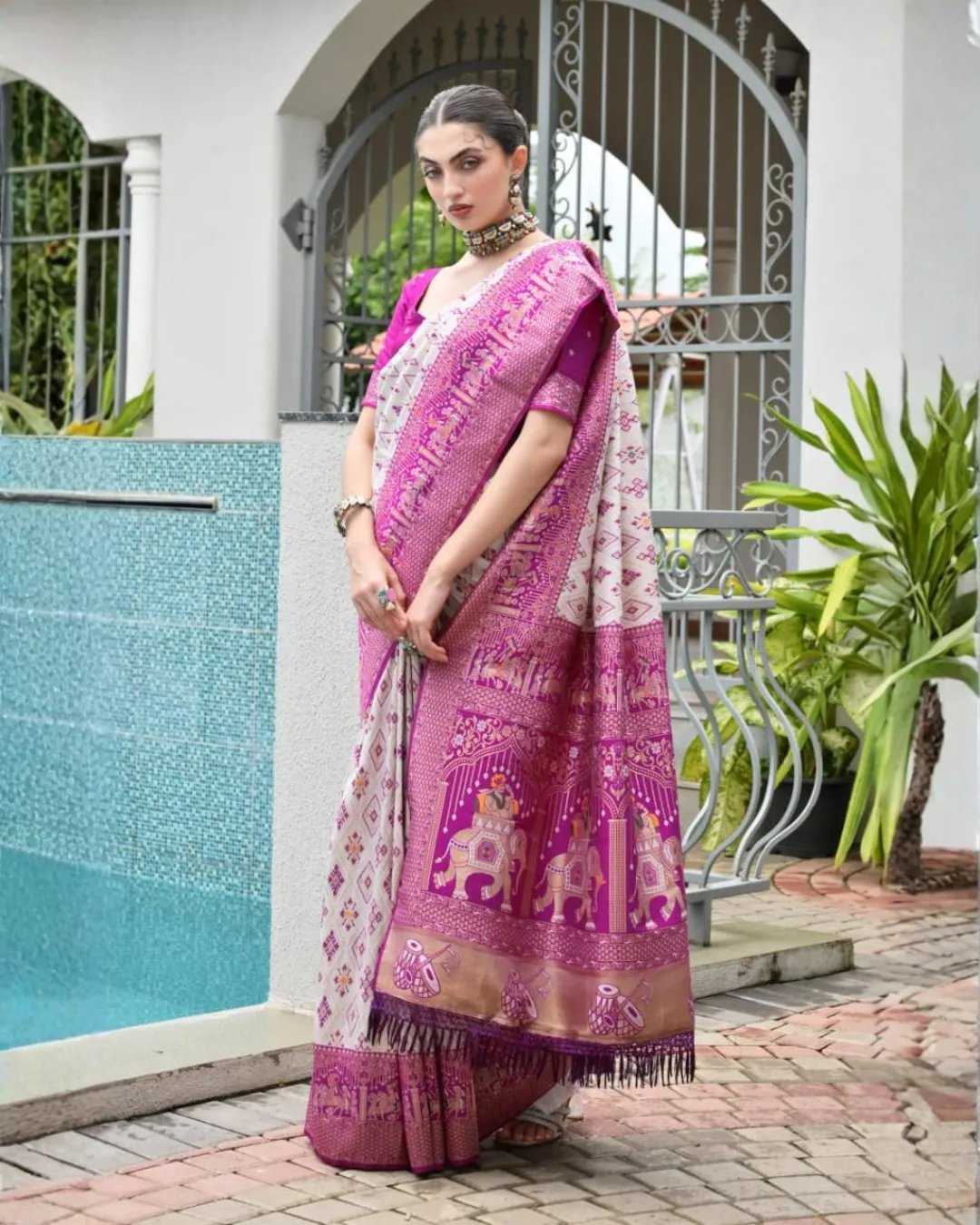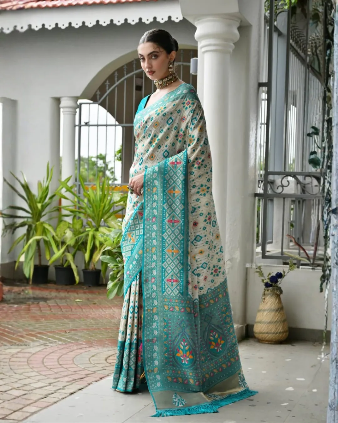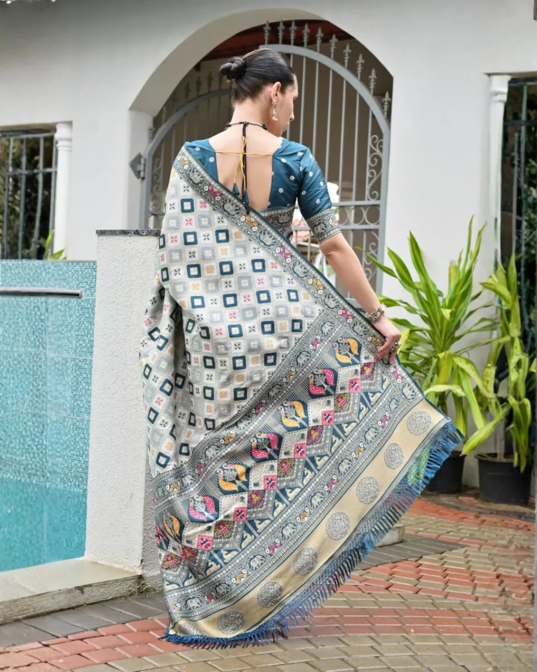 Elegant Banarasi silk saree featuring Patola and Ajrakh weaving, enriched with zari and meena work, contrast border, and tassel pallu.