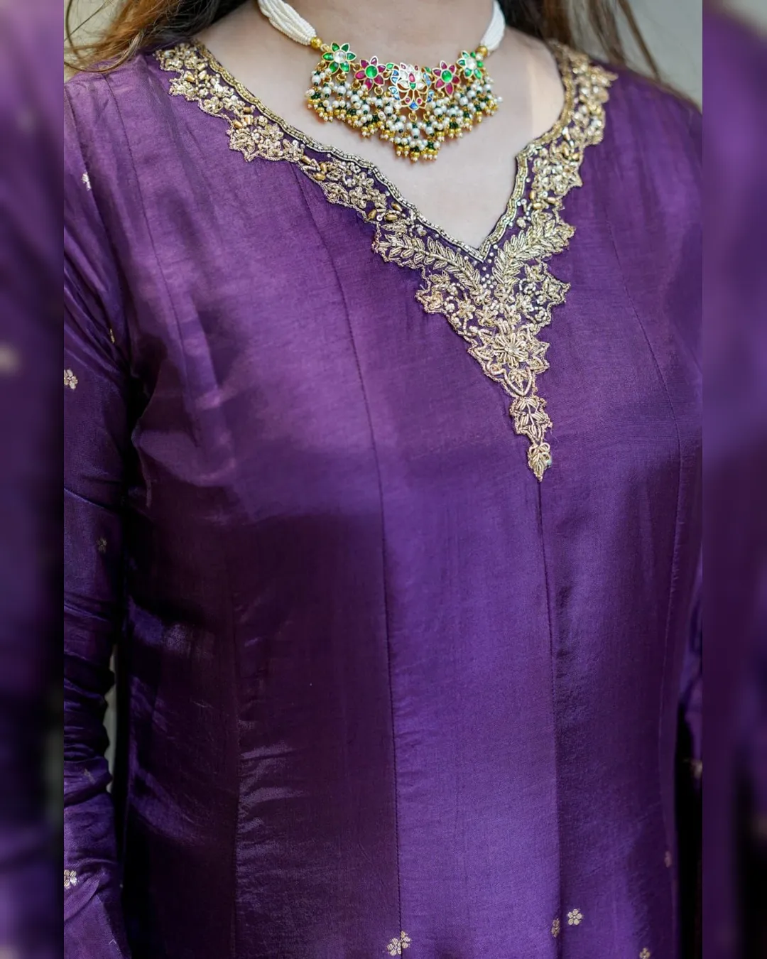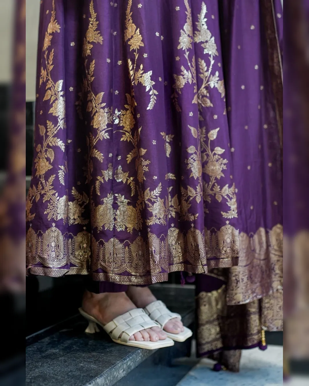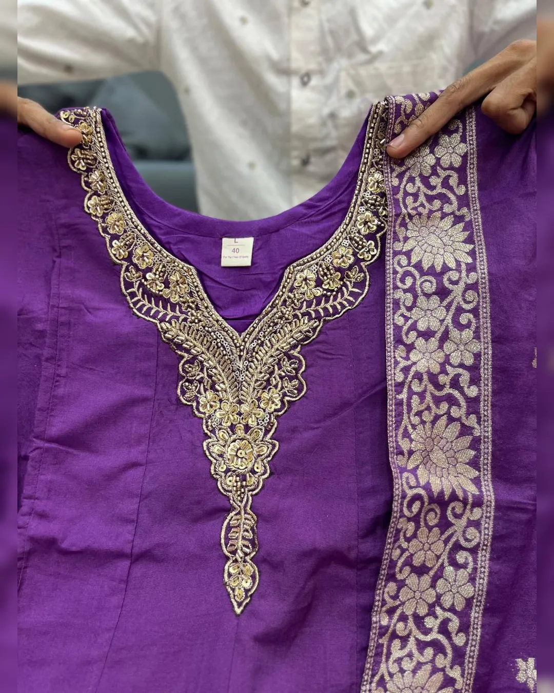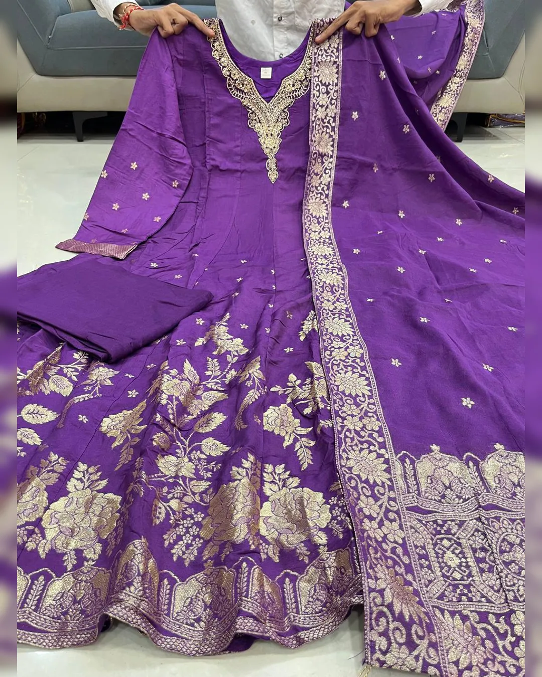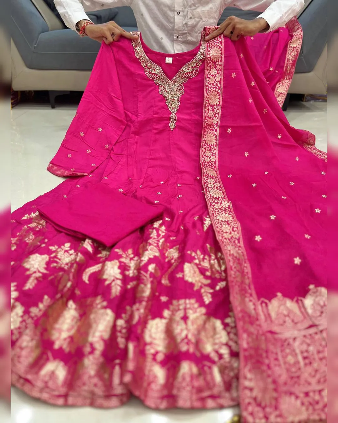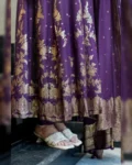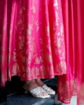 The outfit is enhanced with Banarasi zari weaving detailing on the flare and dupatta, creating a rich traditional appeal that makes it perfect for weddings, parties, and festive celebrations. The soft cotton lining ensures comfort while maintaining the outfit’s regal silhouette.