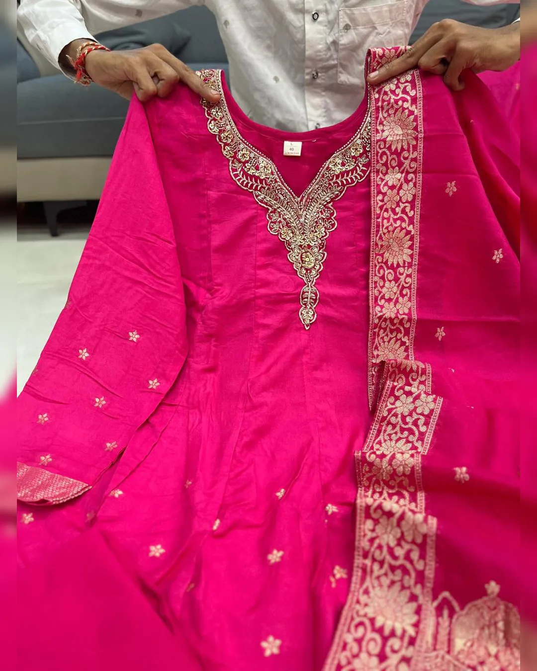 Step into timeless elegance with this stunning Anarkali Style Outfit, designed to bring grace and sophistication to your festive wardrobe. Crafted from premium Chanderi base fabric, this ensemble features a beautifully handworked neckline that adds a luxurious touch to the design.