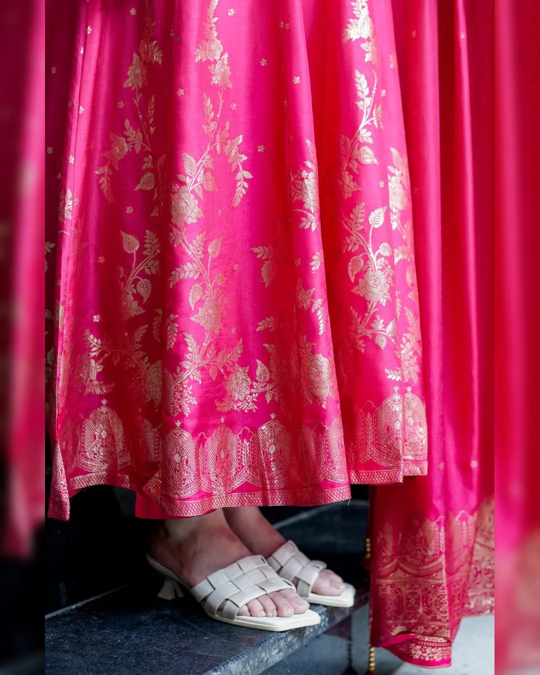 Elegant Chanderi Anarkali style outfit featuring premium Banarasi zari weaving on the flare and dupatta with a beautifully handworked neckline, paired with soft cotton lining for comfort—perfect for weddings and festive occasions.