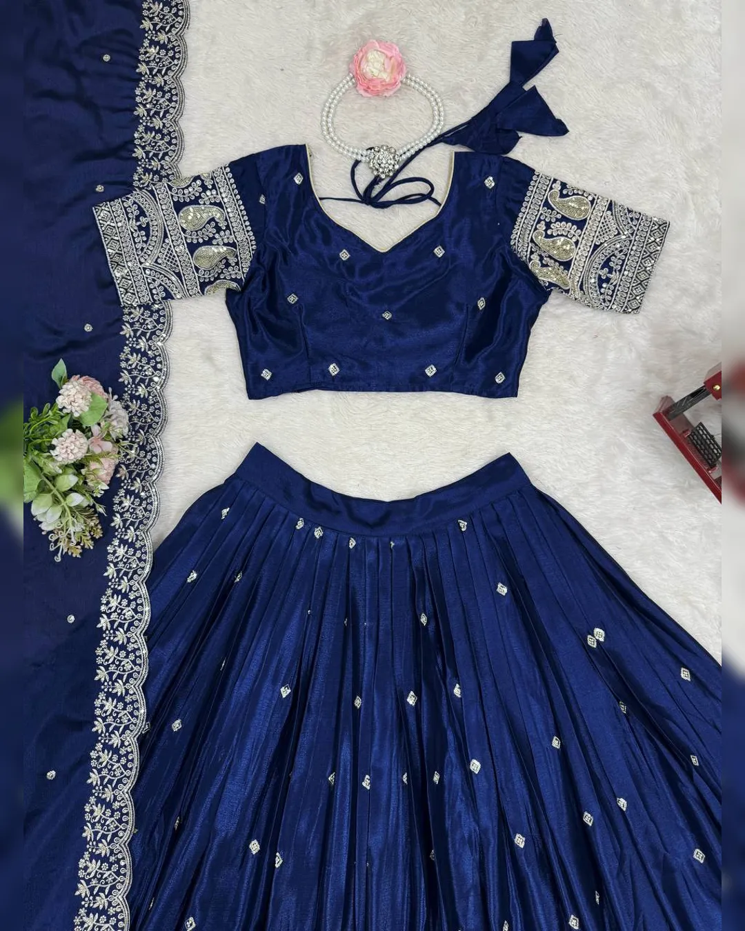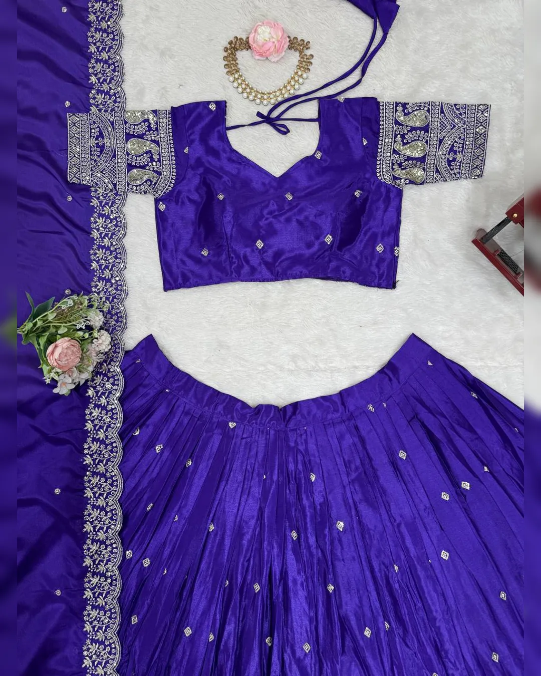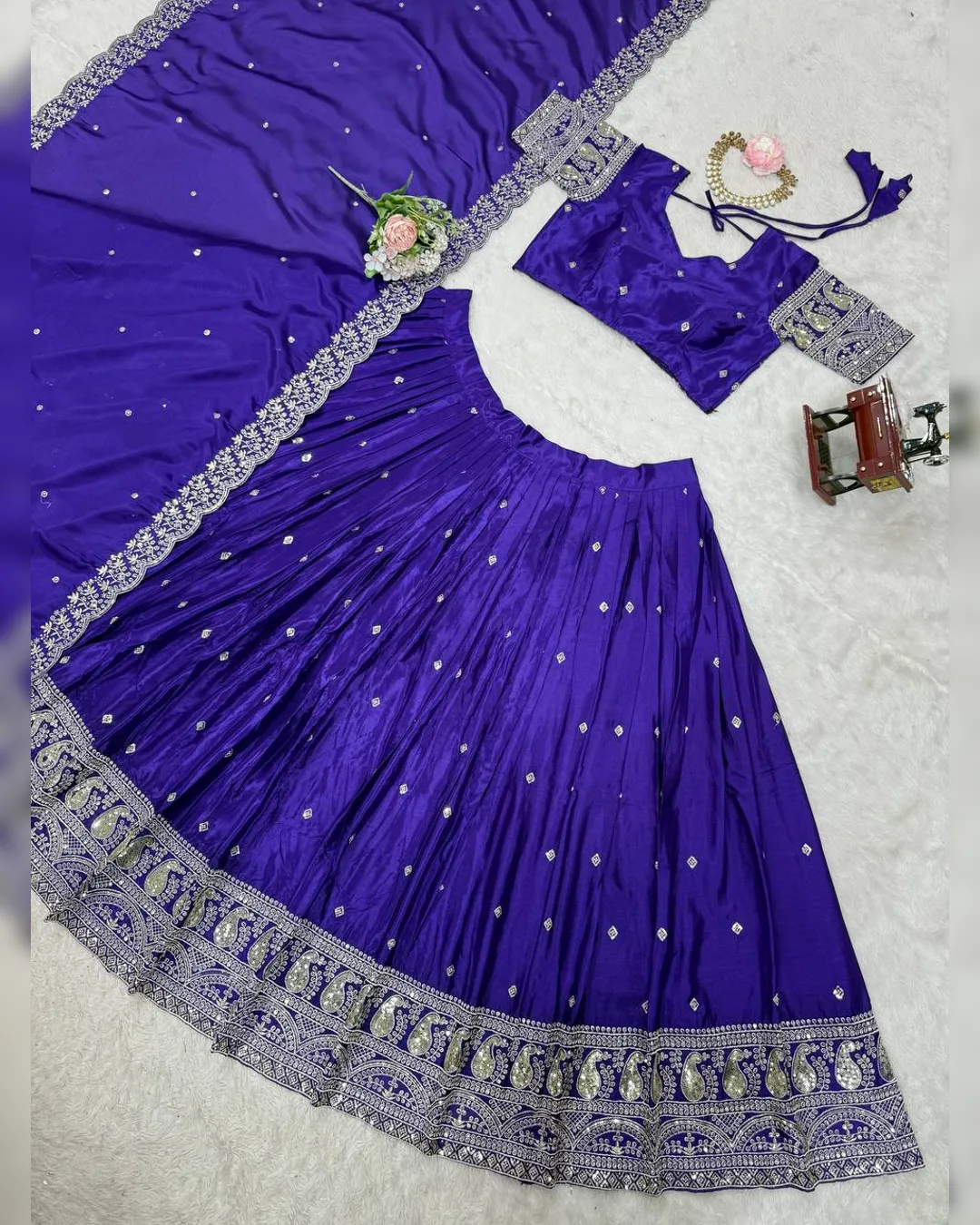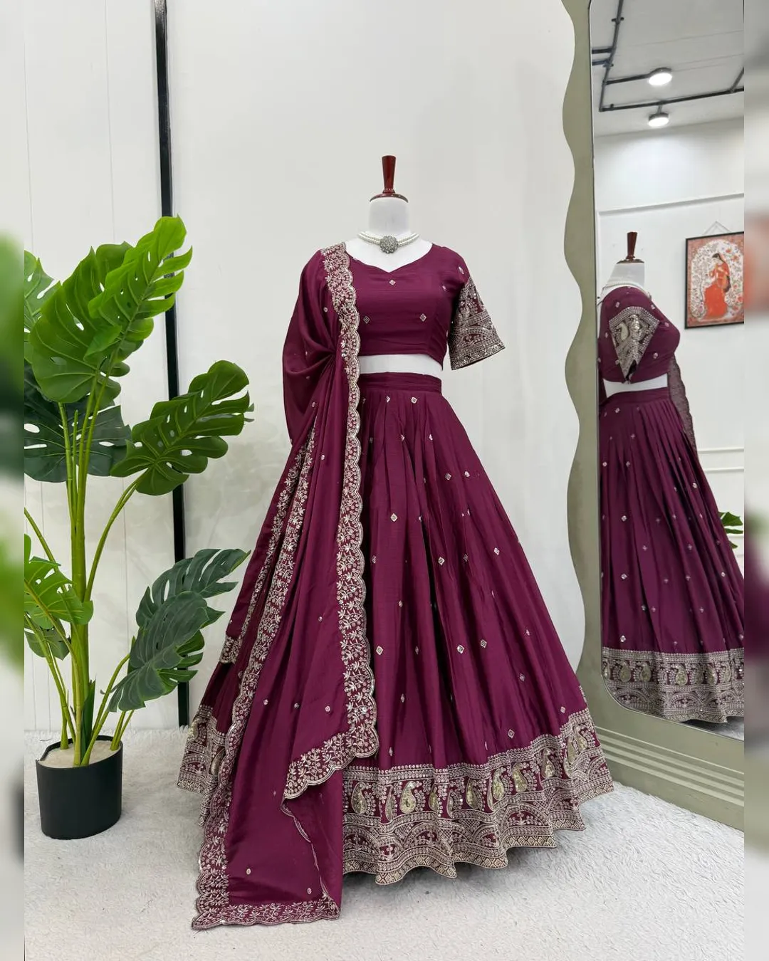 Premium Chinon silk full-stitched lehenga set with thread-sequence embroidery, 3-meter flair with cancan, matching choli, and lace-border dupatta — perfect for wedding and festive wear.