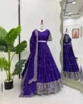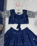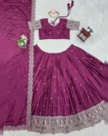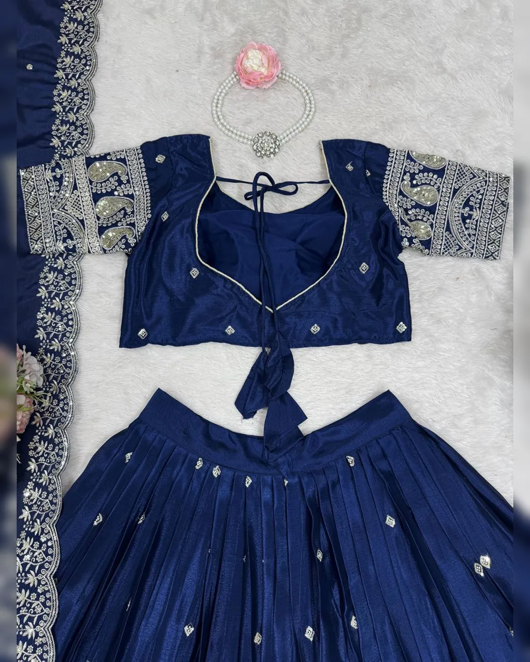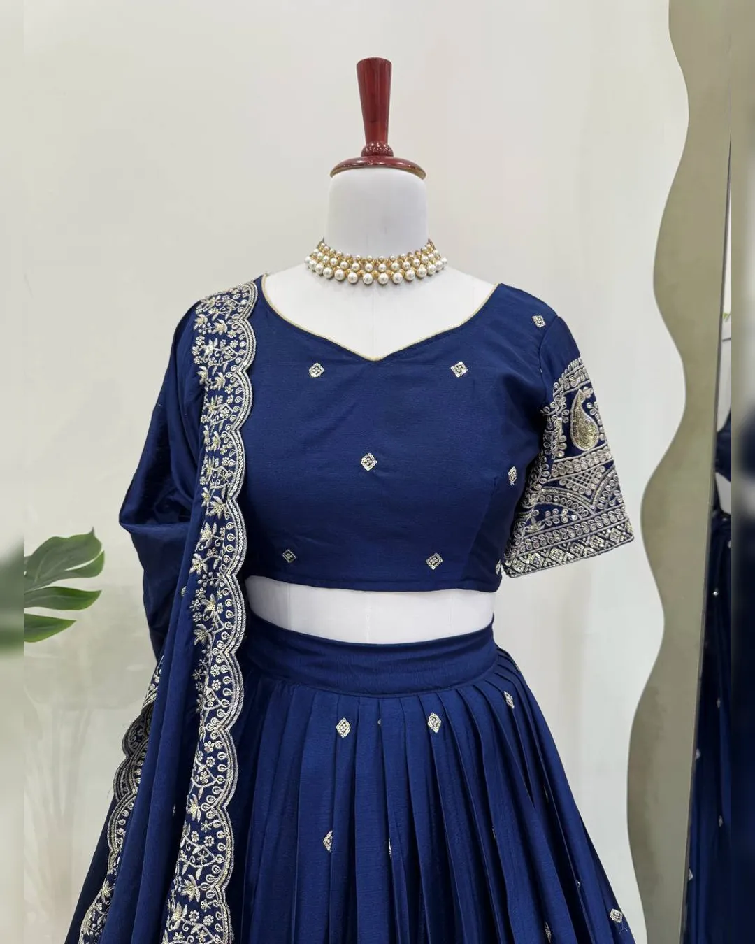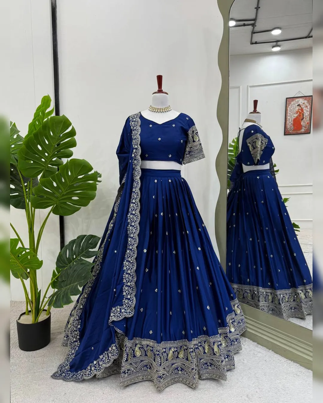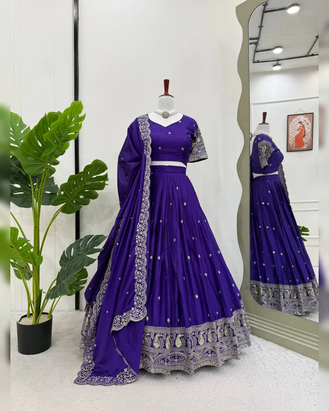 Premium Chinon silk full-stitched lehenga set with thread-sequence embroidery, 3-meter flair with cancan, matching choli, and lace-border dupatta — perfect for wedding and festive wear.