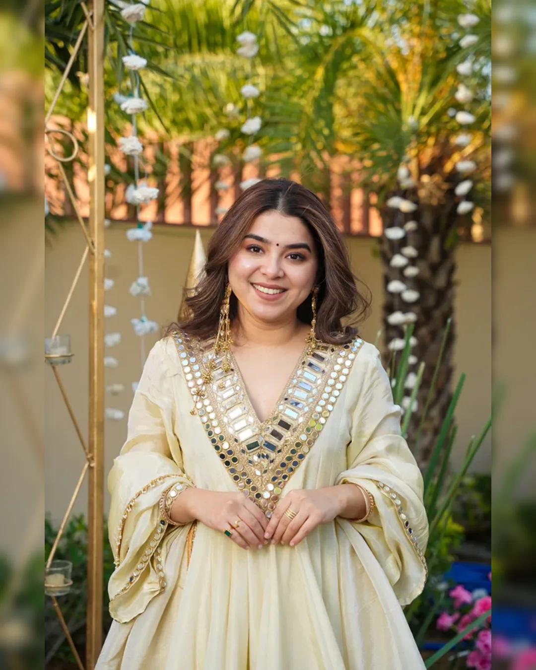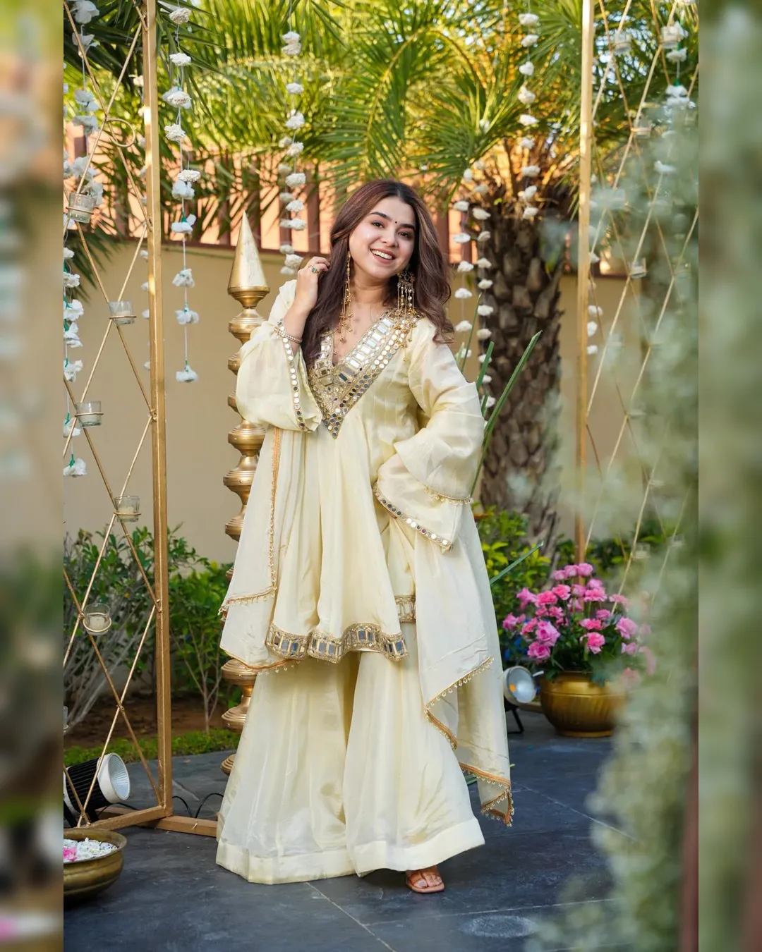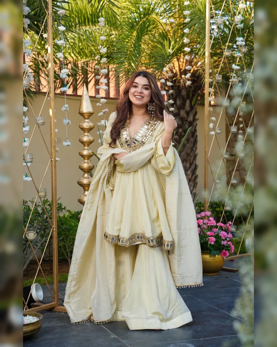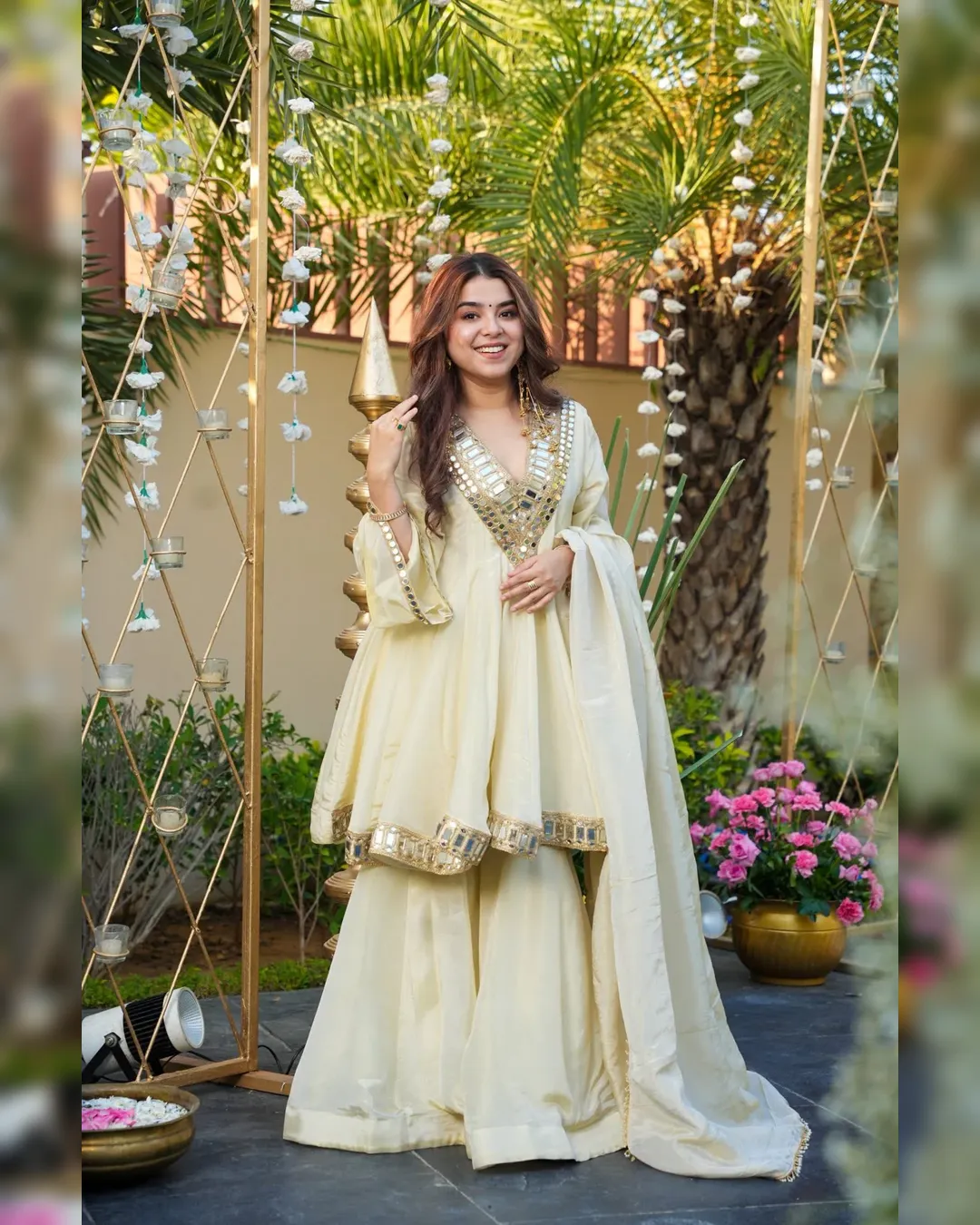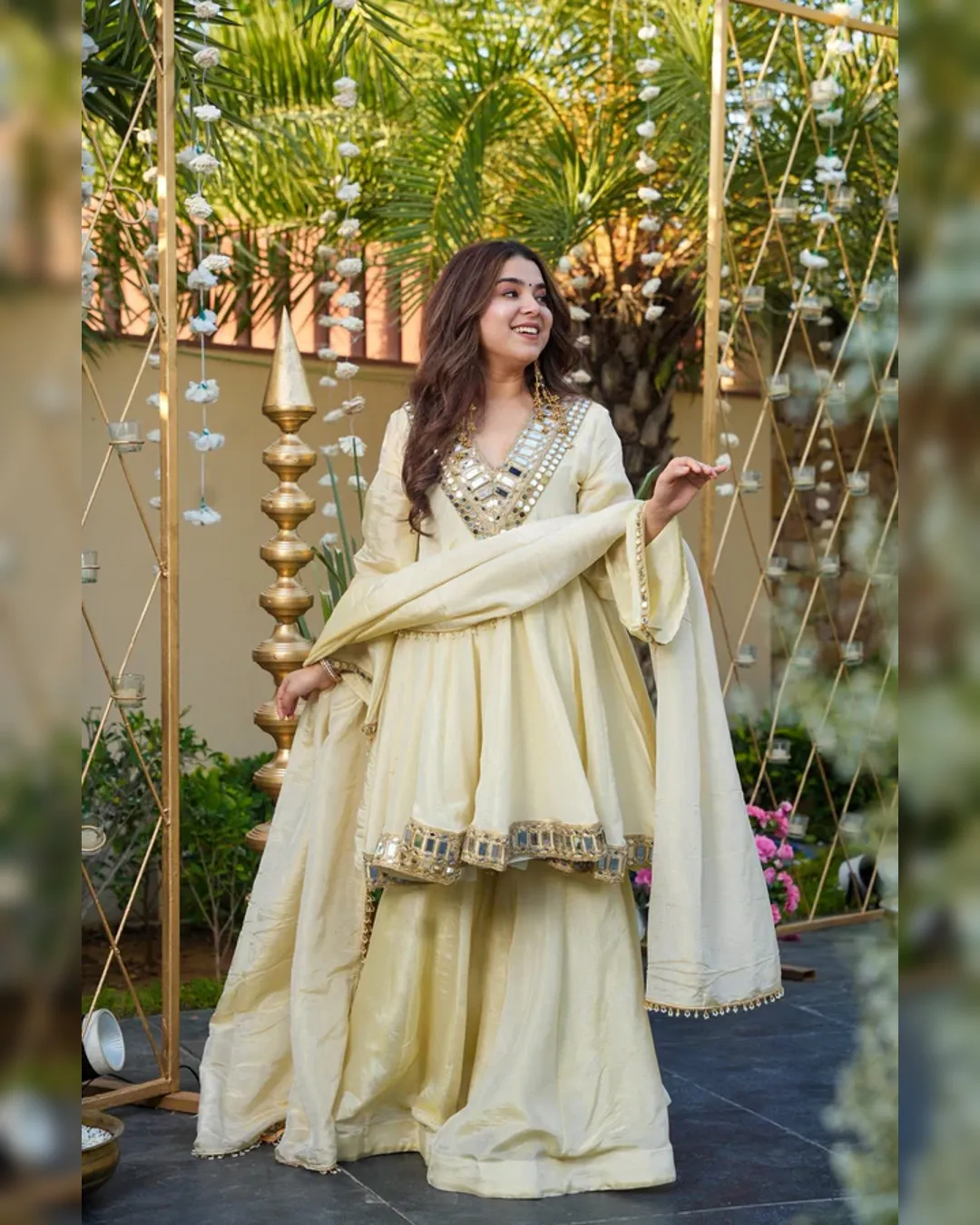 Premium Cosmos Top–Plazo–Dupatta set with real mirror and thread work, 4.5-meter flair top, fully stitched plazo, and fancy lace border dupatta. Soft micro lining and available up to 3XL.