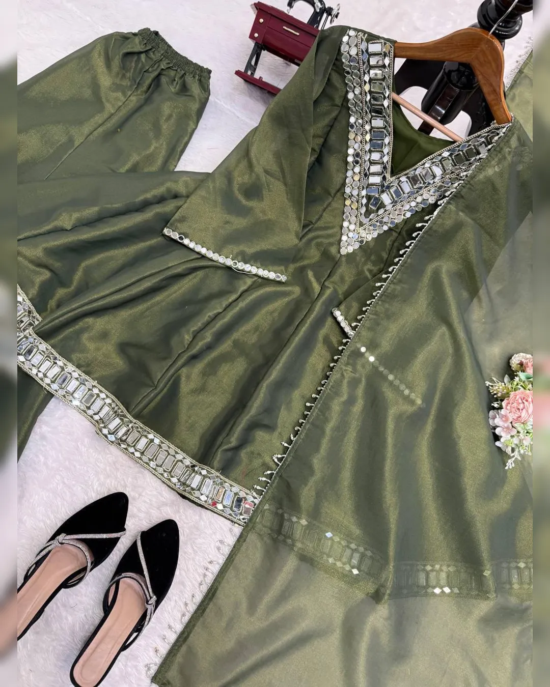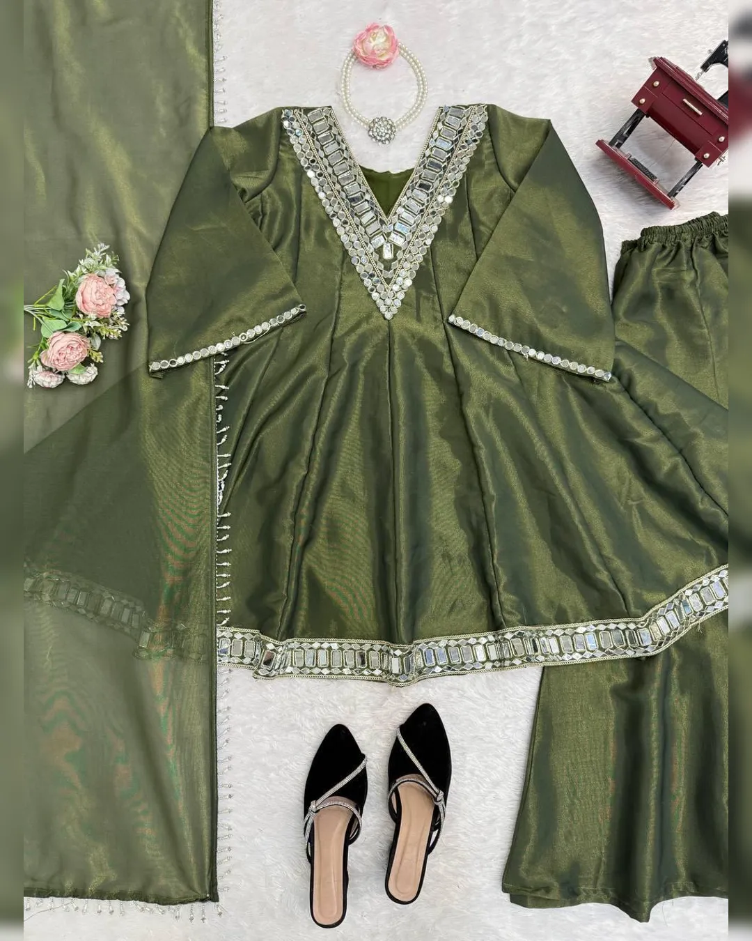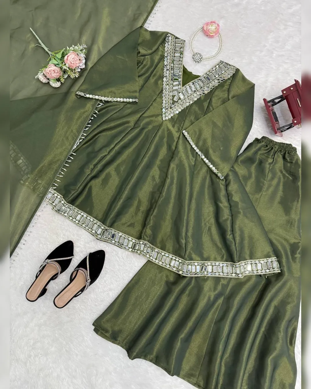 Introducing our Latest Premium Cosmos Top–Plazo–Dupatta Set, crafted to bring elegance, comfort, and festive charm in one stunning outfit. The set features Real Mirror Work with Thread Embroidery, luxurious Cosmos fabric, and rich flair—making it perfect for parties, festive events, and special occasions.