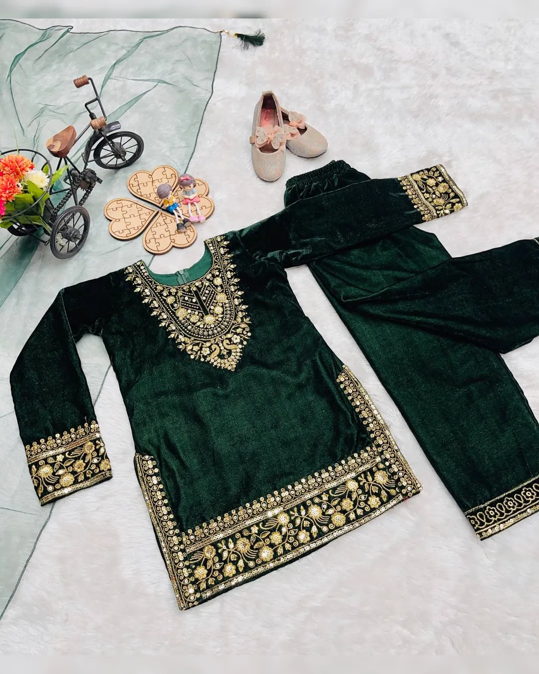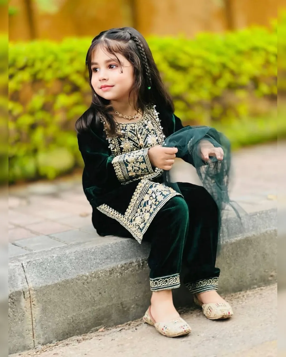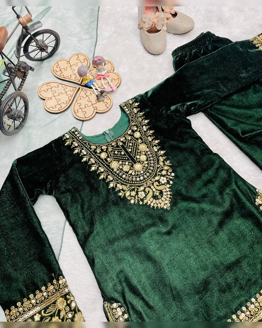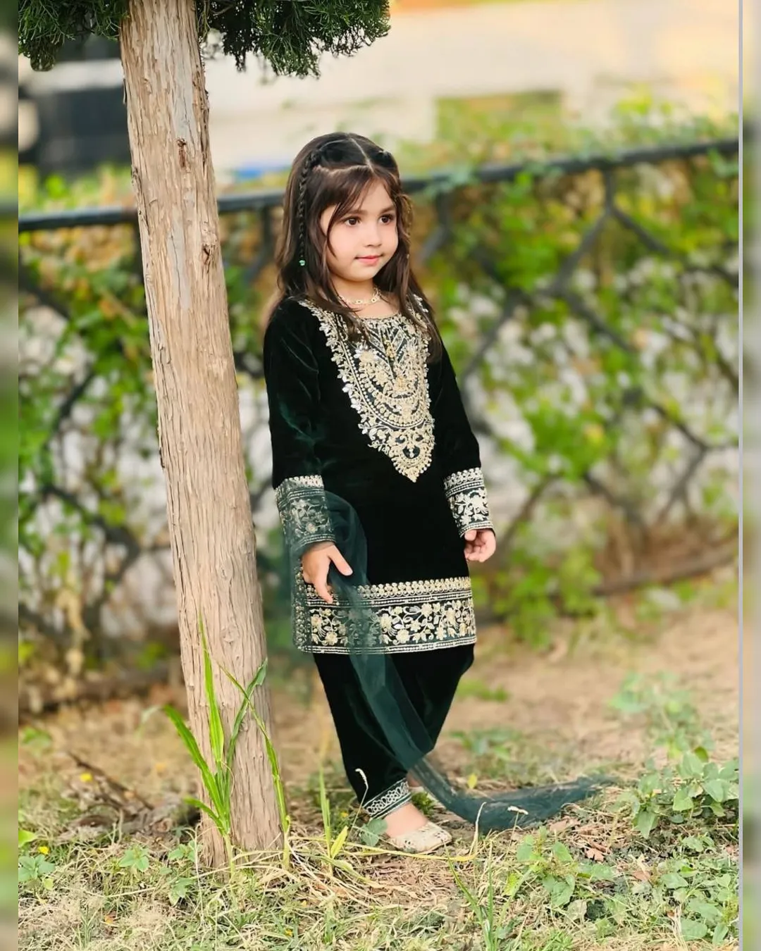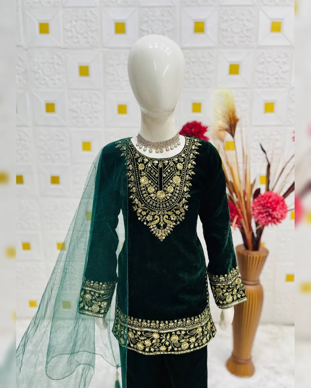 Premium kids party wear set featuring heavy viscose velvet top and bottom with embroidered sequence work and a fancy net dupatta, fully stitched and ready to wear.