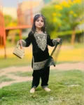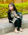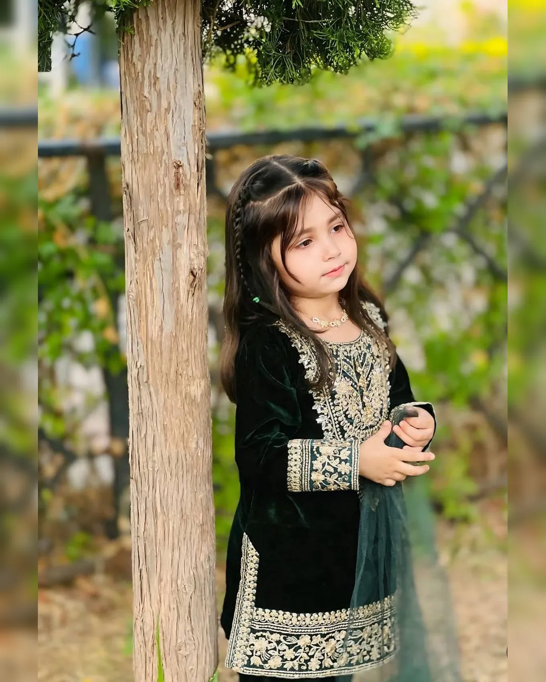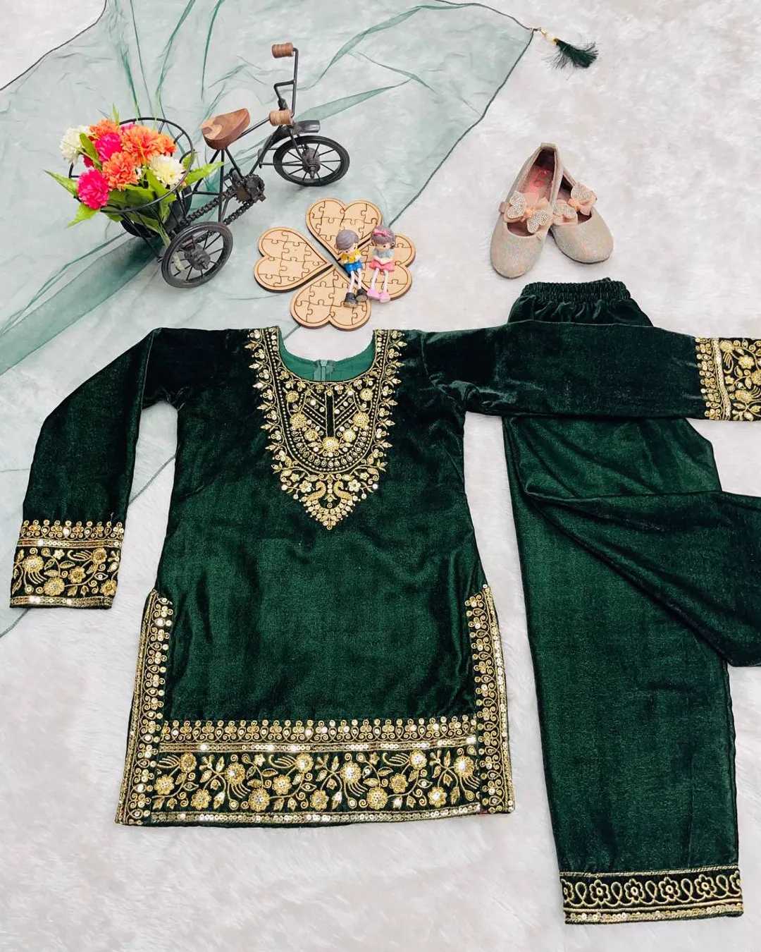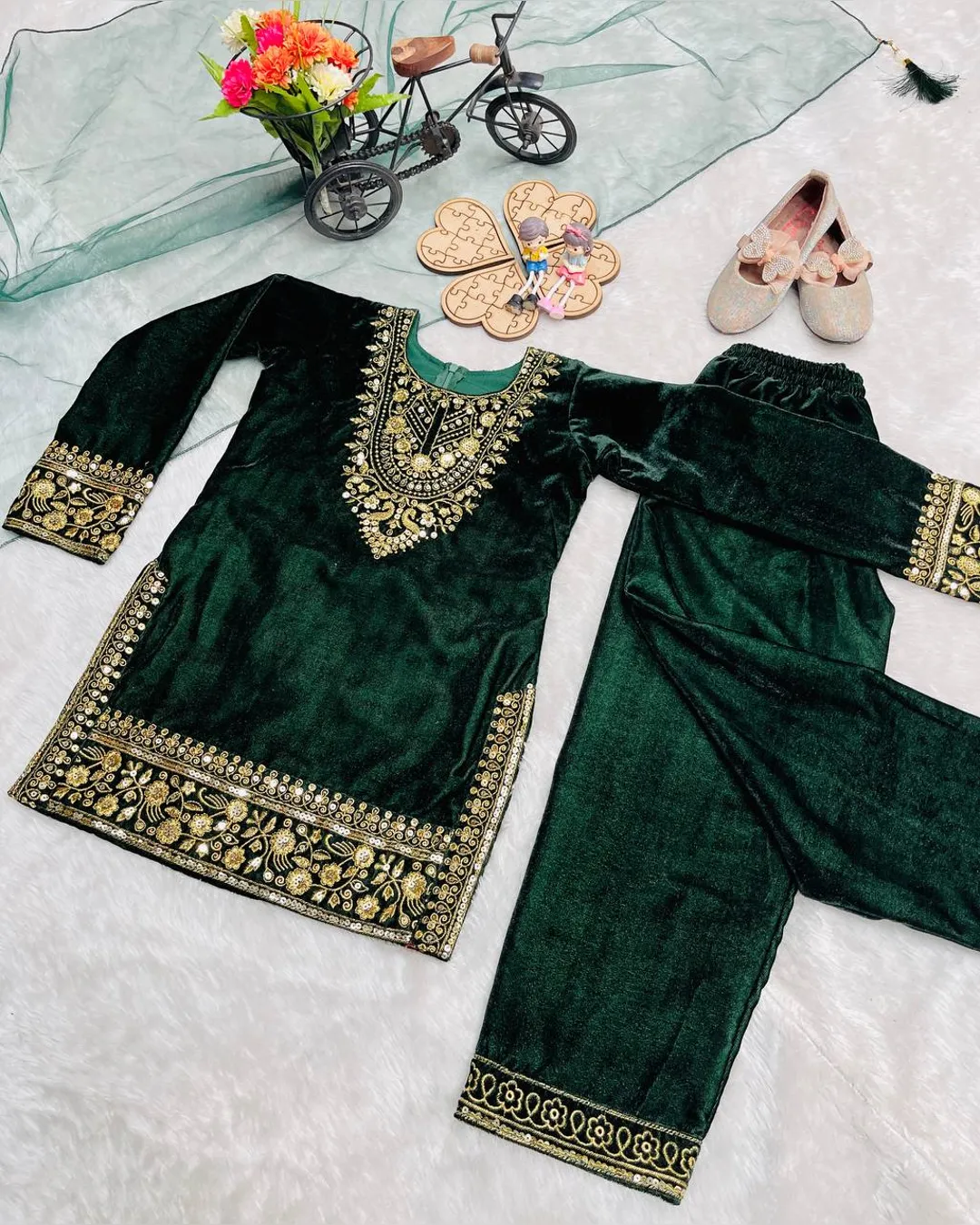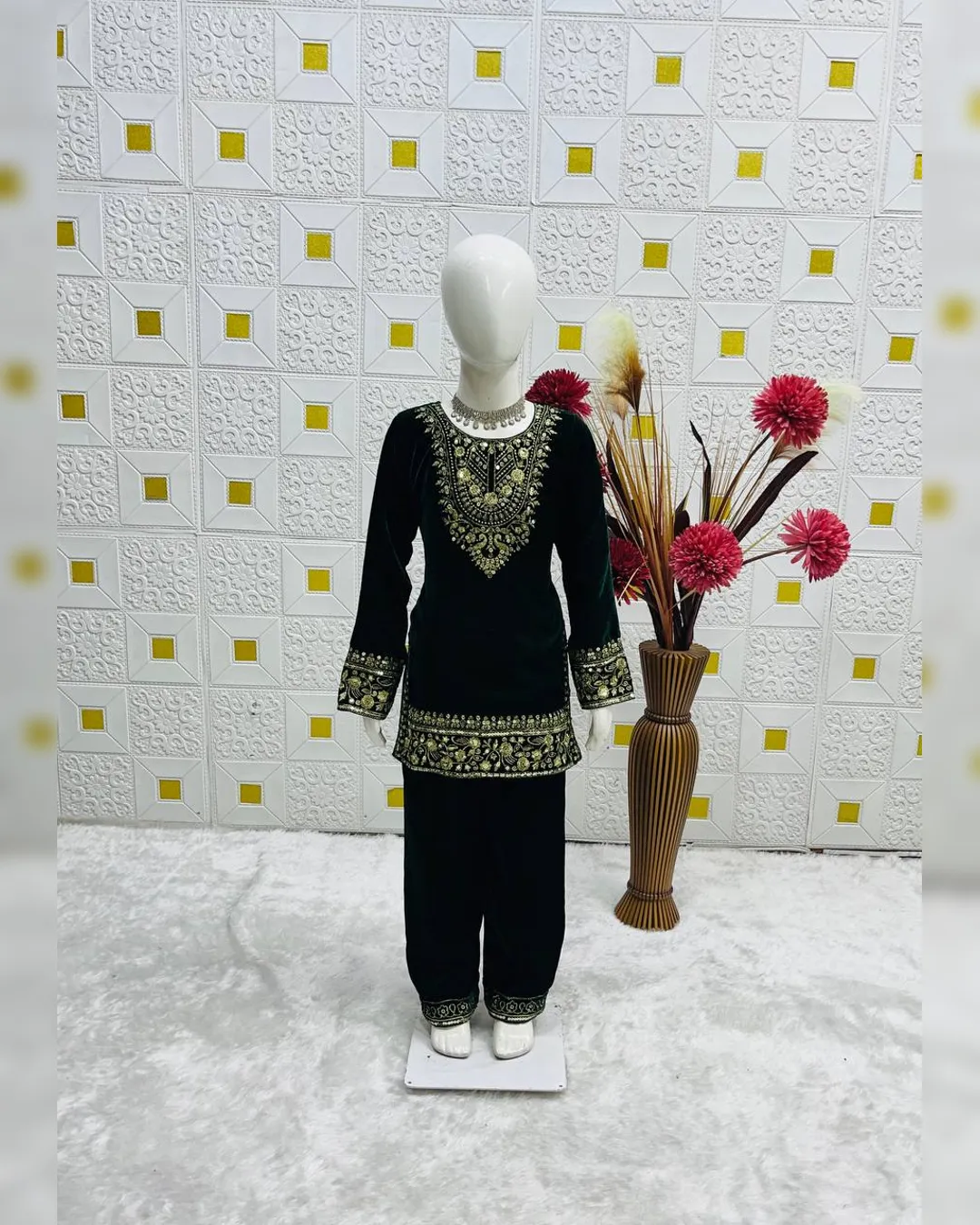 Premium kids party wear set featuring heavy viscose velvet top and bottom with embroidered sequence work and a fancy net dupatta, fully stitched and ready to wear.