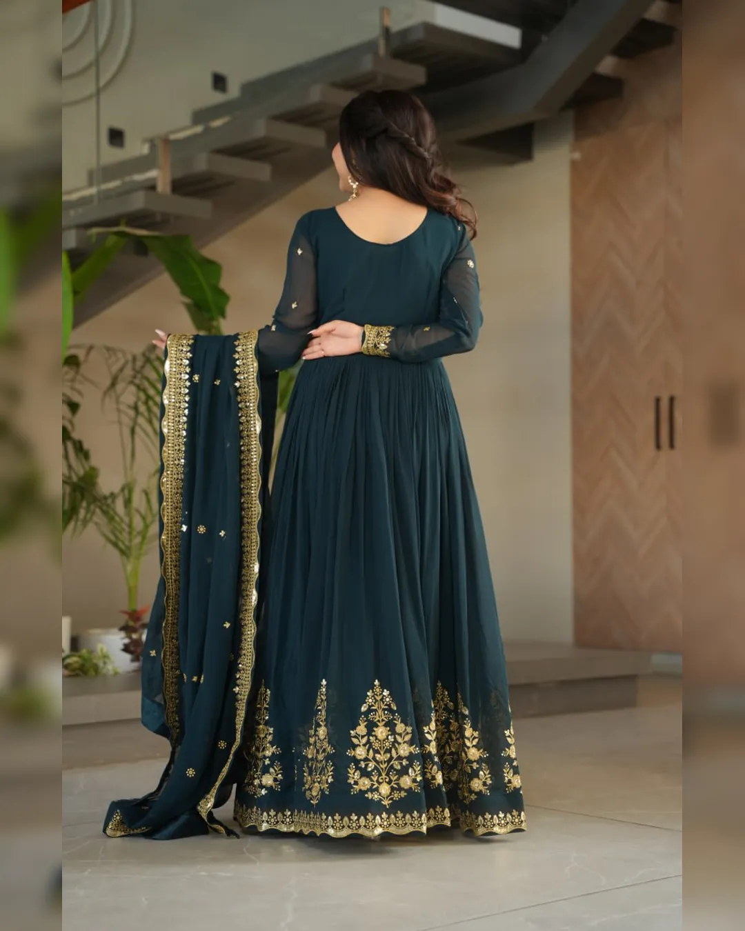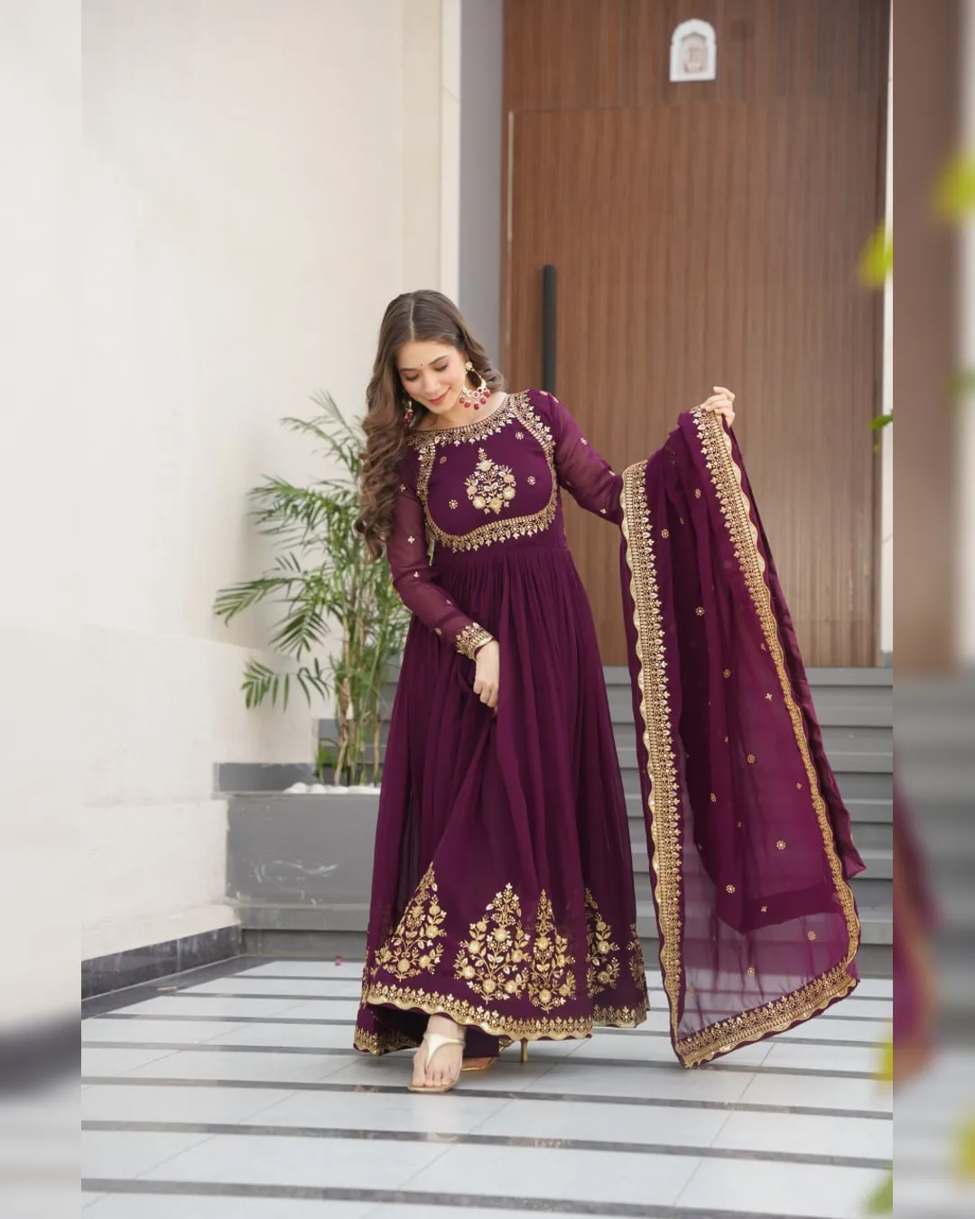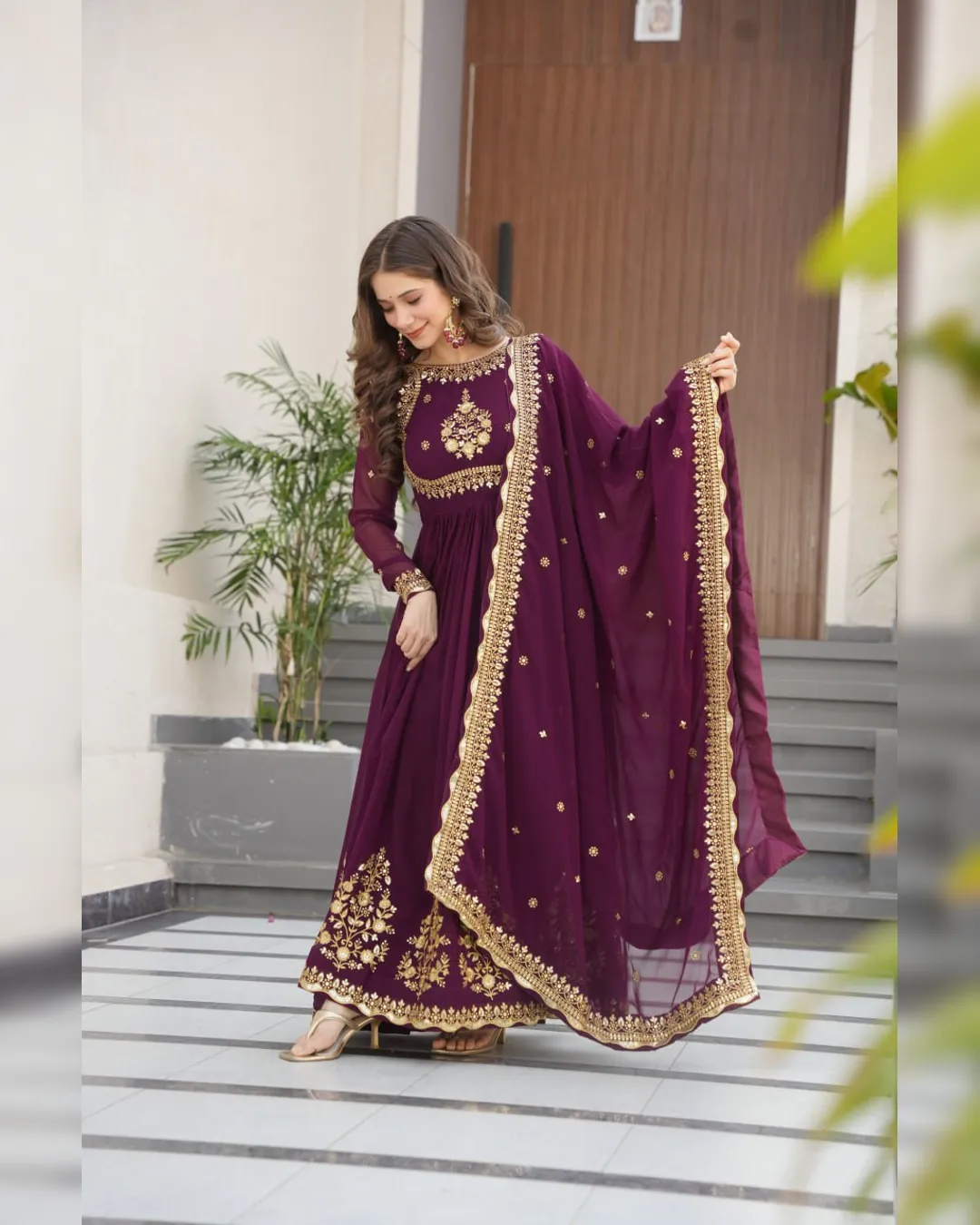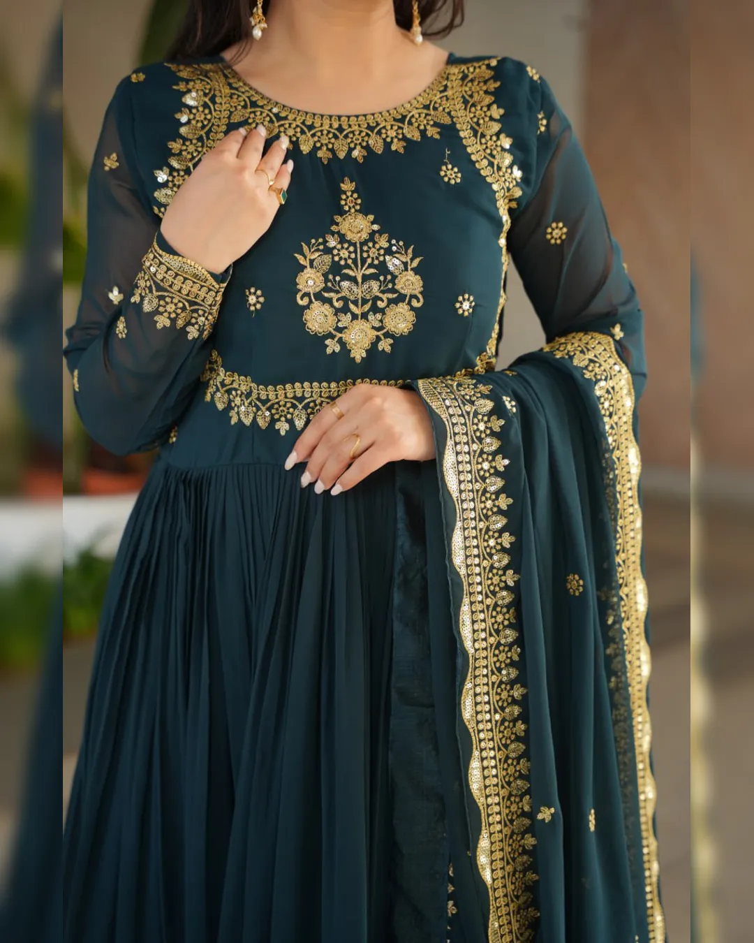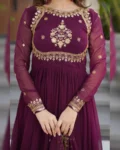 A ready‑to‑wear faux blooming georgette gown with full cotton lining, ornate zari‑thread & sequin embroidery, and a matching embroidered dupatta for festive elegance.