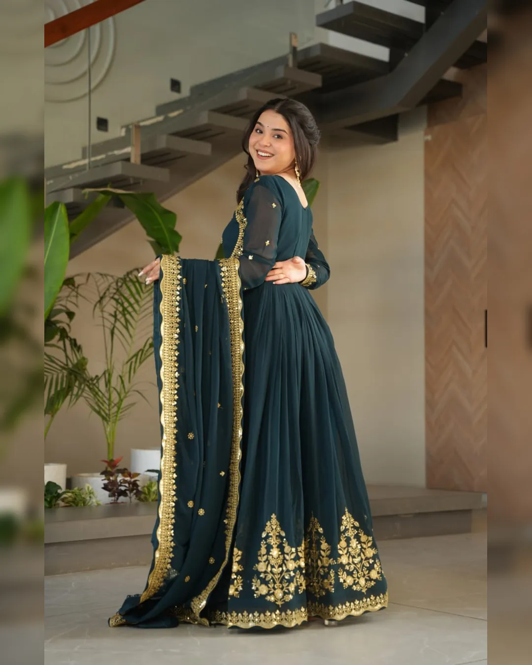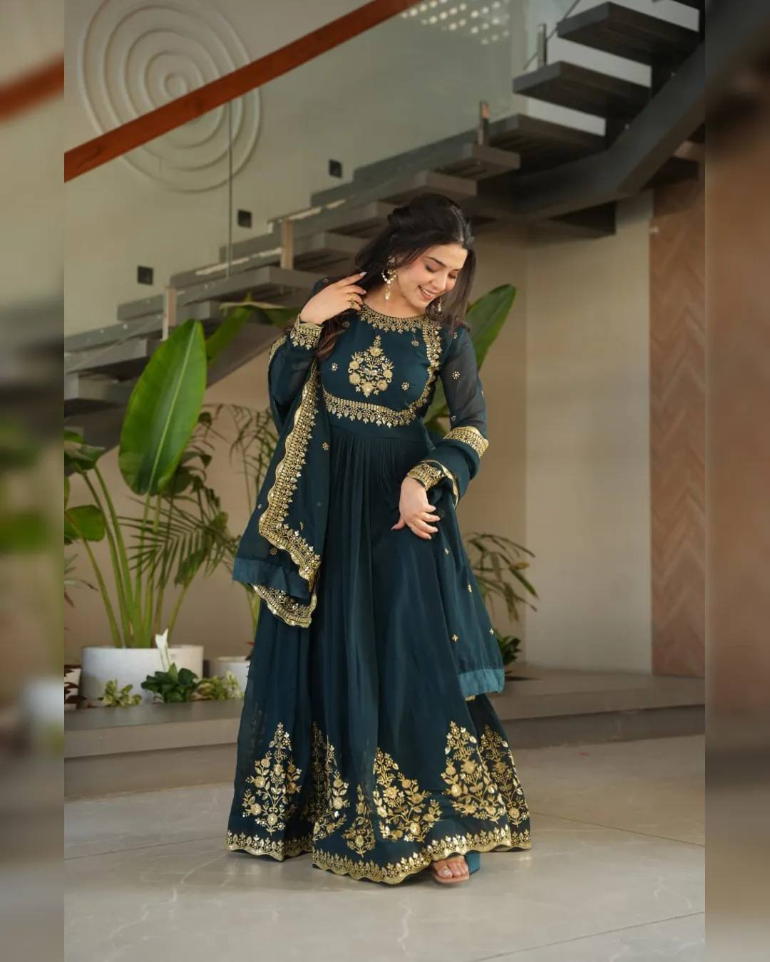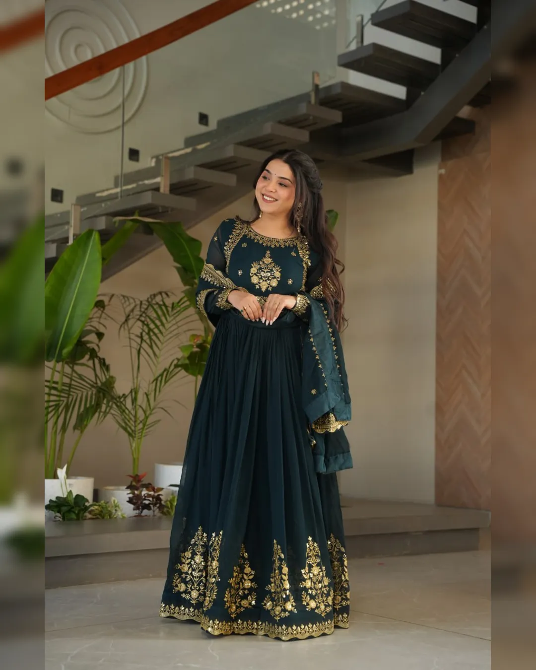 A ready‑to‑wear faux blooming georgette gown with full cotton lining, ornate zari‑thread & sequin embroidery, and a matching embroidered dupatta for festive elegance.