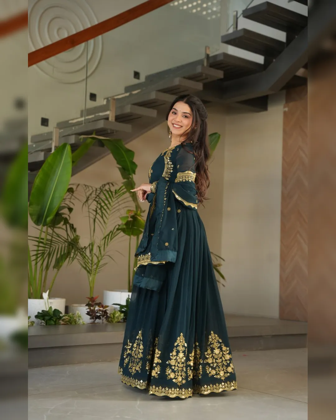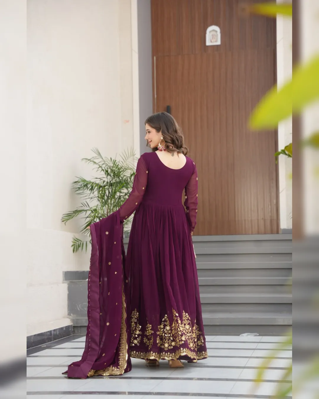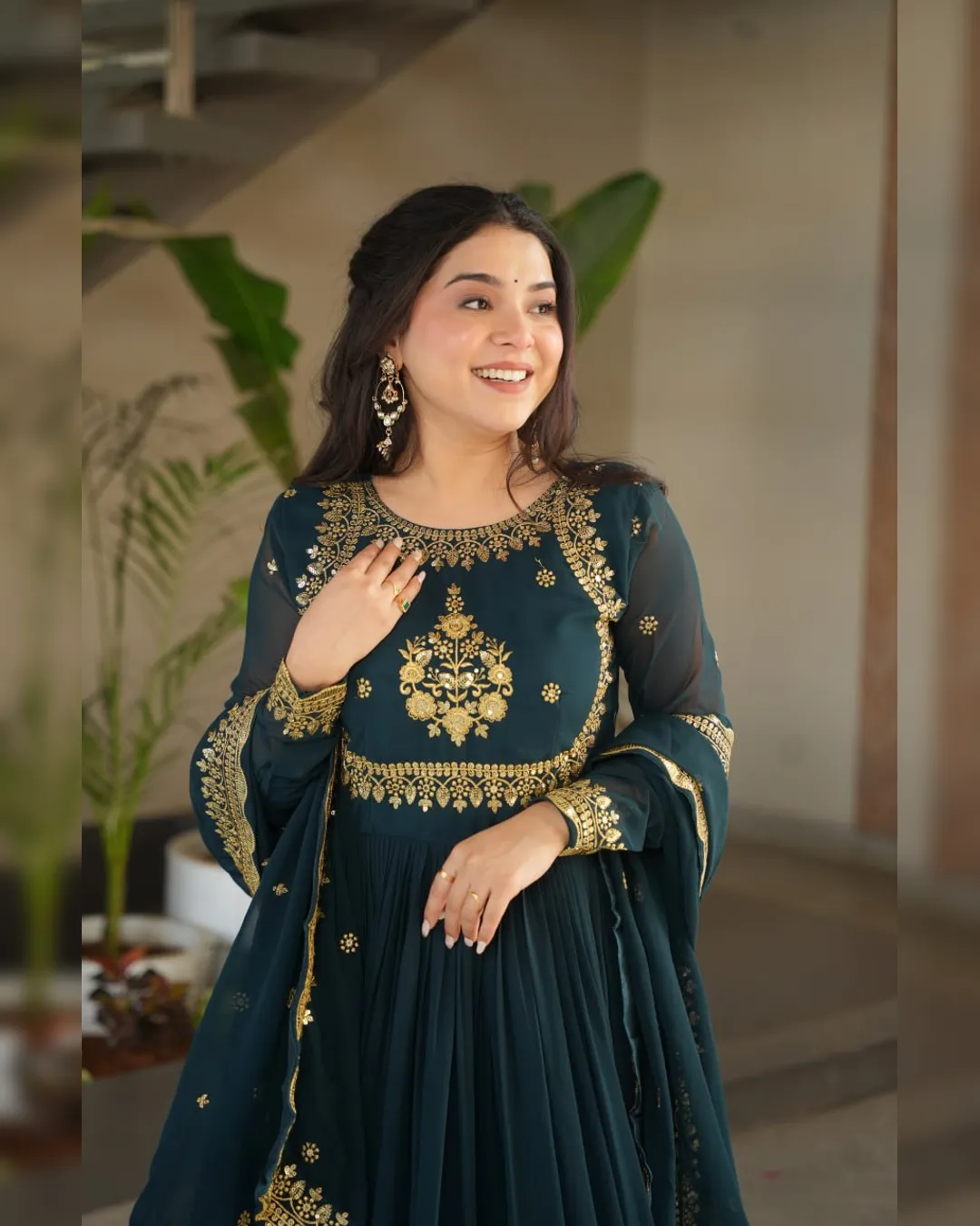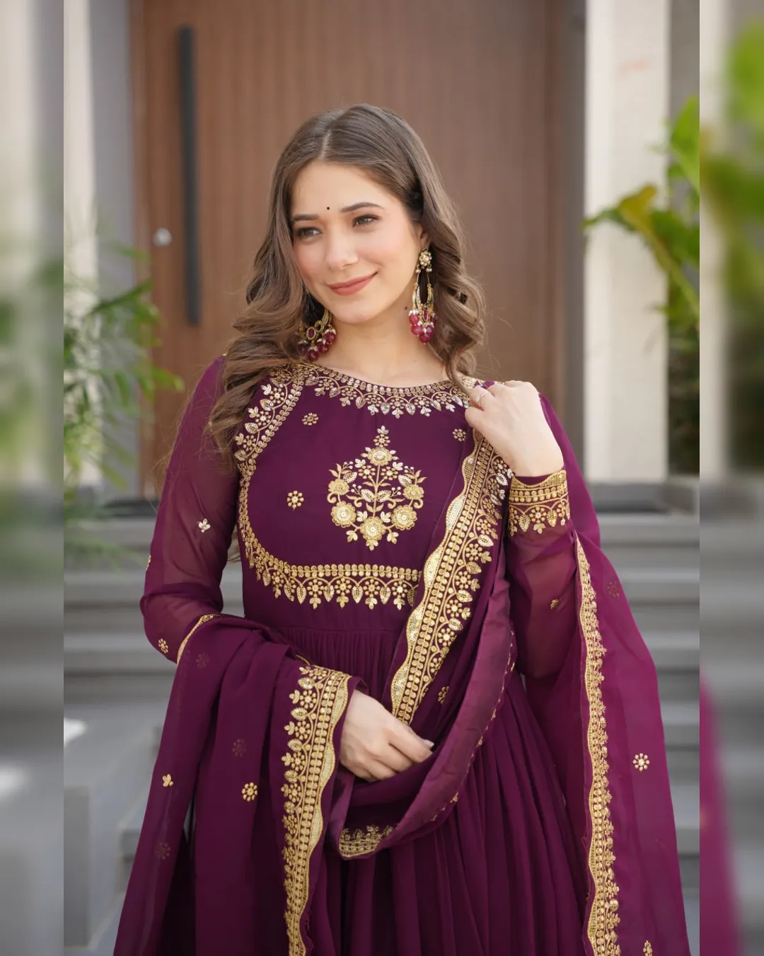 A ready‑to‑wear faux blooming georgette gown with full cotton lining, ornate zari‑thread & sequin embroidery, and a matching embroidered dupatta for festive elegance.