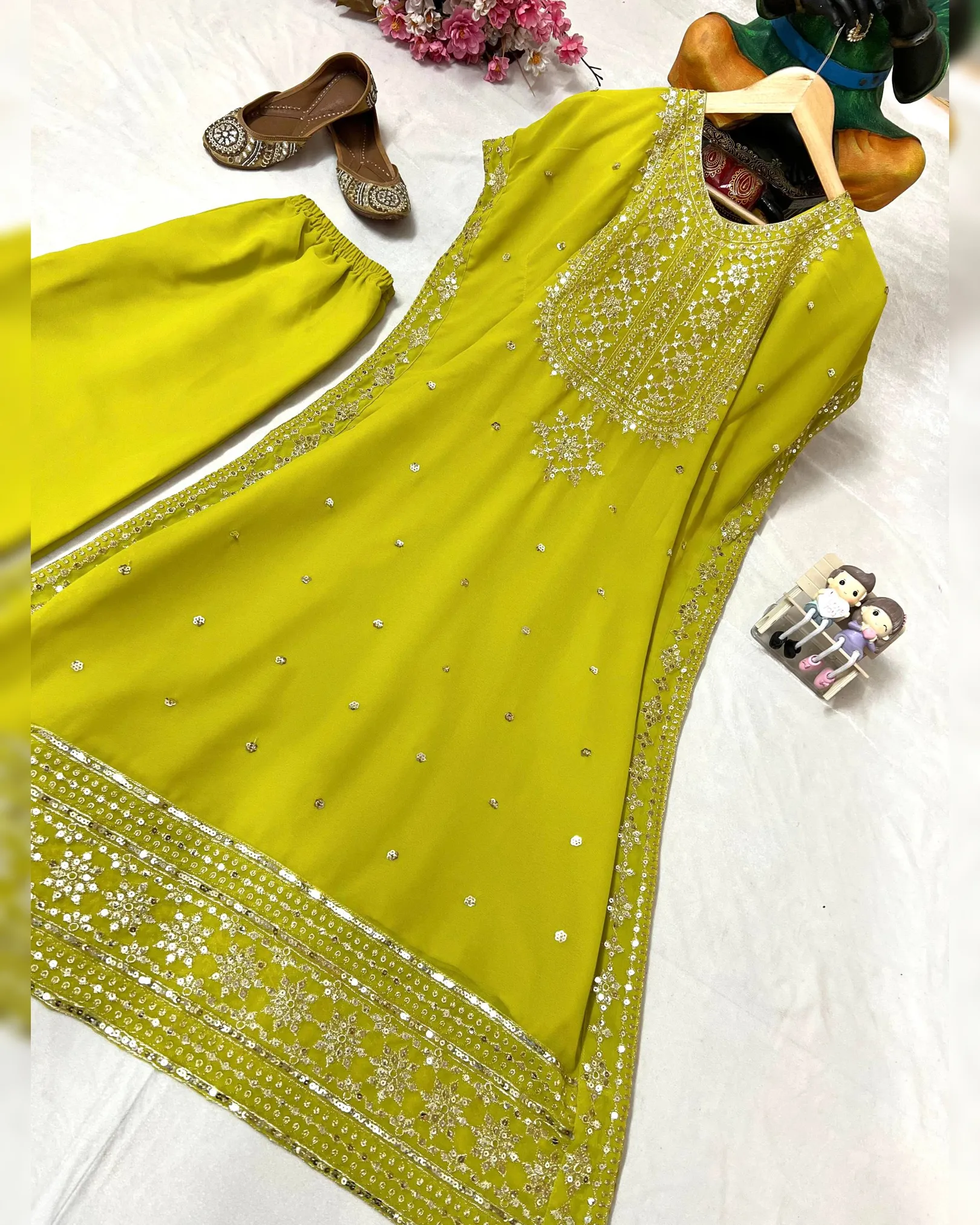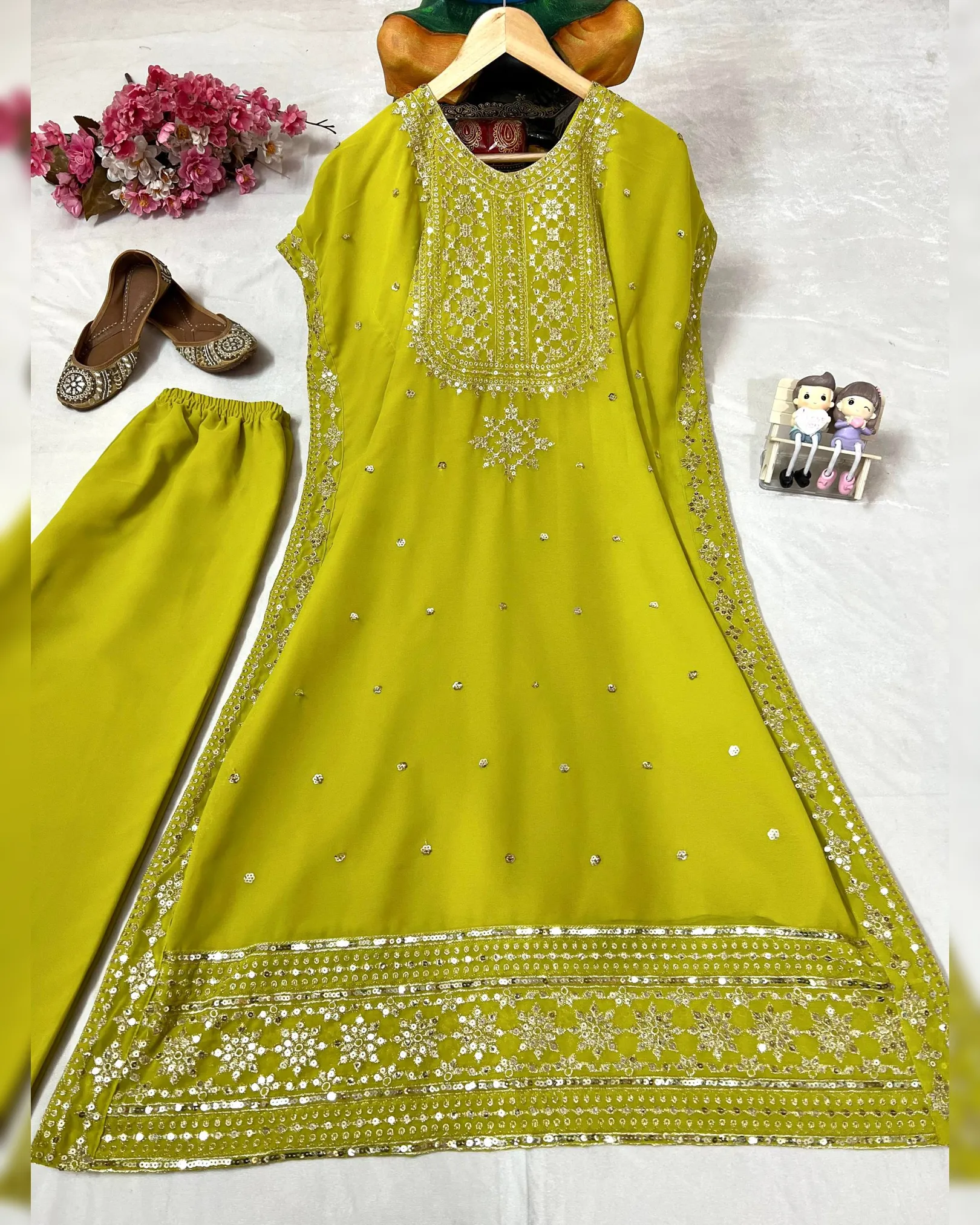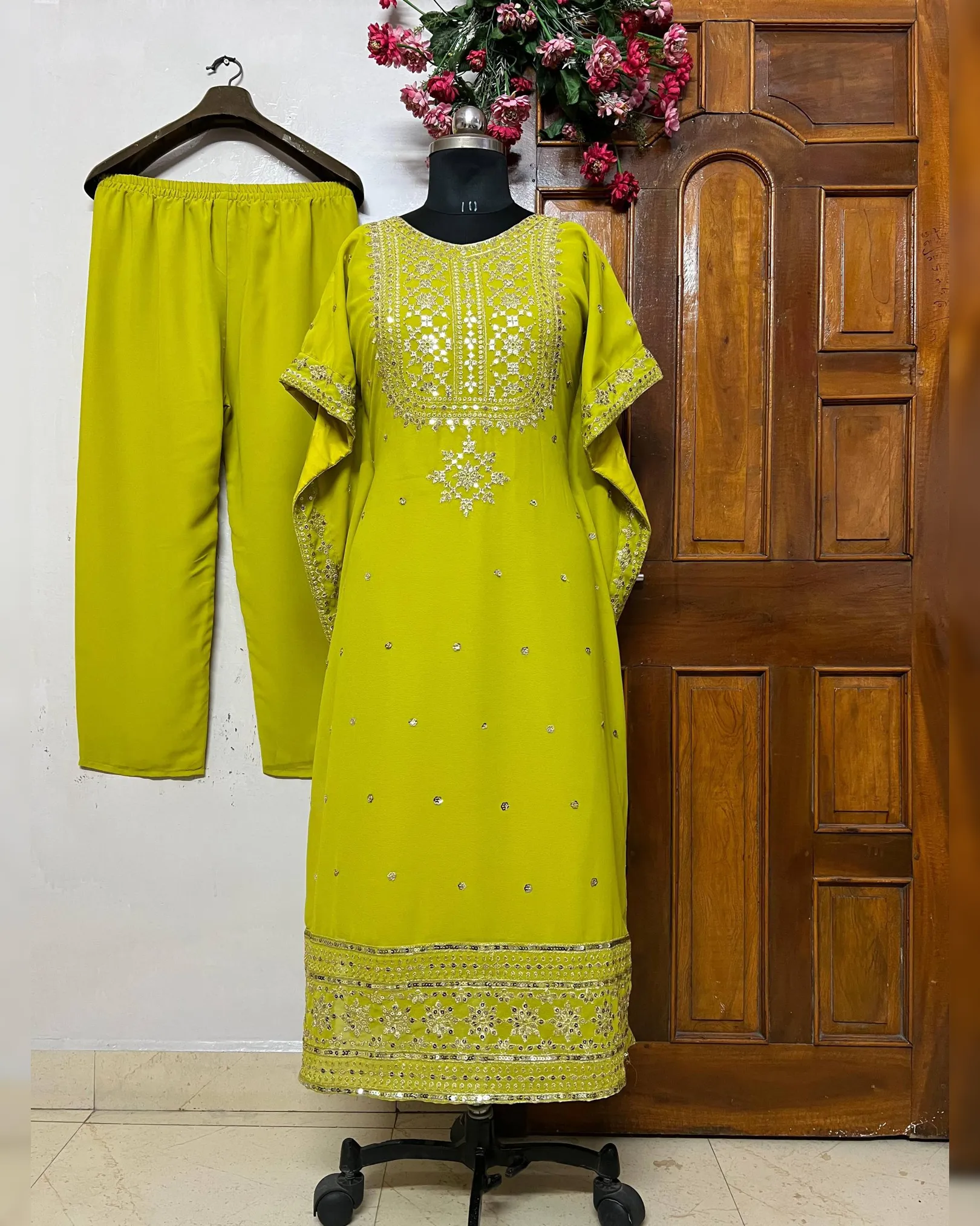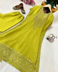 Premium faux georgette kaftan–pant set with elegant 5mm sequins and zari embroidery, fully stitched and ready to wear.