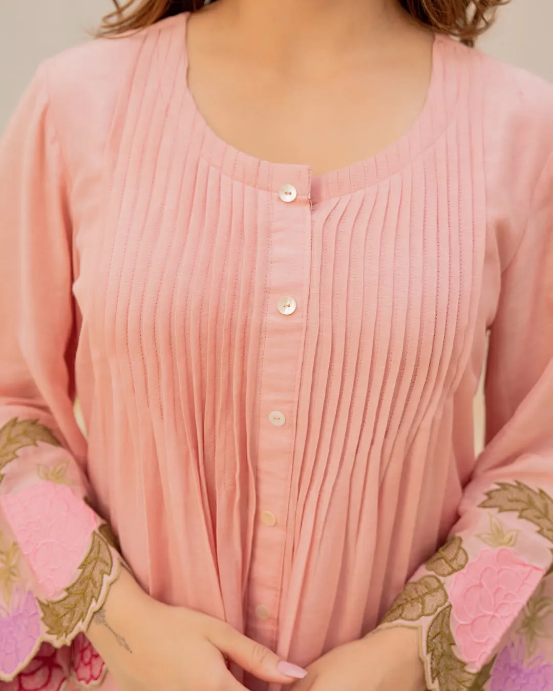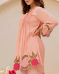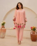 Stylish Premium Mul Chanderi cord set featuring beautiful full embroidery with elegant cut work, paired with matching pants and cotton lining for comfort. Comes with a complimentary shimmering bracelet.