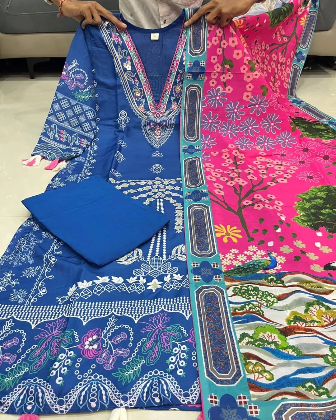 Paired with a matching pant and a stylish dupatta, the set creates a perfectly coordinated 3-piece ethnic ensemble. It also features a pure cotton lining, ensuring comfort throughout the day.