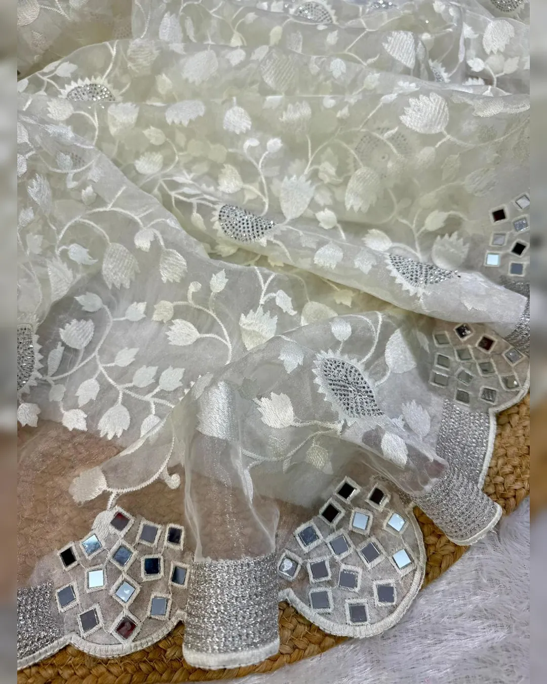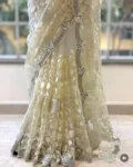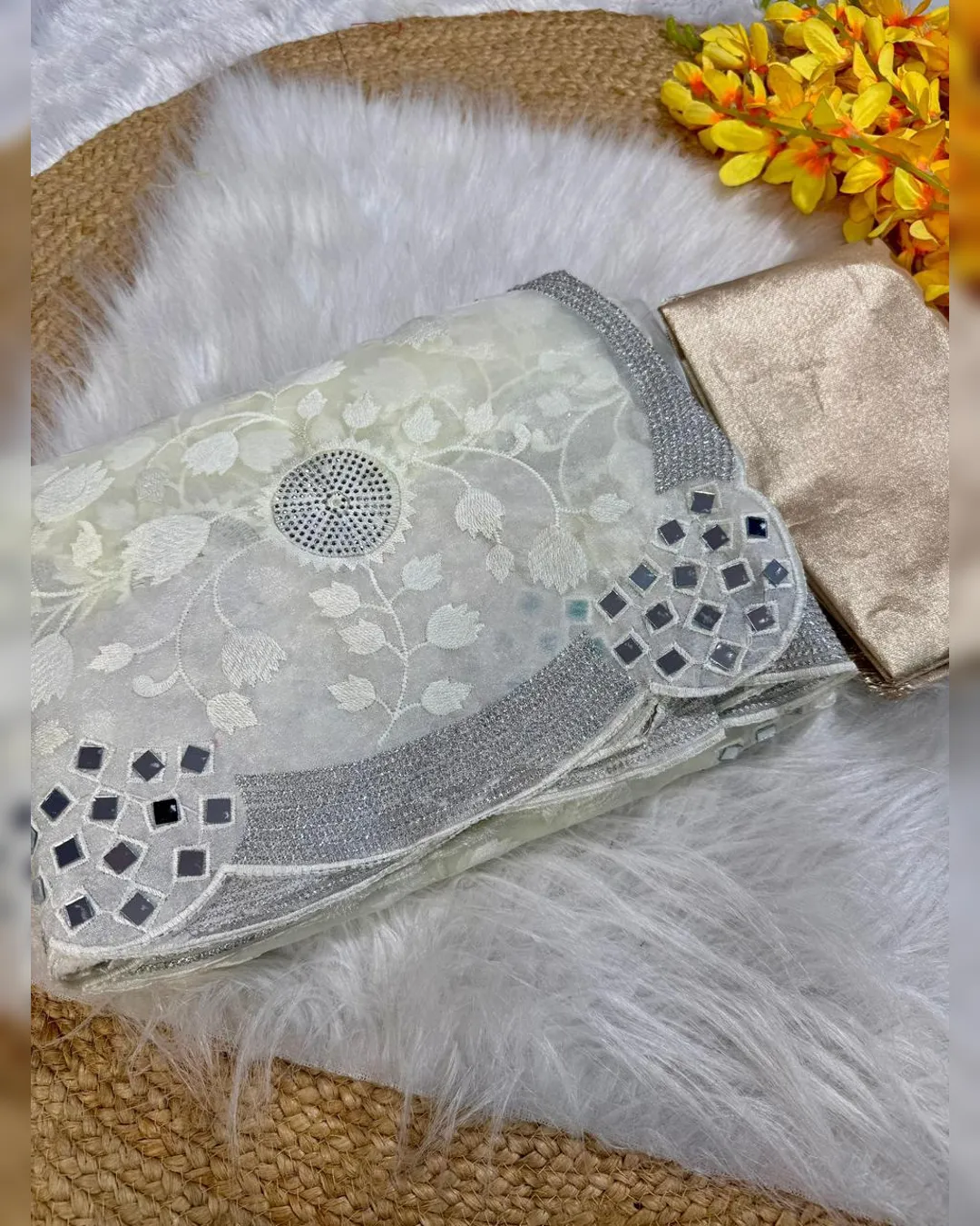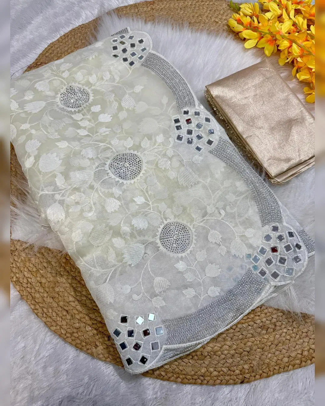 Elegant premium organza saree featuring intricate thread zaal work, sparkling Siroski embellishments, and original mirror work, beautifully finished with a silver zari border and paired with a contrasting gold silk blouse.