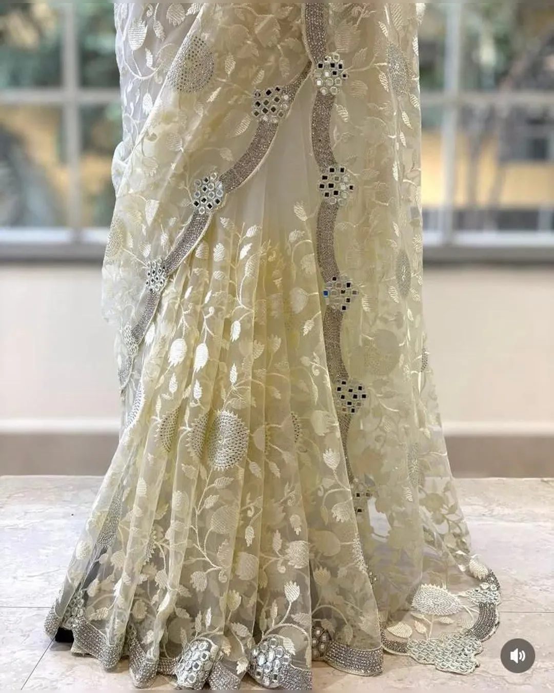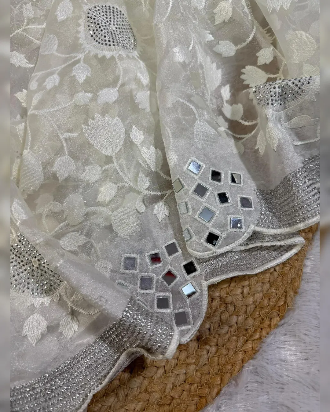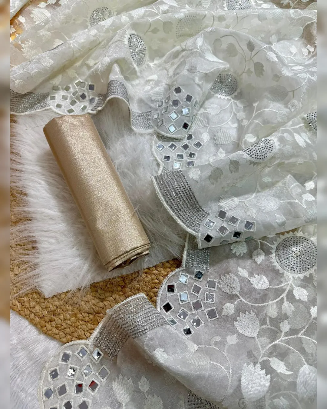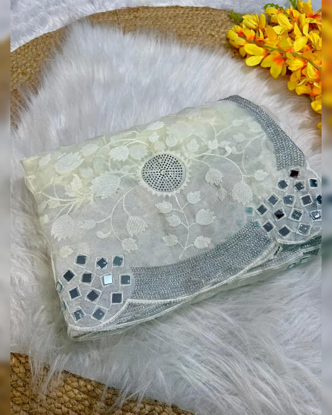 Elegant premium organza saree featuring intricate thread zaal work, sparkling Siroski embellishments, and original mirror work, beautifully finished with a silver zari border and paired with a contrasting gold silk blouse.