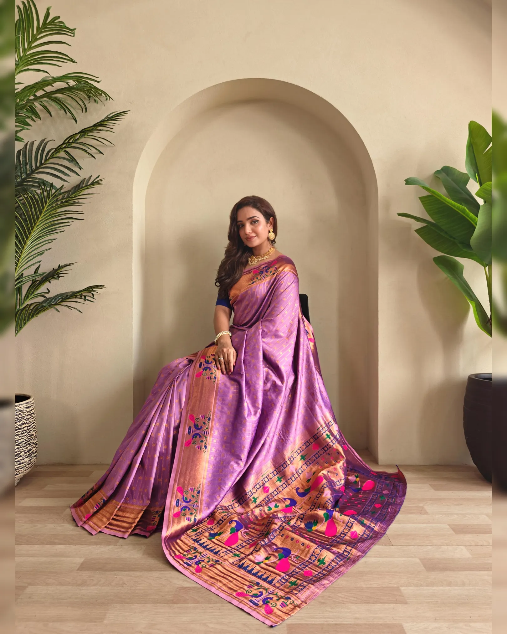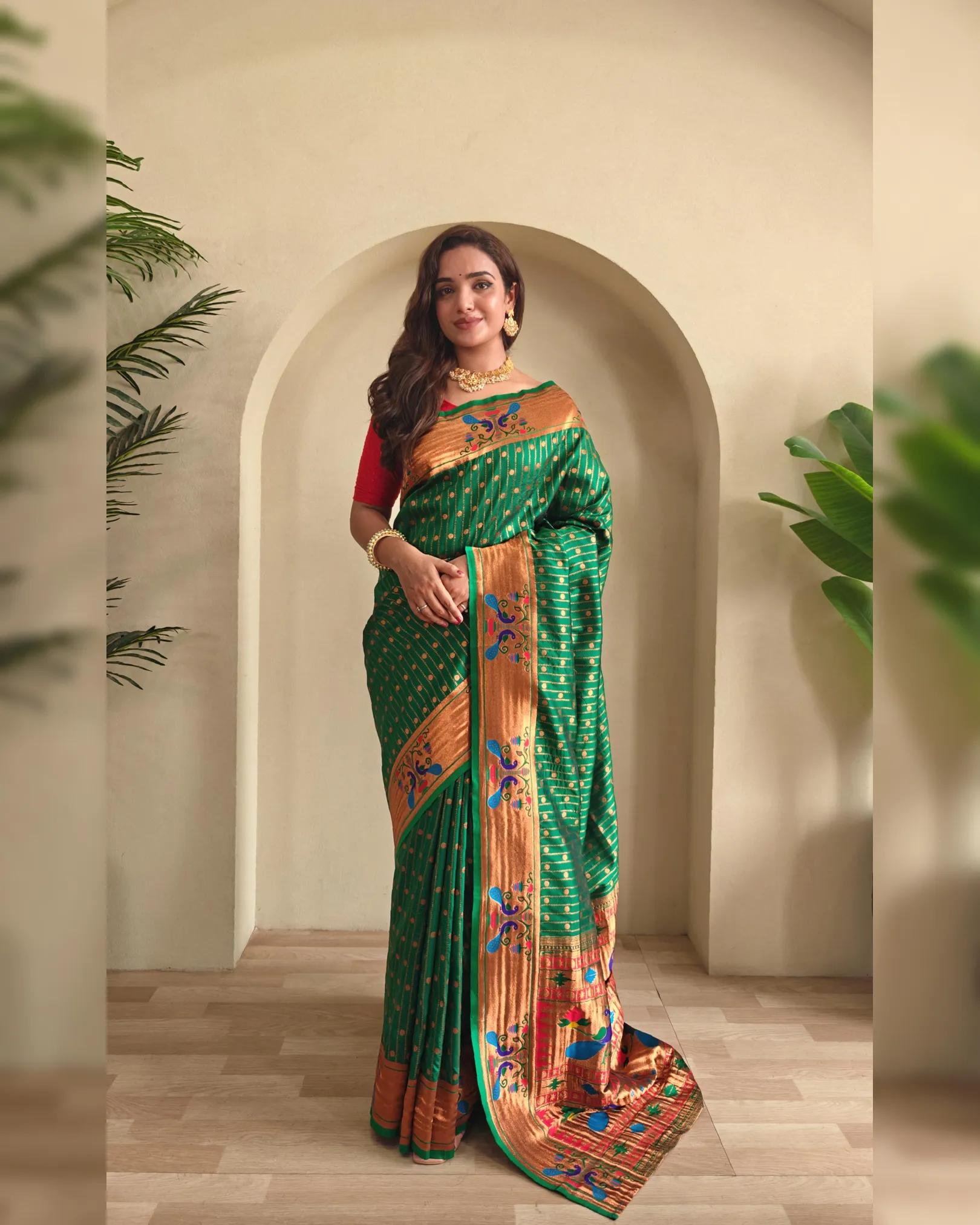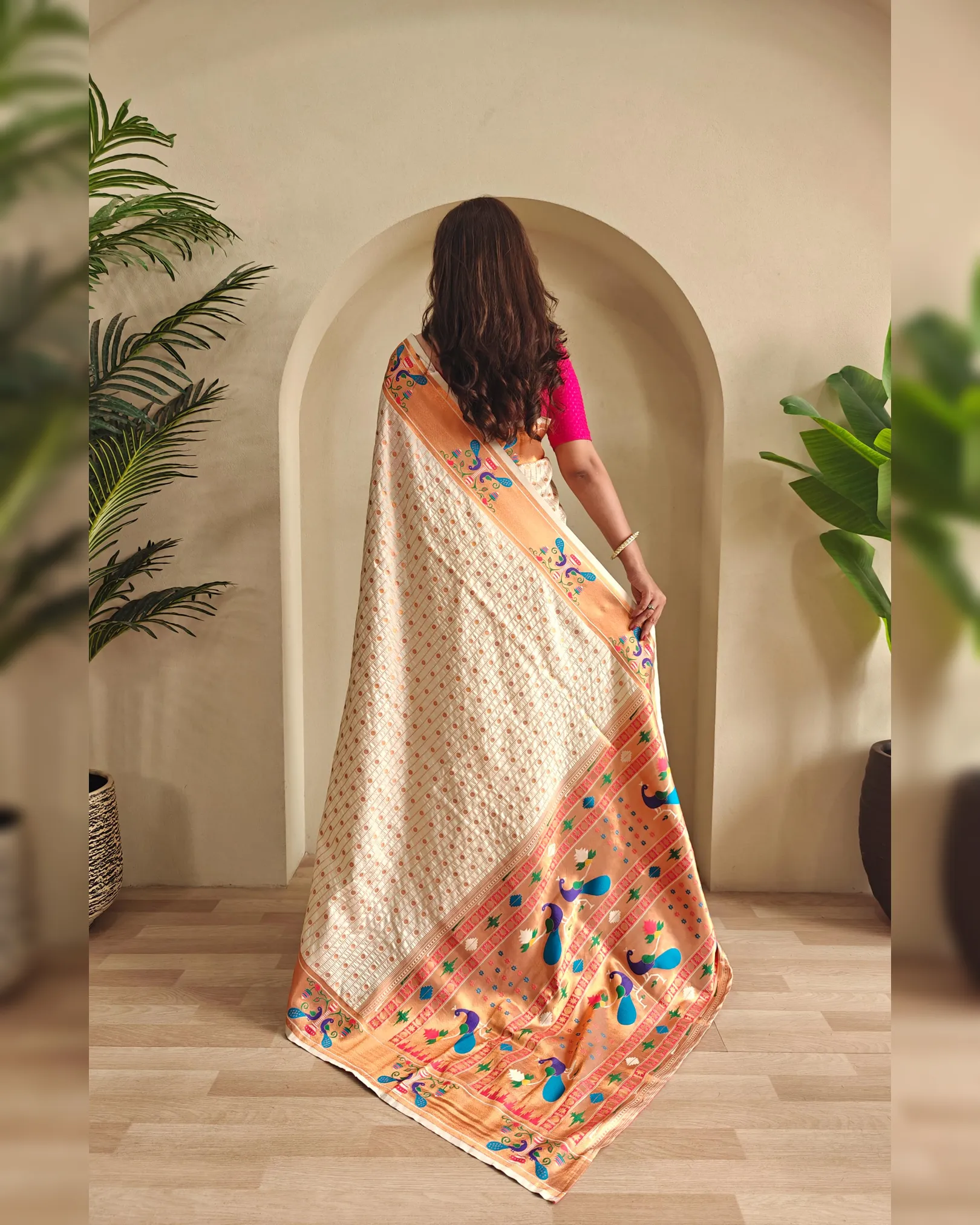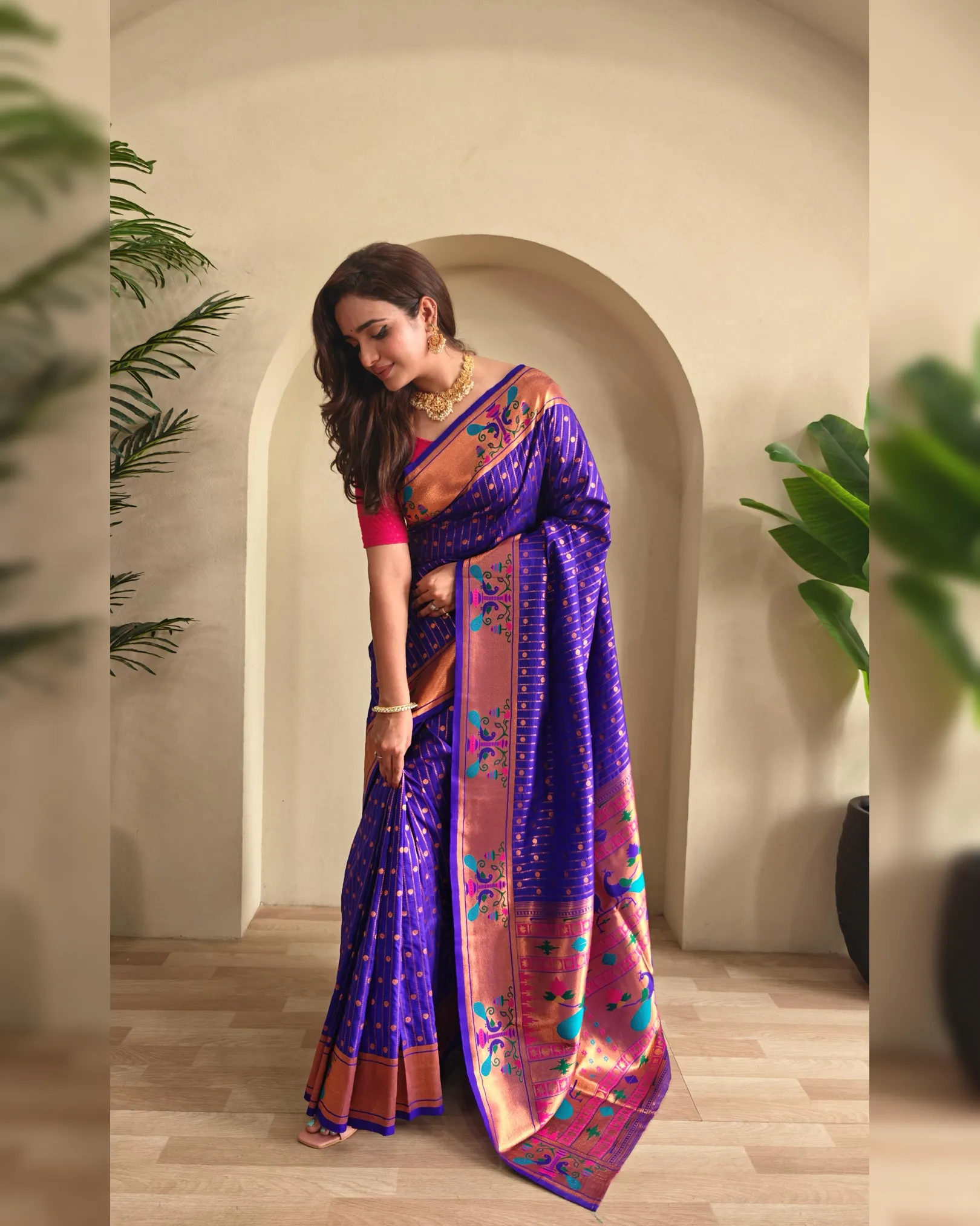 Pure soft Paithani silk saree featuring a timeless polka design with antique zari and an exquisitely rich woven Paithani pallu.