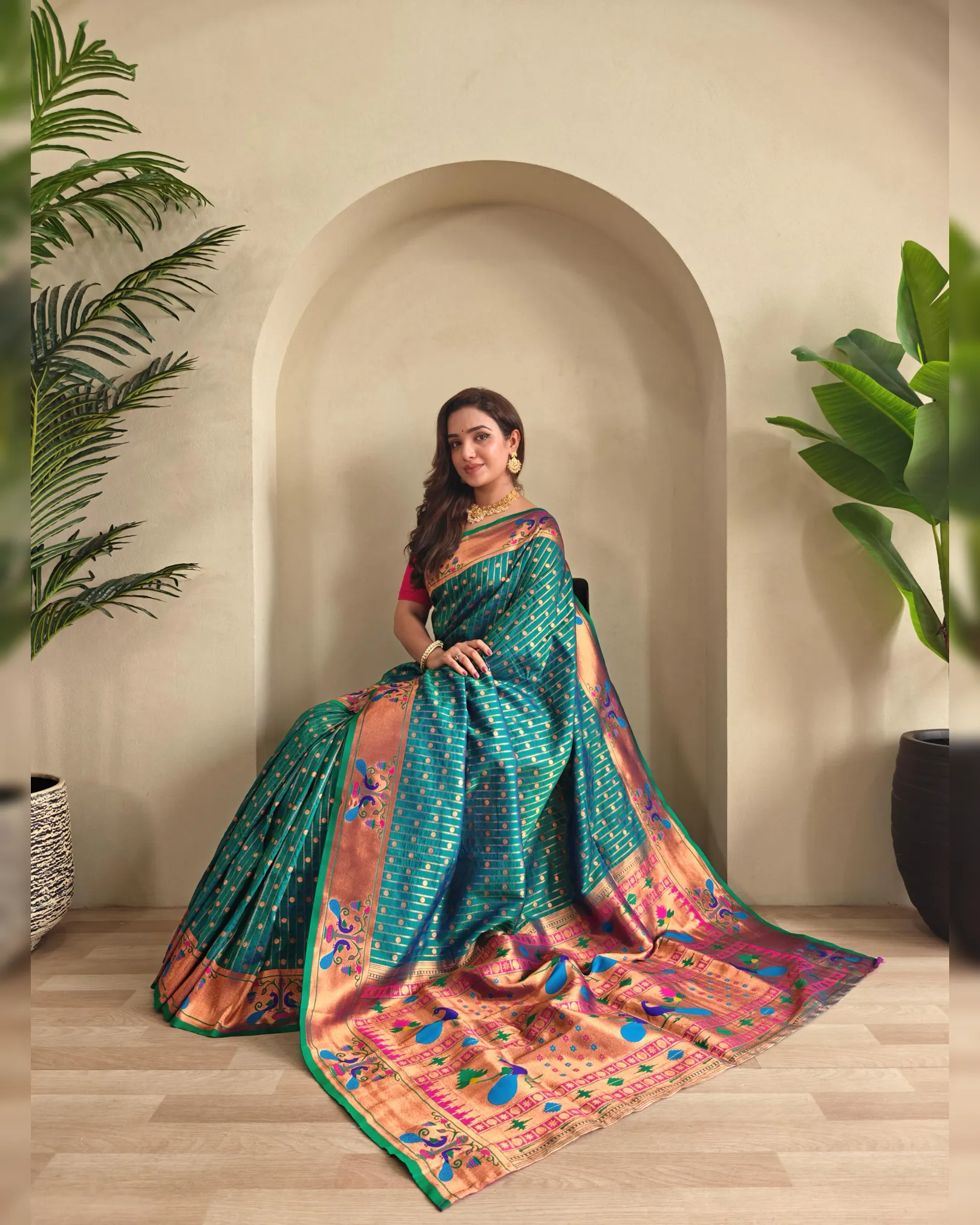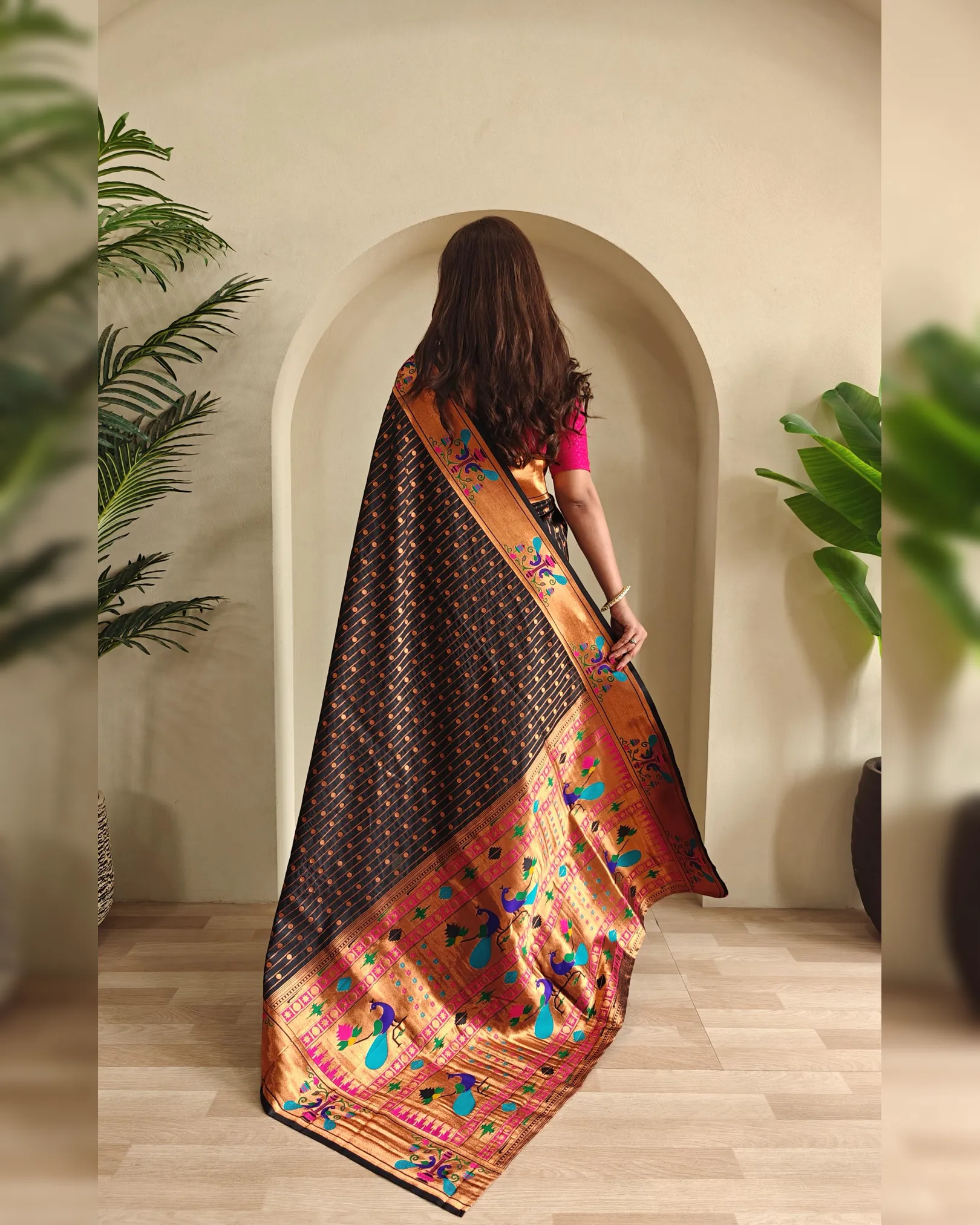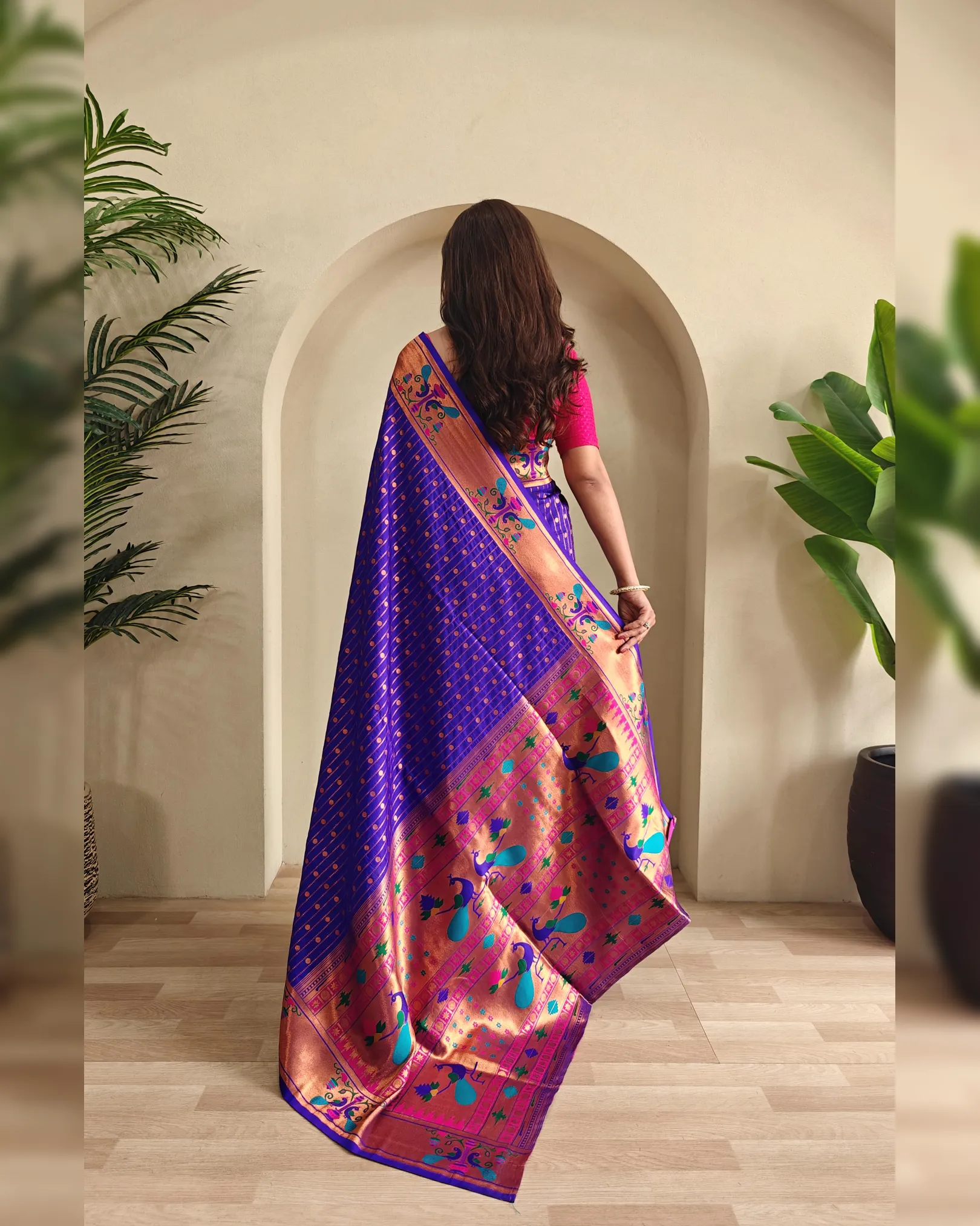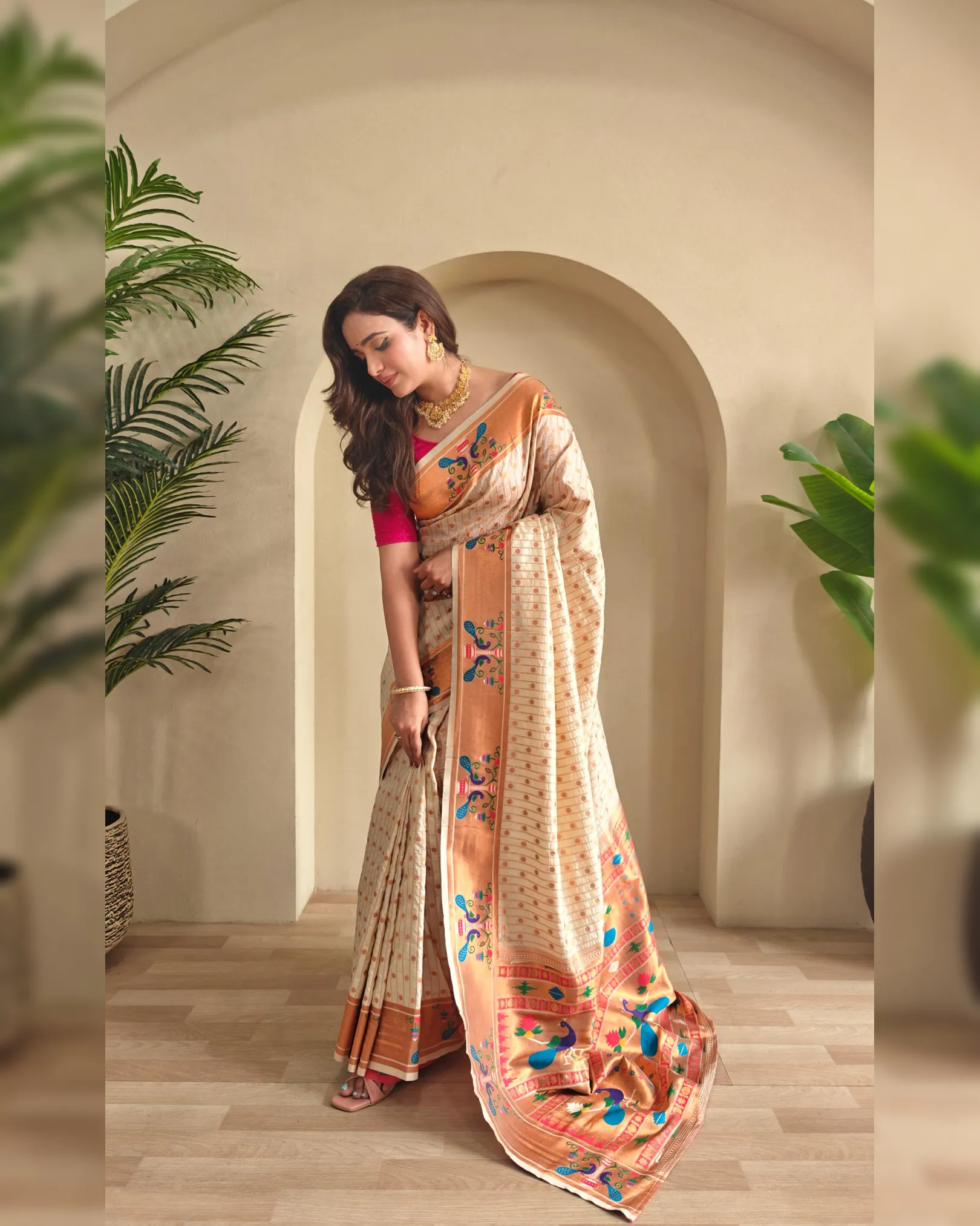 Pure soft Paithani silk saree featuring a timeless polka design with antique zari and an exquisitely rich woven Paithani pallu.