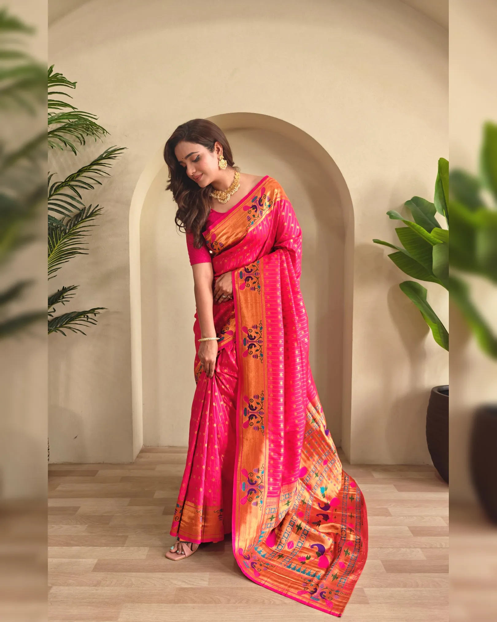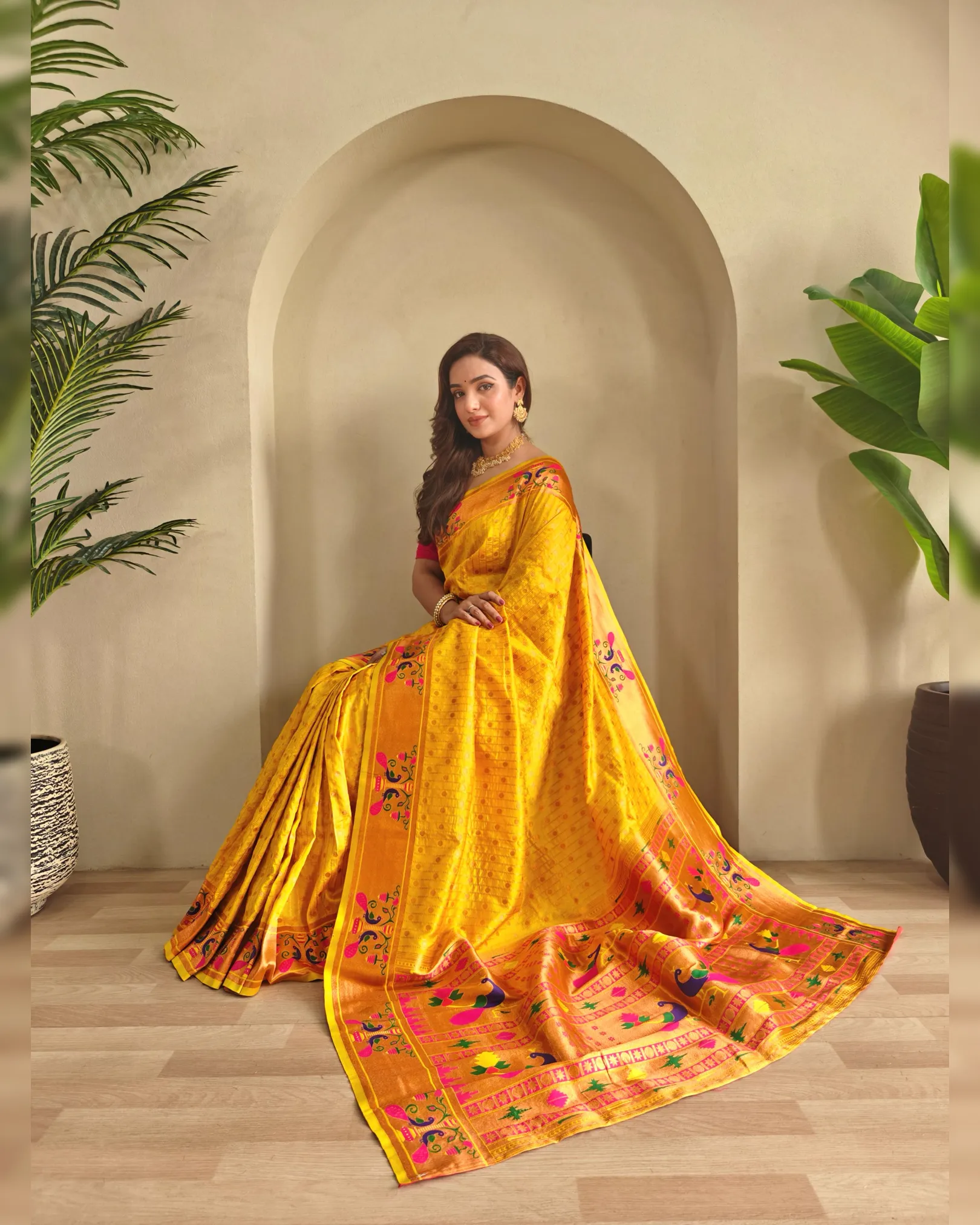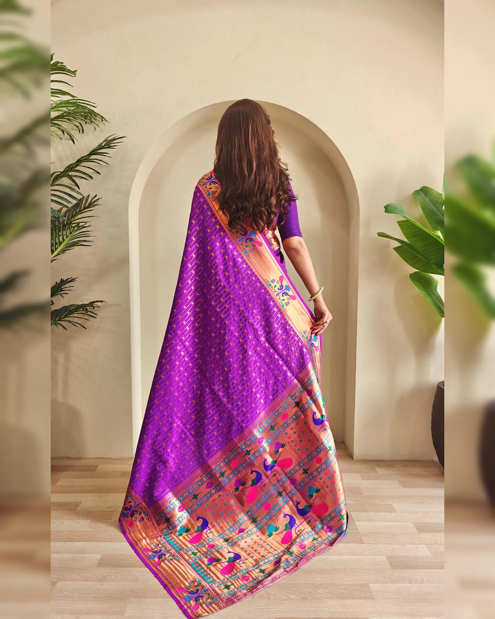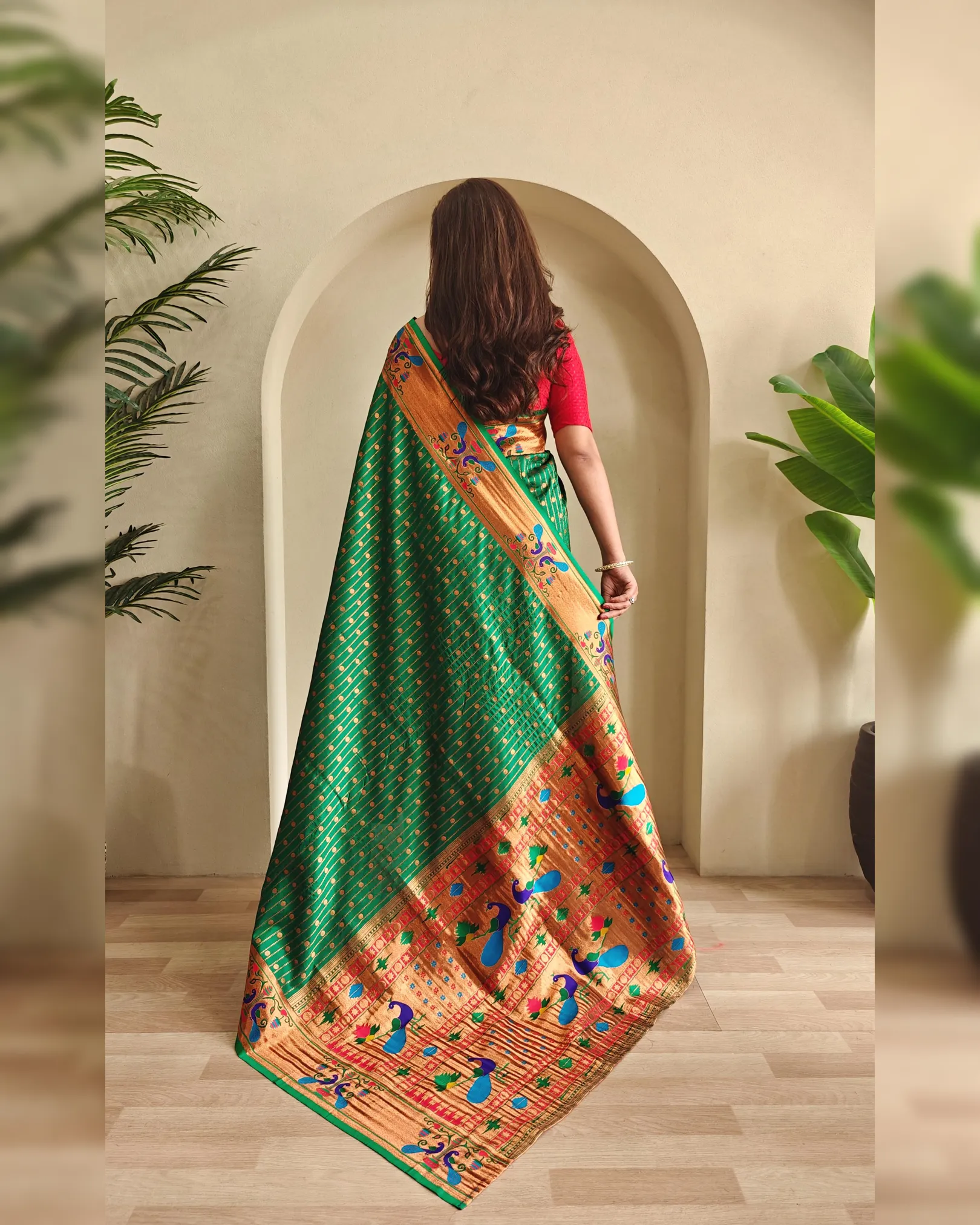 Pure soft Paithani silk saree featuring a timeless polka design with antique zari and an exquisitely rich woven Paithani pallu.
