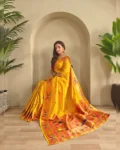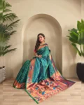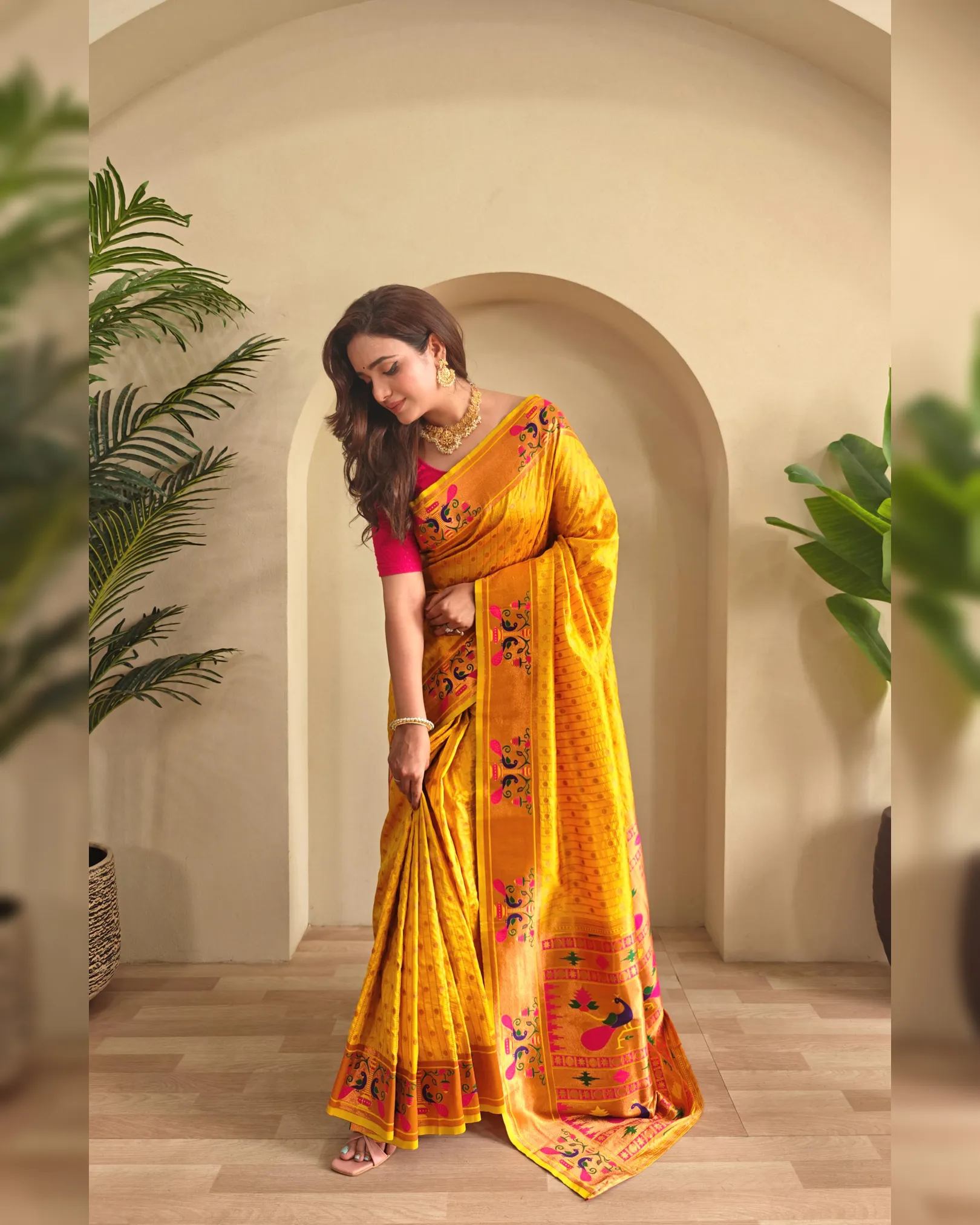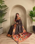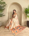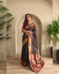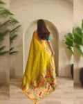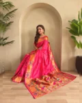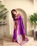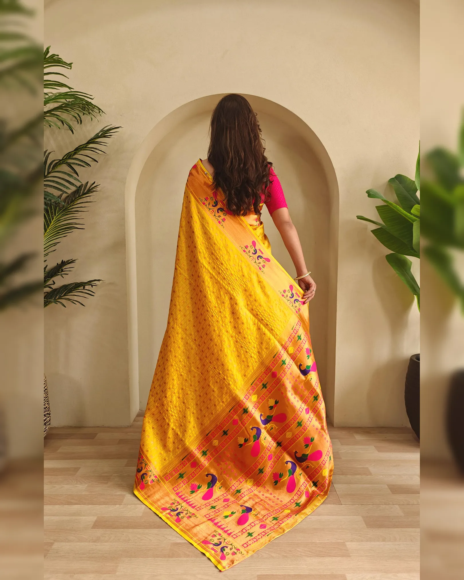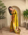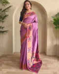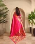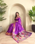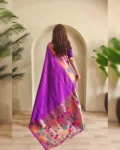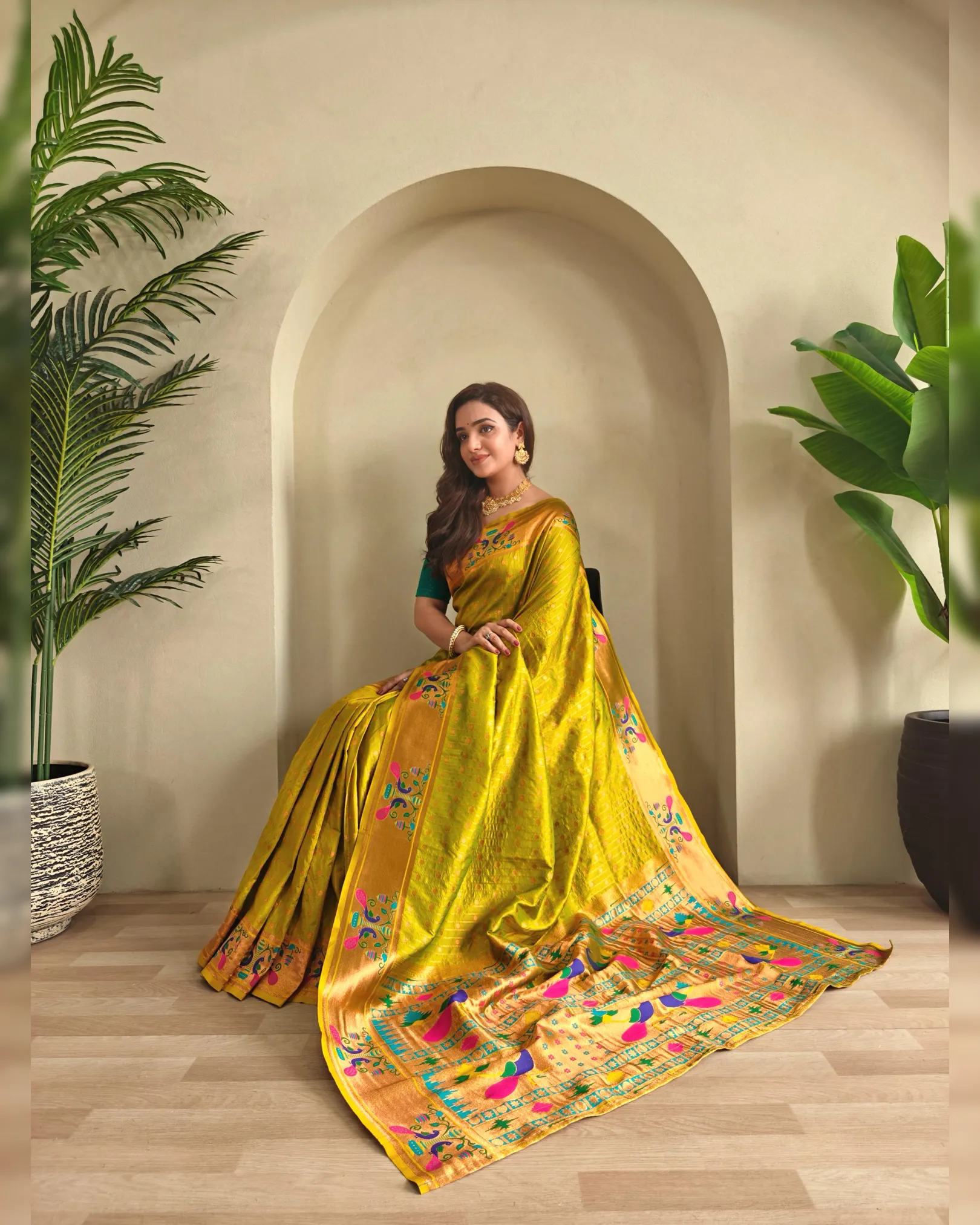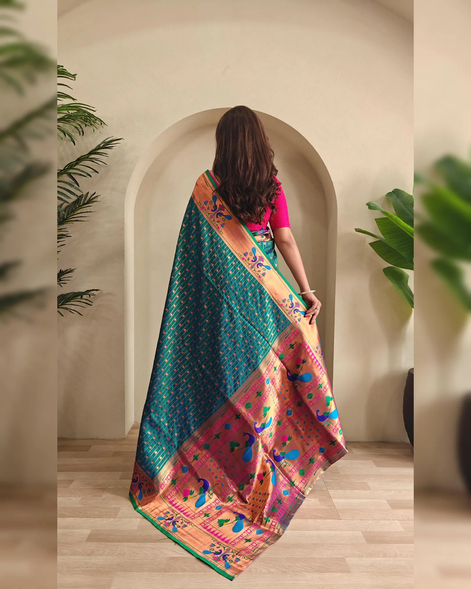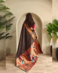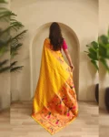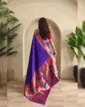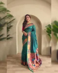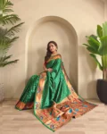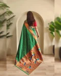 The rich weaved Paithani pallu elevates the look with heritage artistry, making it perfect for weddings, festivals, and special occasions. Its luxurious drape and classic appeal ensure you make a statement with every step.