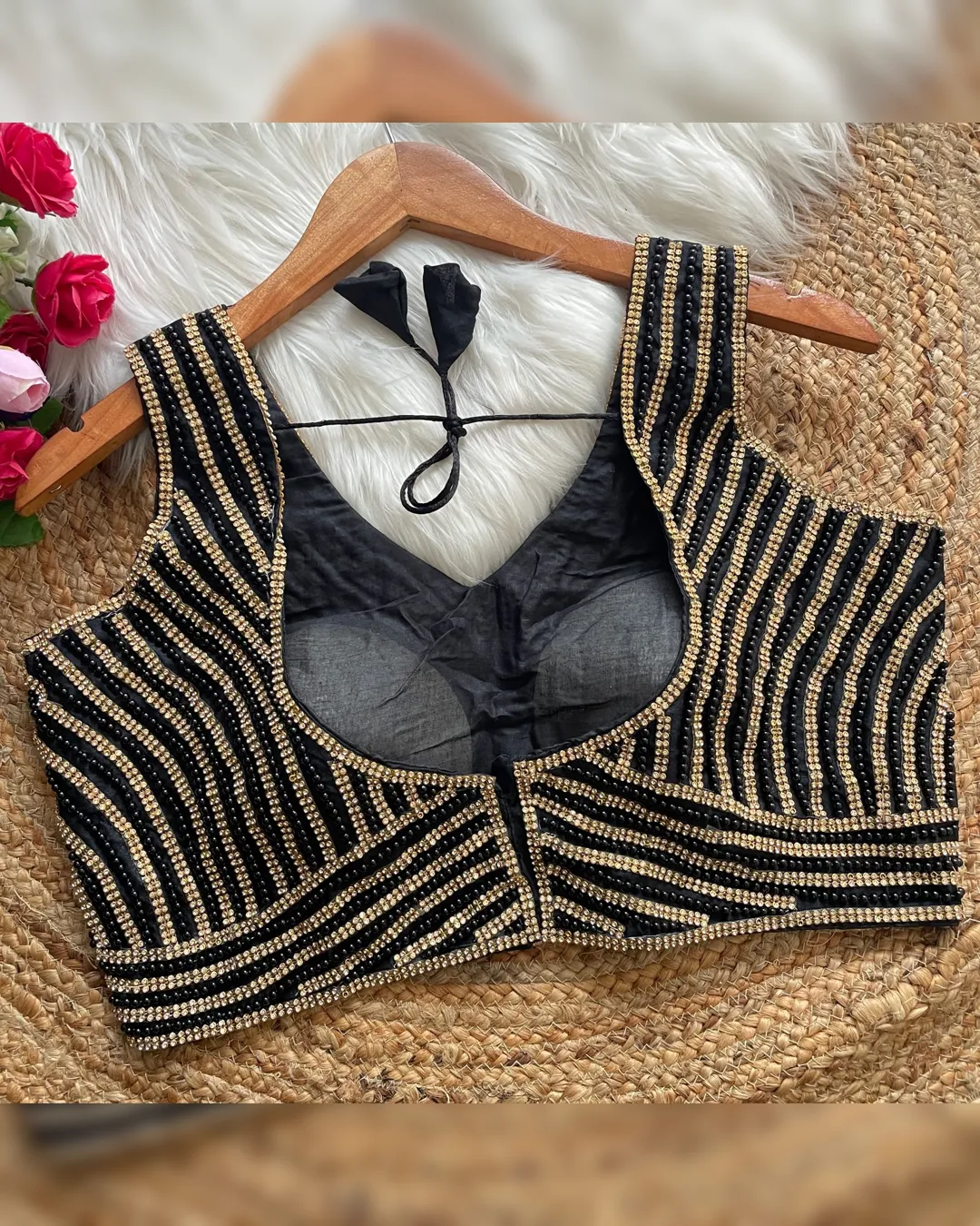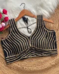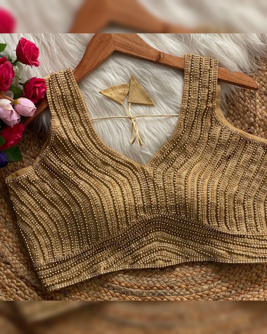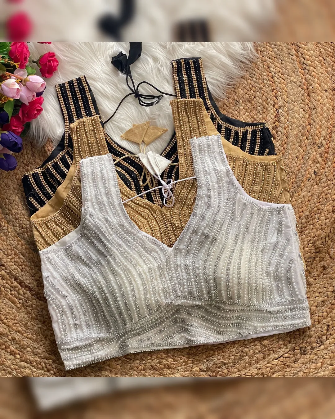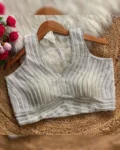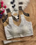 Elevate your ethnic look with our New Beautiful Pearl Moti Spaghetti Blouse, designed for both traditional charm and modern elegance. Crafted from pure silk with heavy pearl and moti embellishments, this padded blouse offers a luxurious fit and exquisite detailing. The sleeveless spaghetti style adds a contemporary twist, while the back-open design ensures a graceful silhouette. Perfect for pairing with sarees or lehengas for weddings, parties, and festive occasions.